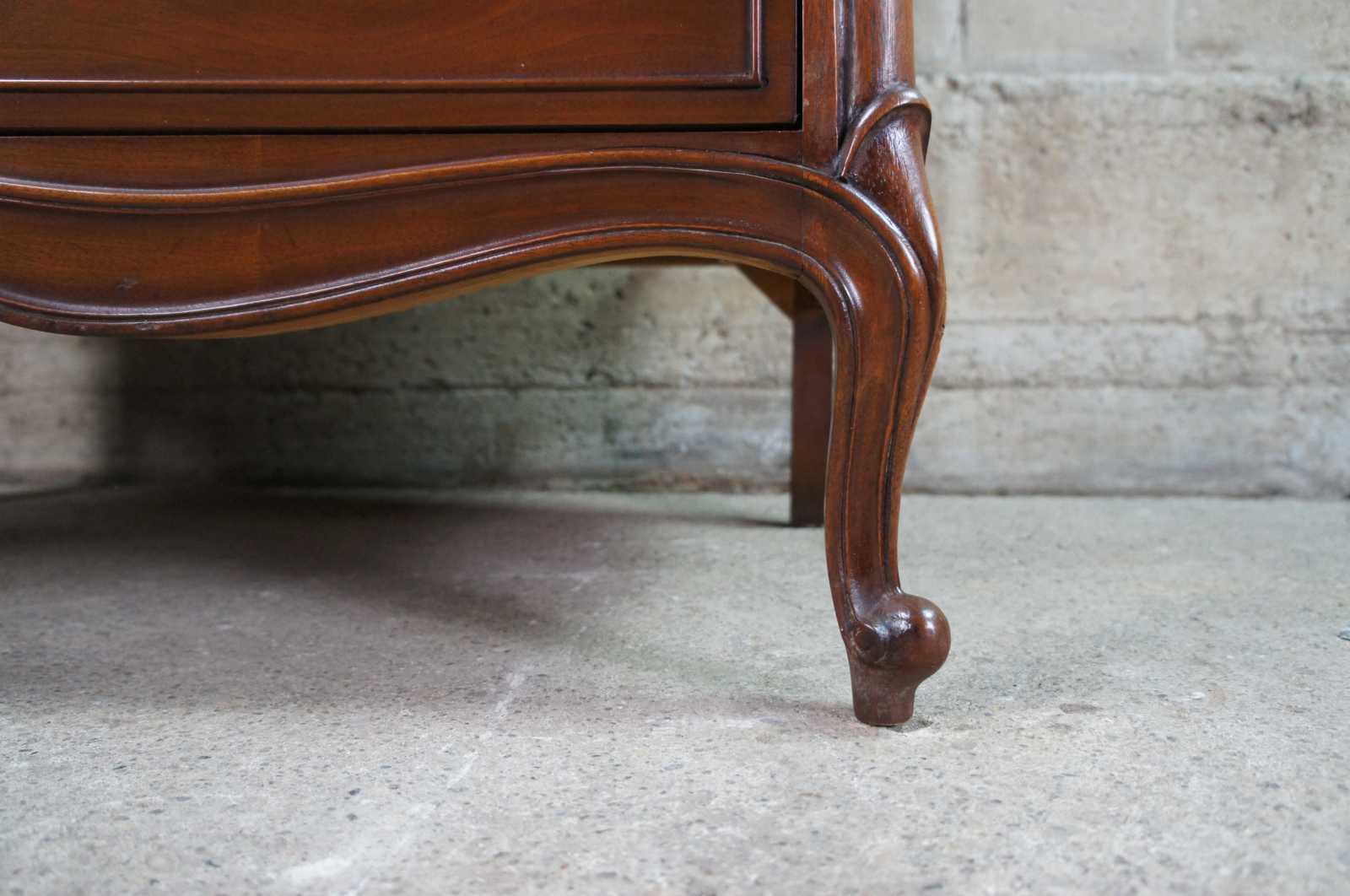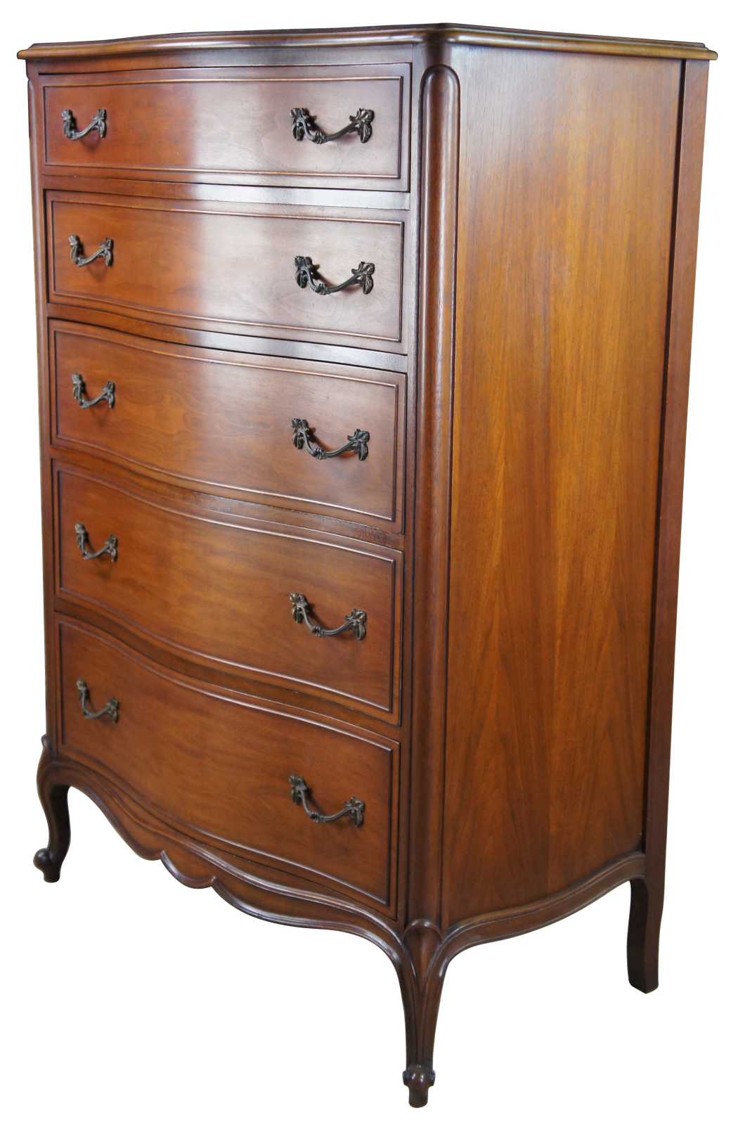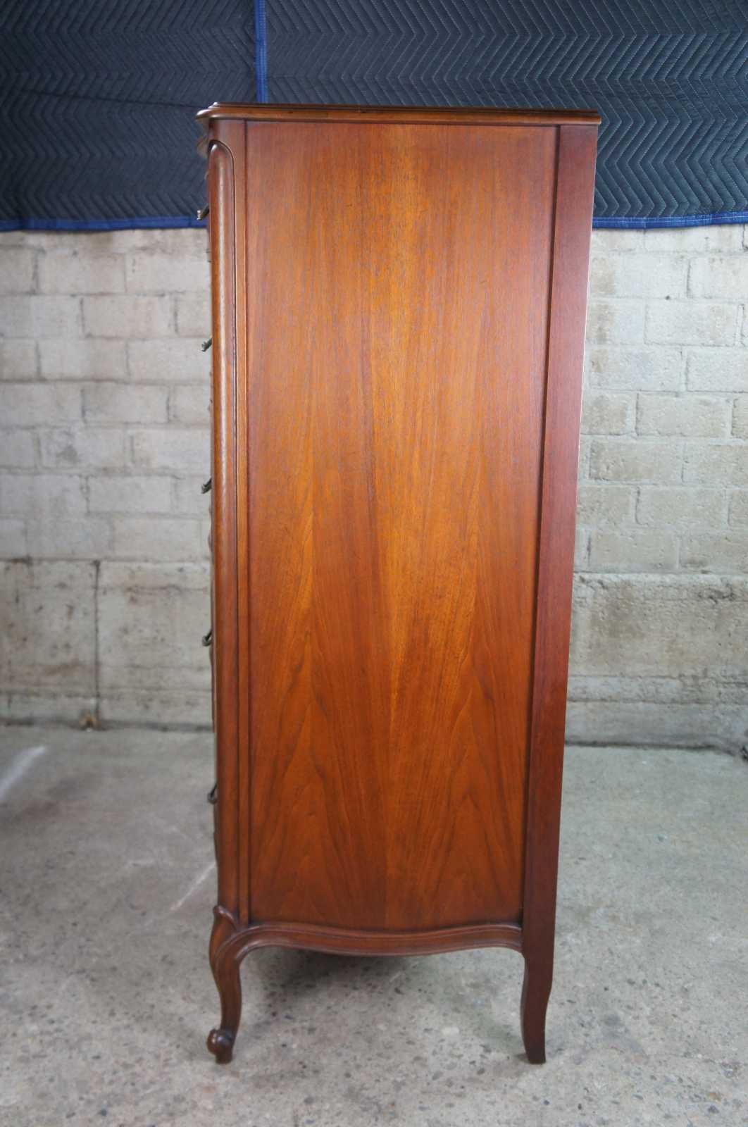 French Provincial Walnut tallboy dresser or chest by Drexel Furniture, circa 1966. Made from walnut with bordeux finish. Features a serpentine form of five drawers and cabriole legs with scrolled feet. 206-410.