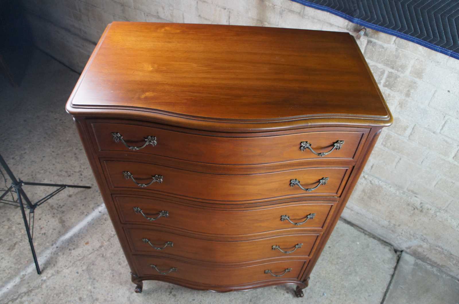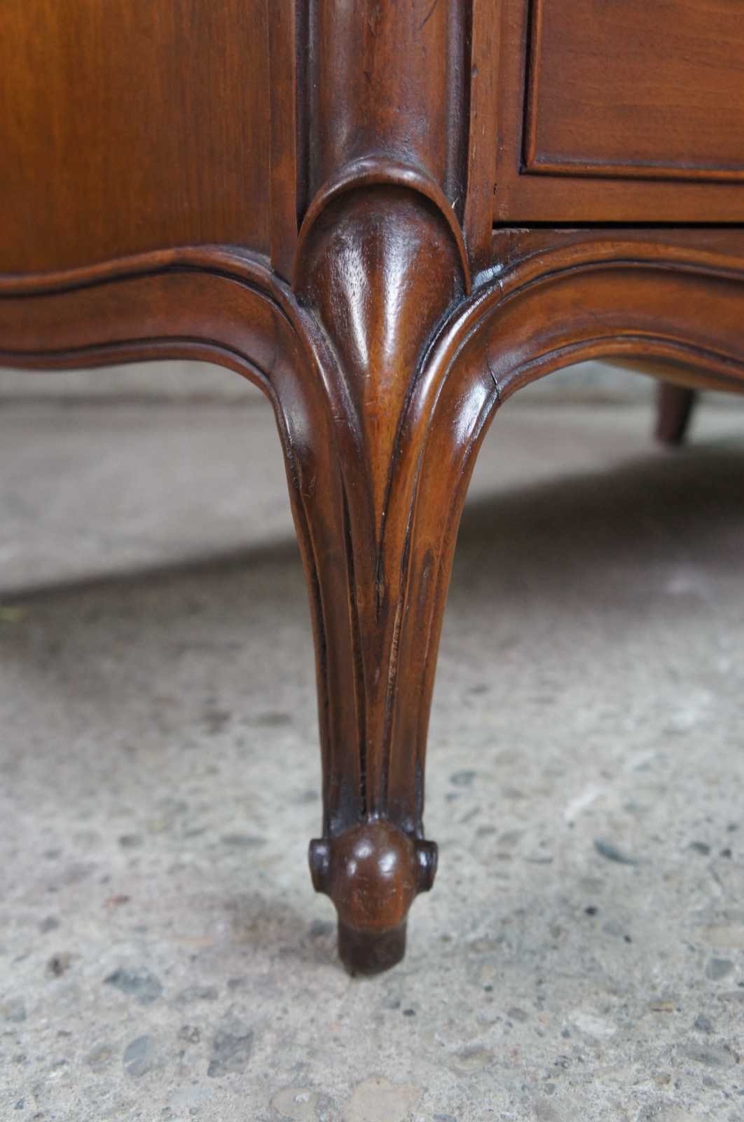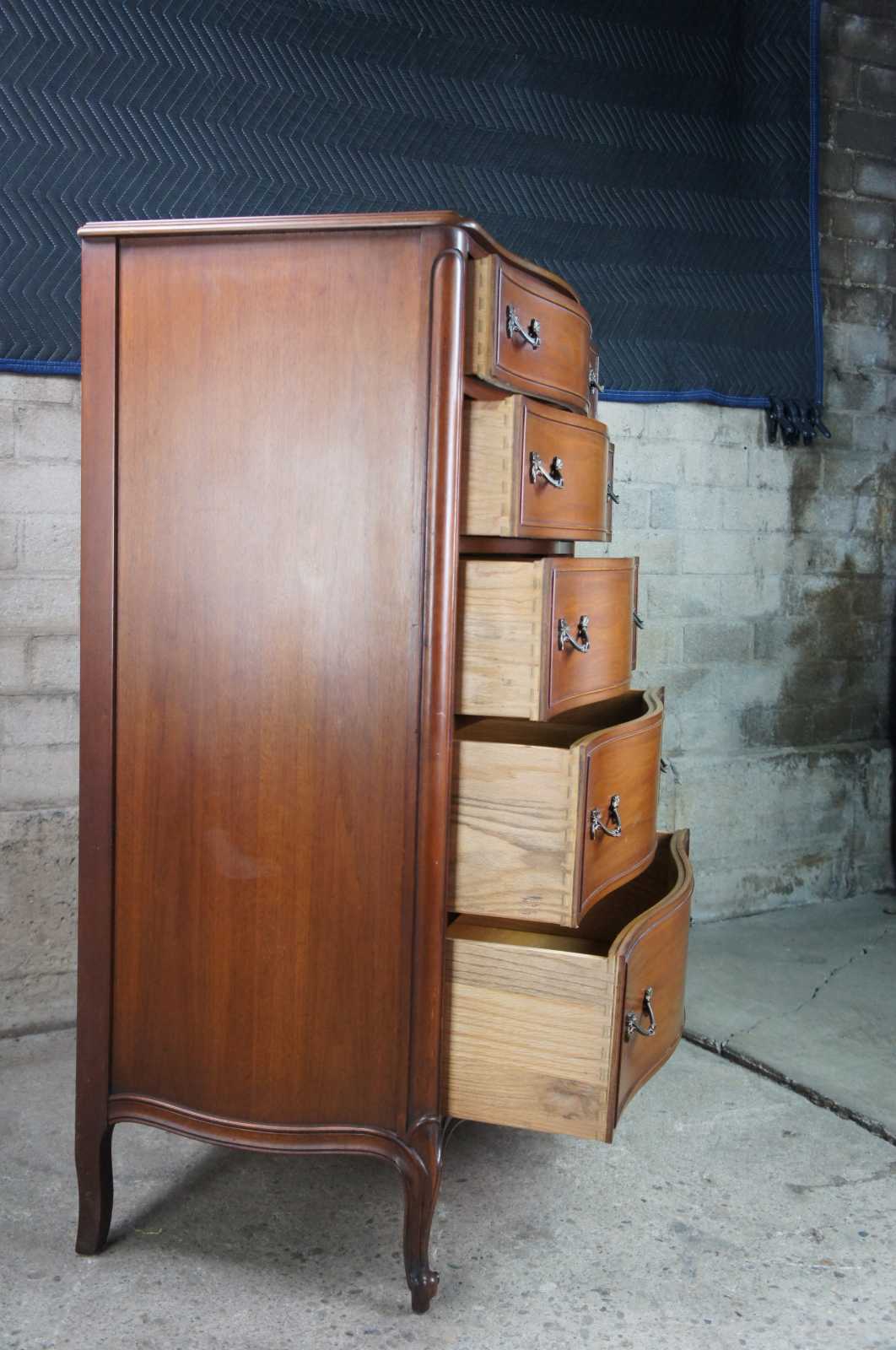 French Provincial Walnut tallboy dresser or chest by Drexel Furniture, circa 1966. Made from walnut with bordeux finish. Features a serpentine form of five drawers and cabriole legs with scrolled feet. 206-410.