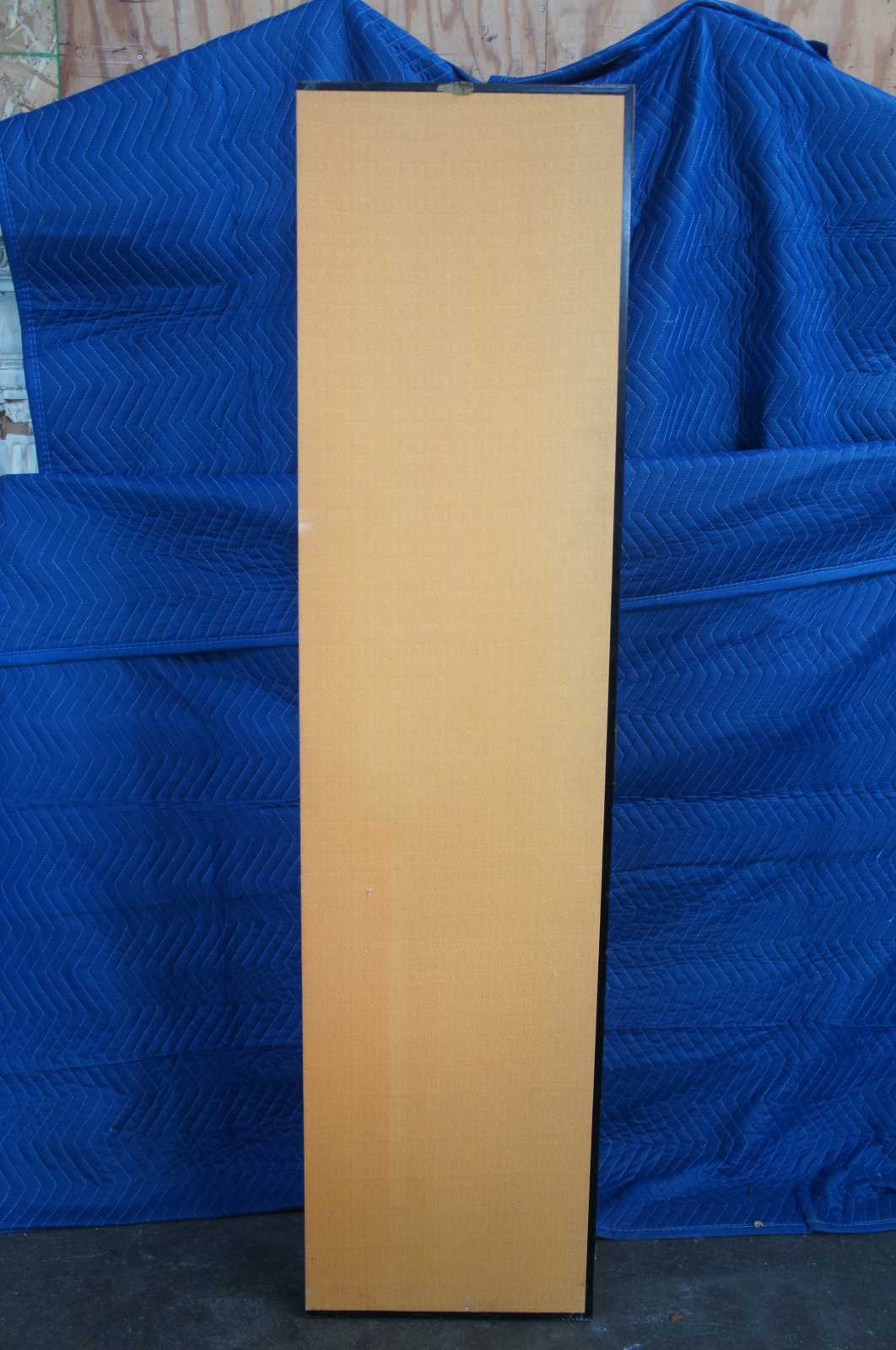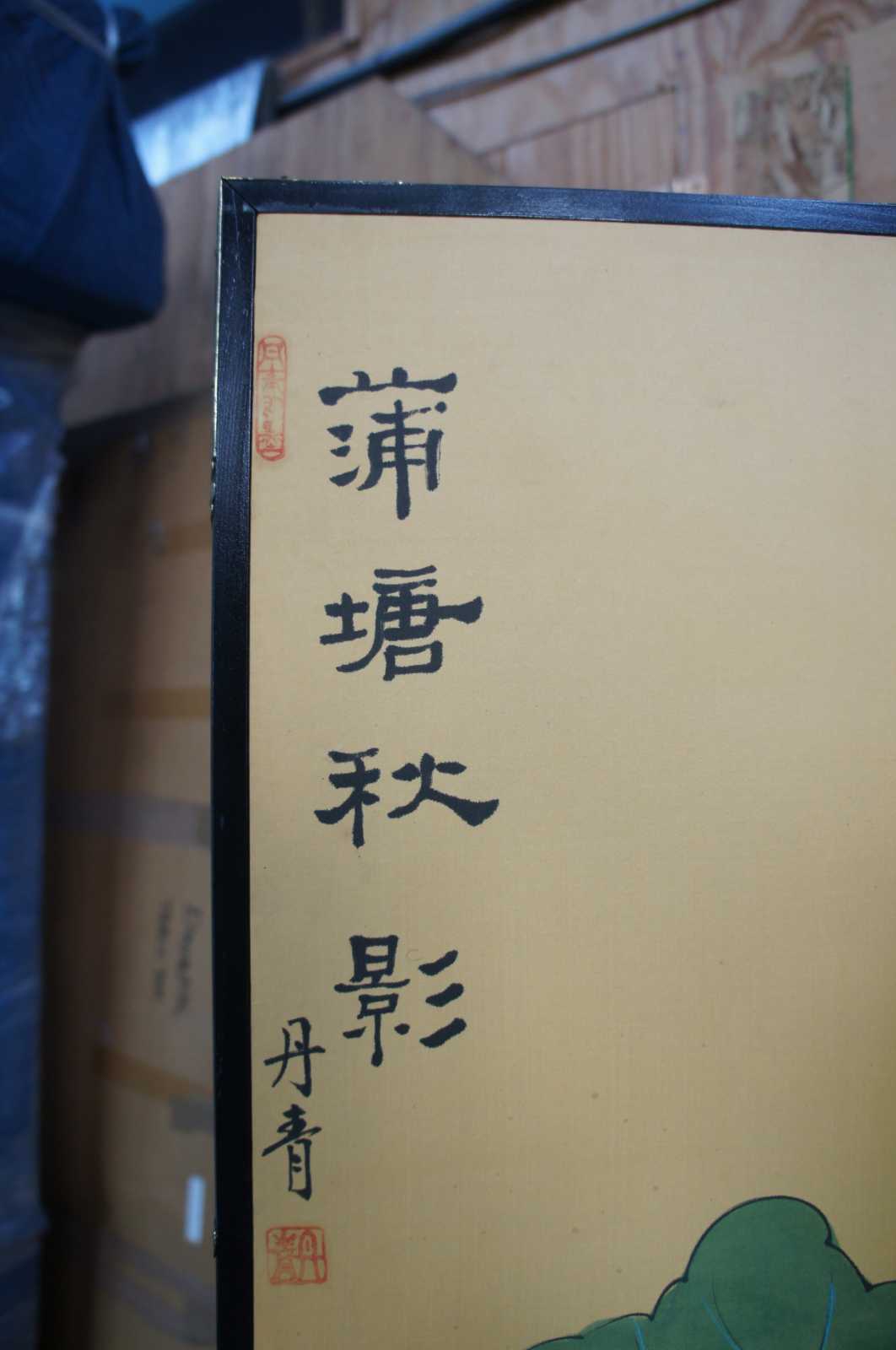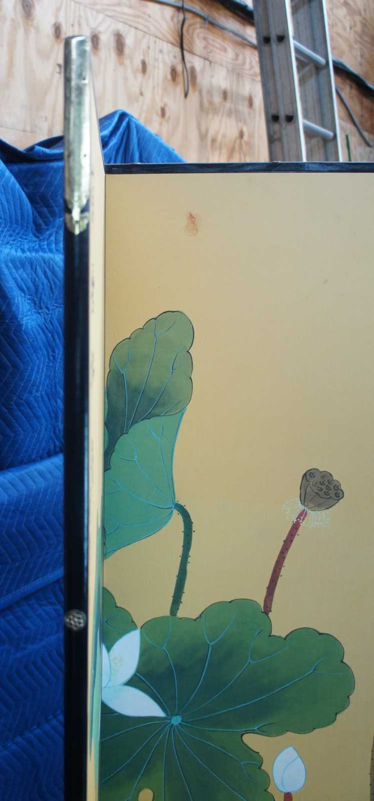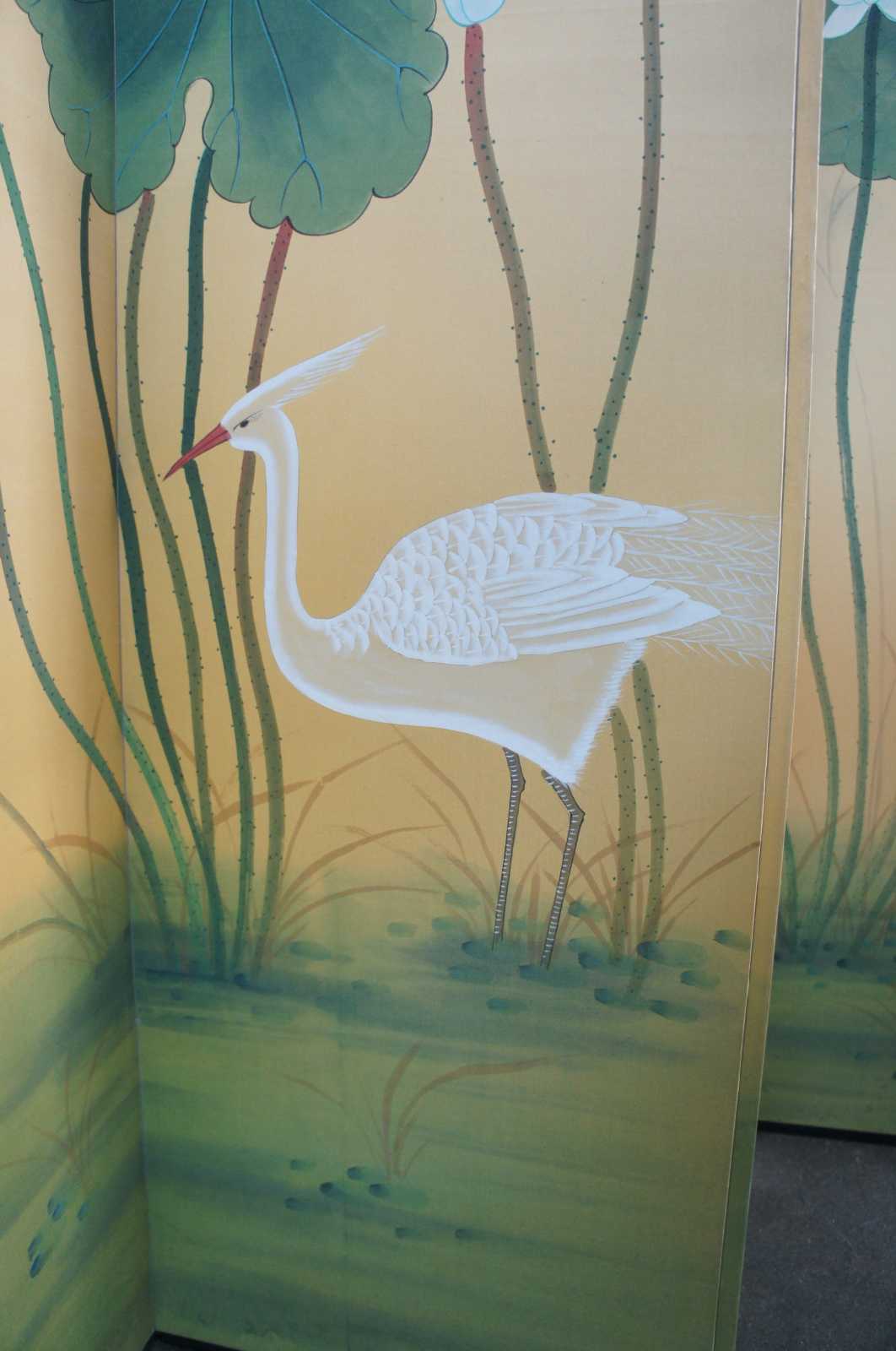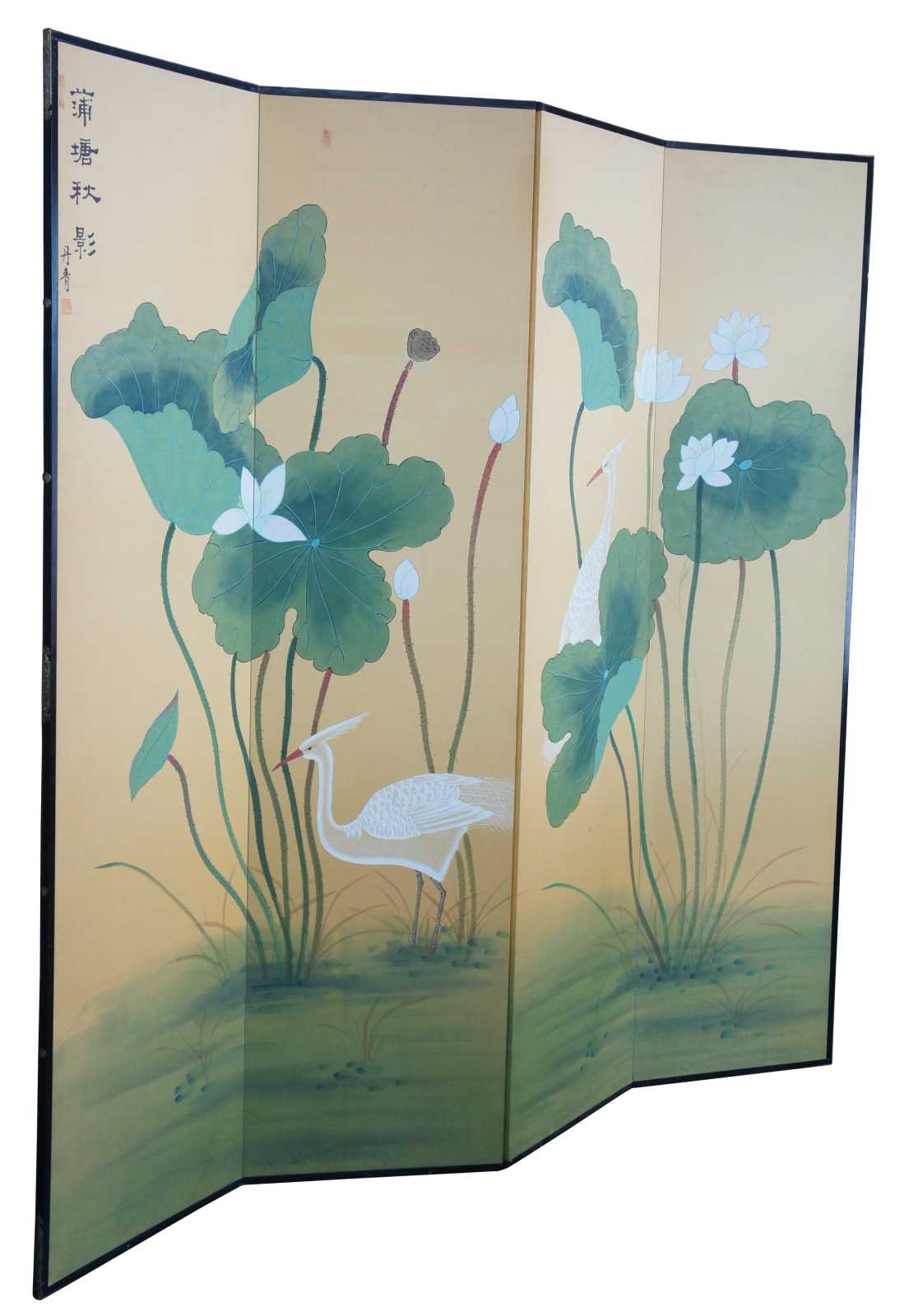 Mid 20th century Chinese four panel Byobu screen. Made of silk featuring hand painted detail of herons or cranes hunting in the water lilies. Each lily stands tall, and the birds have a fierce concentration on the water below. Signed upper left, black lacquered frame with brass accents.
