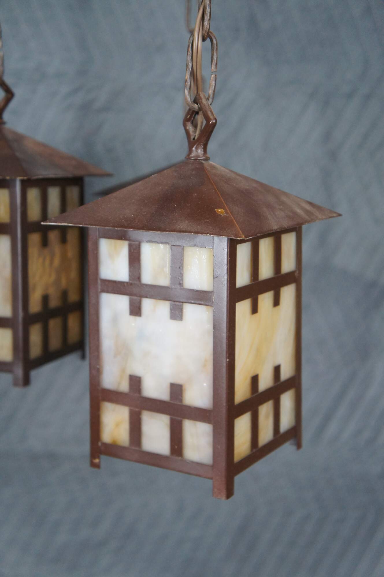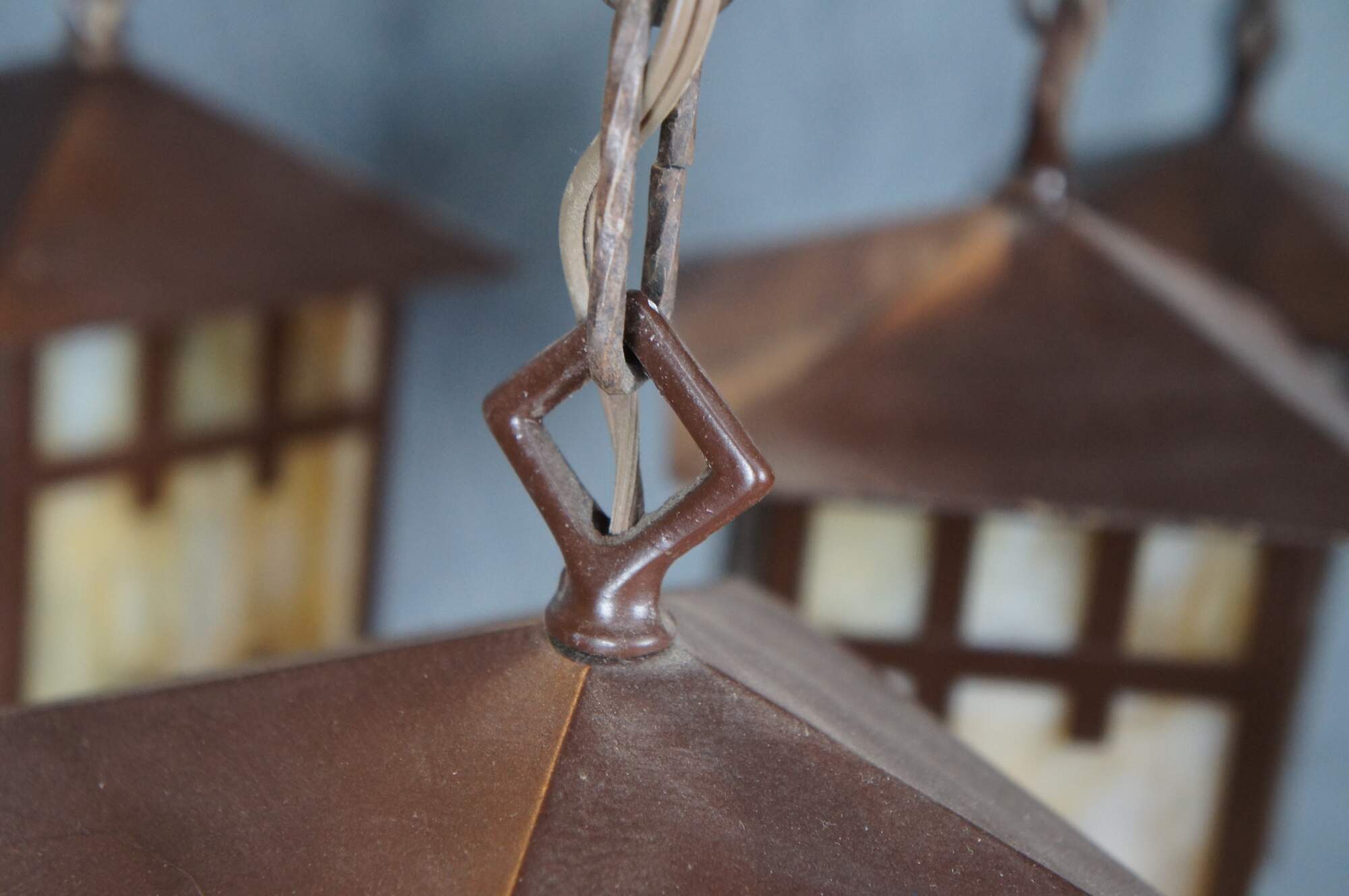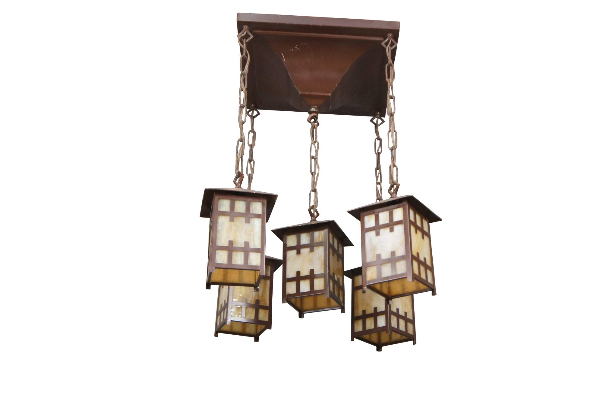 A beautiful Mission style chandelier designed in the manner of the originals built by Stickley in the early 1900s. Features a central ceiling mount made from metal with 5 chains leading to caged lanterns with lattice design and slag glass coverings. A warm addition to any space.