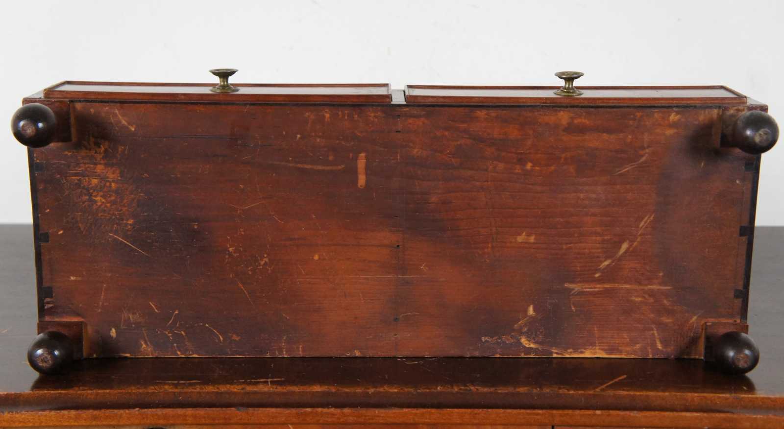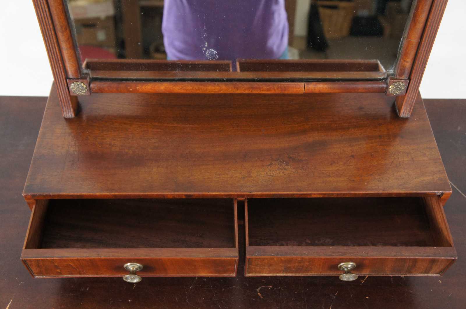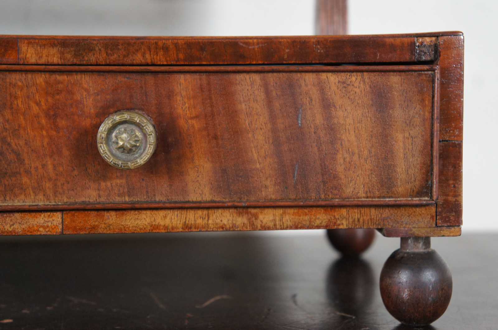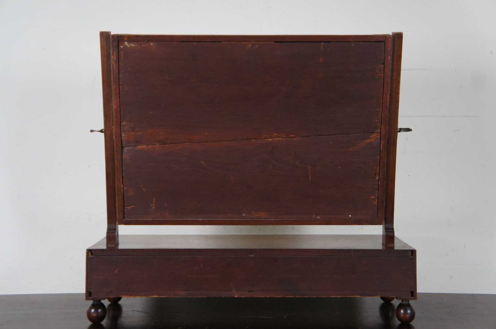 An exquisite Sheraton Period shaving stand. A rectangular form made from mahogany with two drawers over ball feet and swivel top mirror. Includes hand dovetailing, ornate brass hardware and flame mahogany front.