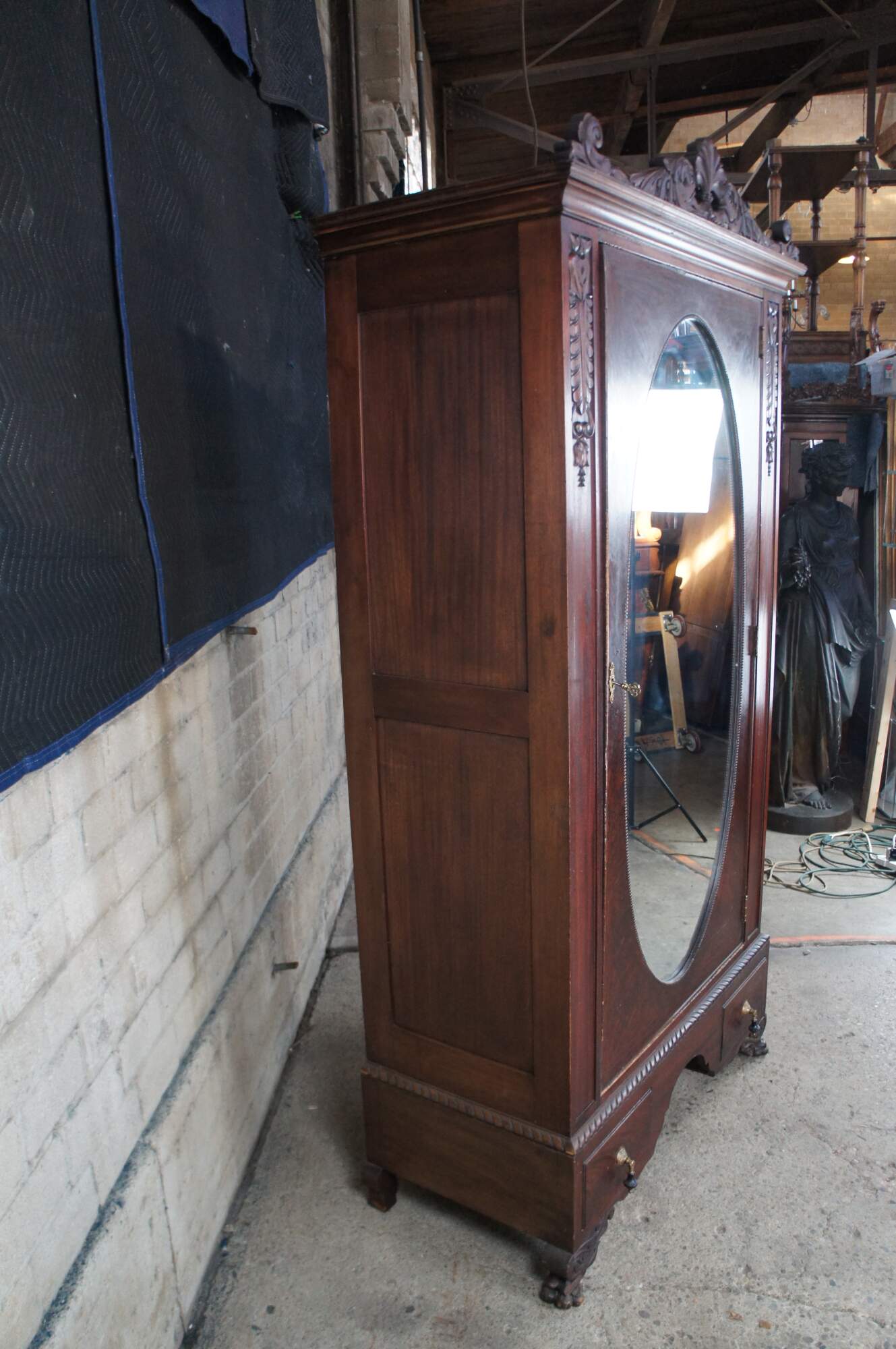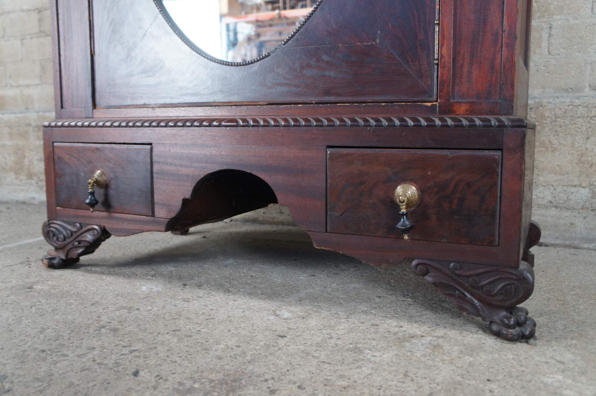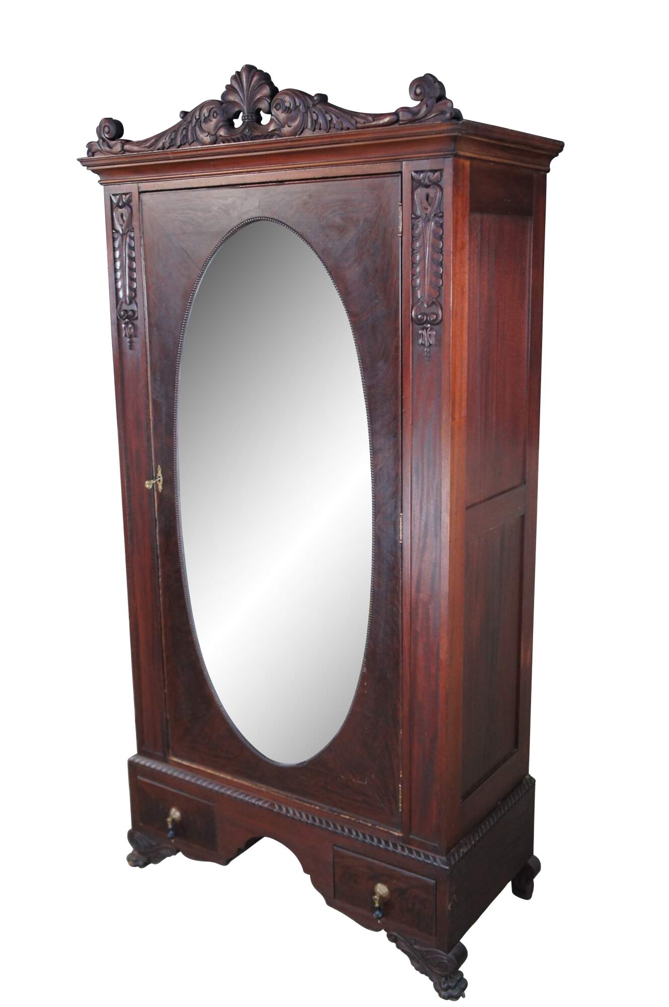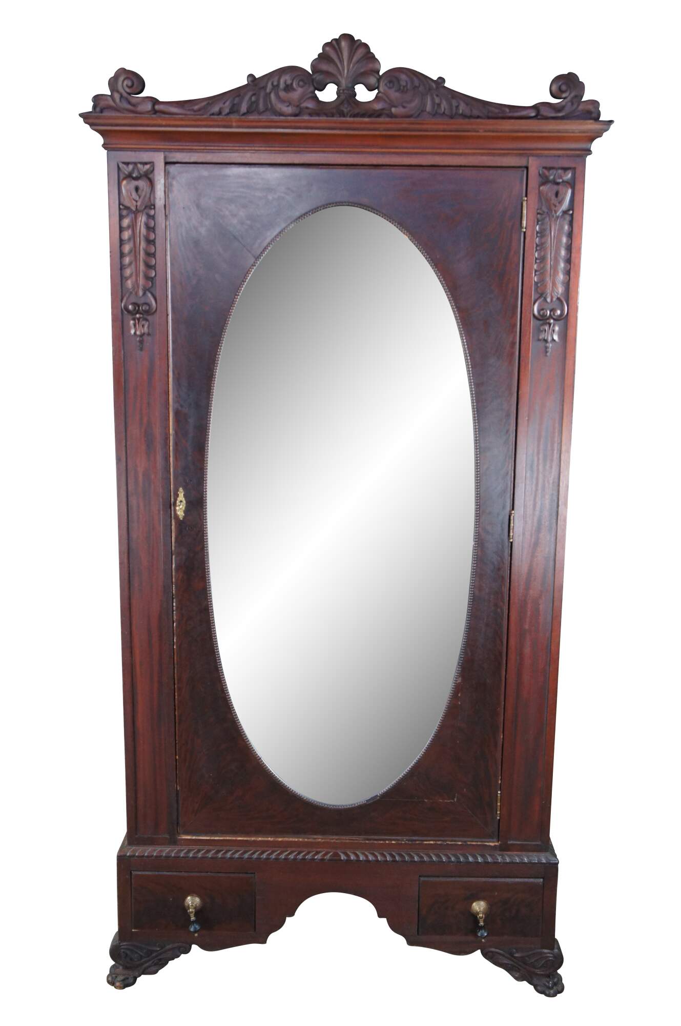An exceptional early 20th century armoire. Features a rectangular frame made from mahogany with figural and acanthus carved accents. The central door features a large oval mirror that opens to space for hanging garments. The base features an apron of gadrooned accents over two dovetailed drawers with a flame mahogany front and knocker pulls. The cabinet is supported by scrolled paw feet.
