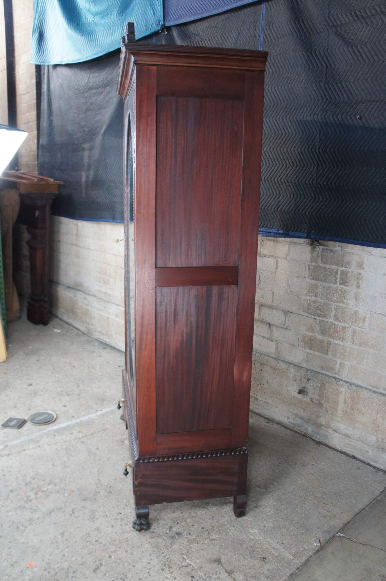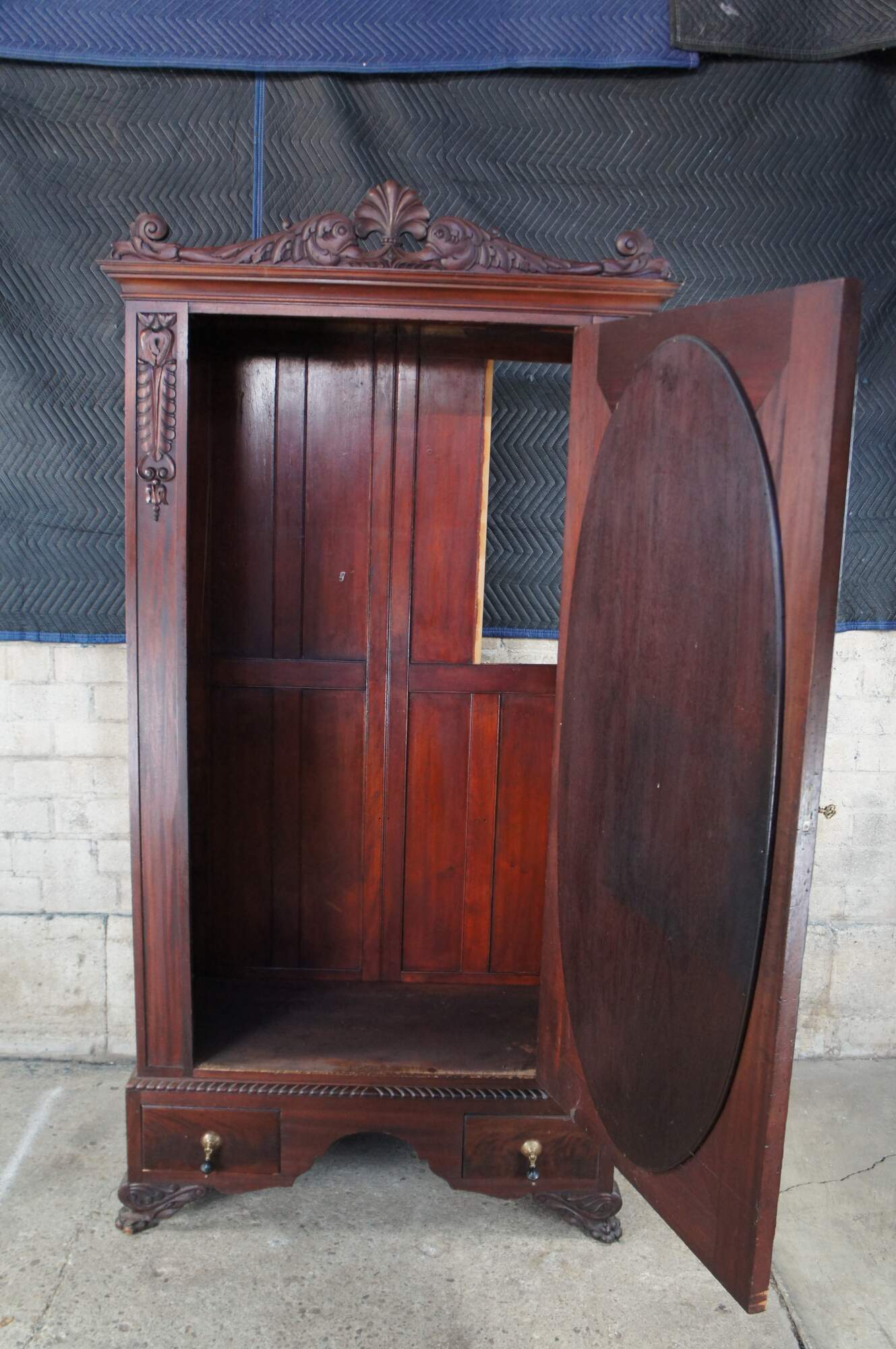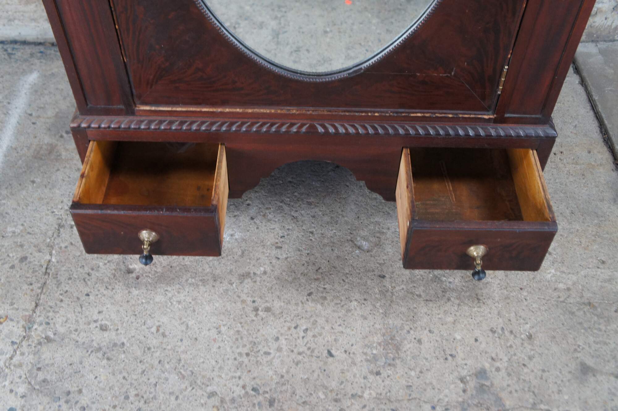 An exceptional early 20th century armoire. Features a rectangular frame made from mahogany with figural and acanthus carved accents. The central door features a large oval mirror that opens to space for hanging garments. The base features an apron of gadrooned accents over two dovetailed drawers with a flame mahogany front and knocker pulls. The cabinet is supported by scrolled paw feet.