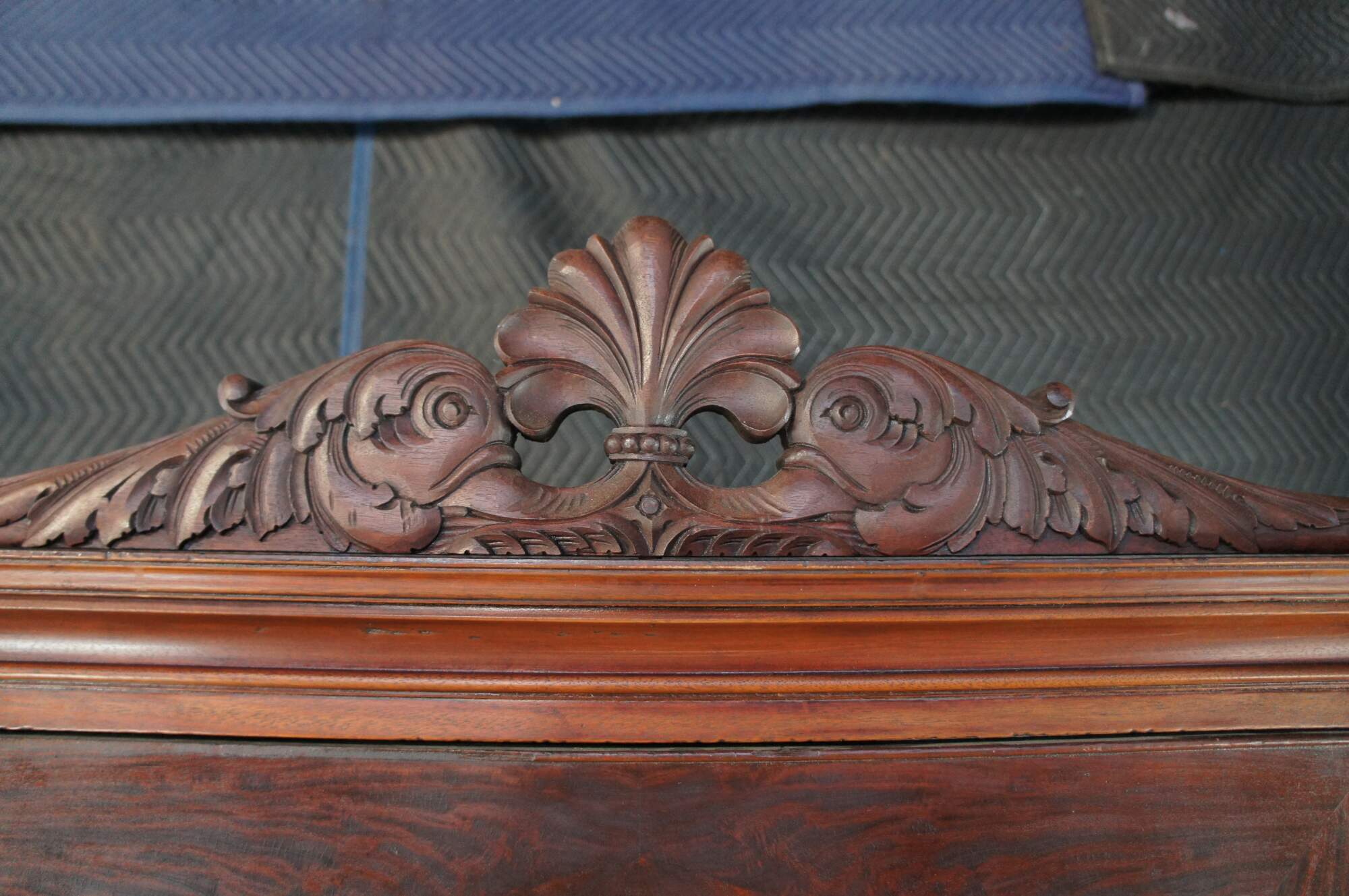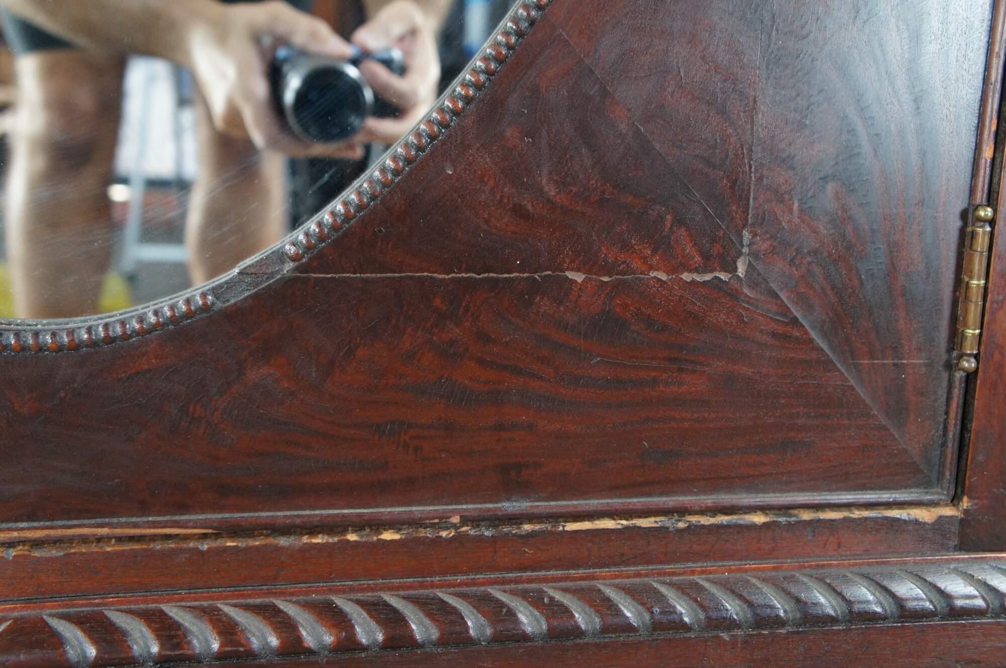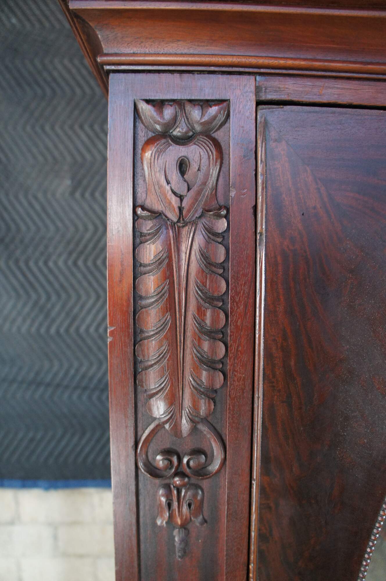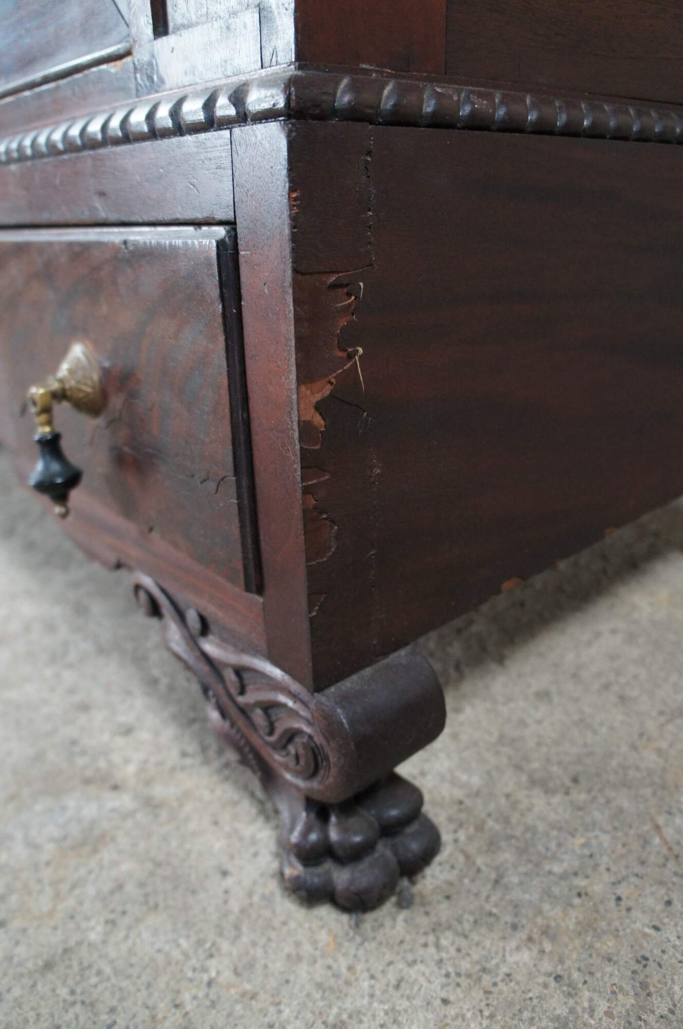 An exceptional early 20th century armoire. Features a rectangular frame made from mahogany with figural and acanthus carved accents. The central door features a large oval mirror that opens to space for hanging garments. The base features an apron of gadrooned accents over two dovetailed drawers with a flame mahogany front and knocker pulls. The cabinet is supported by scrolled paw feet.