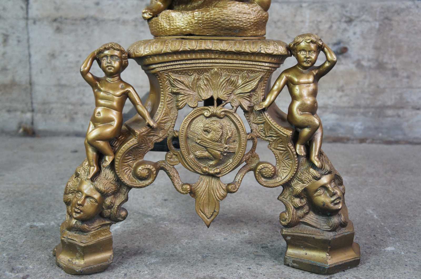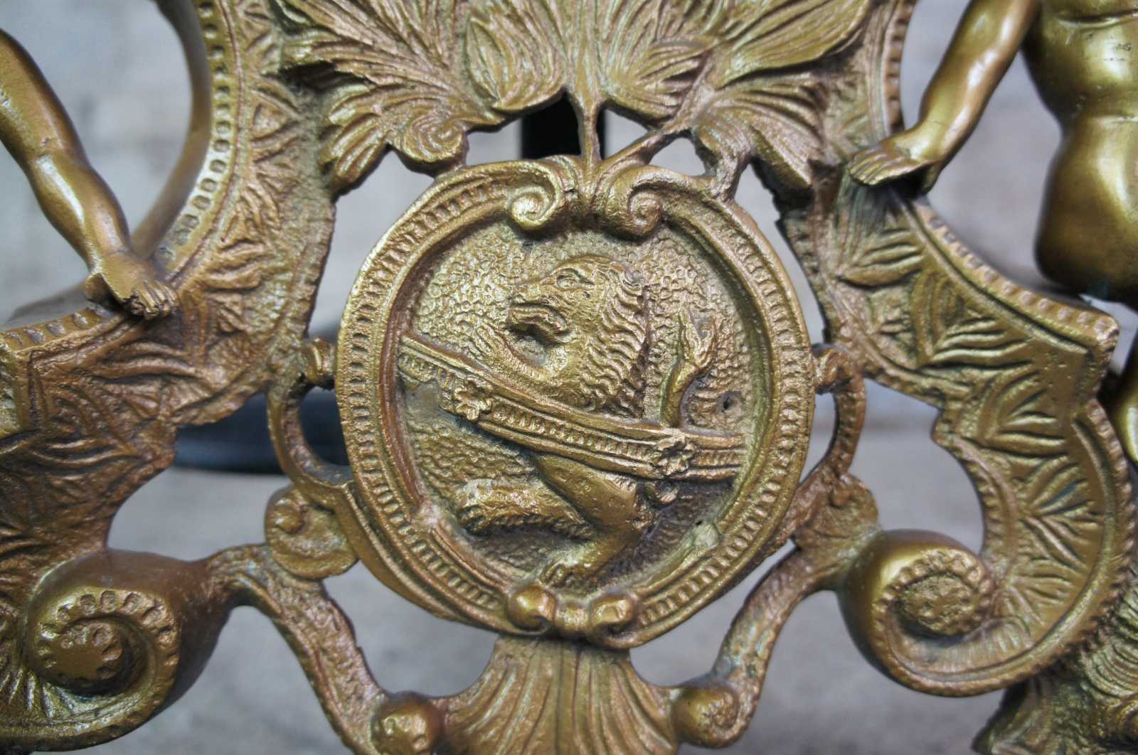 An elegant and rare set of figural Renaissance Revival andirons, chestnuts or firedogs. A depiction of Giambologna's Abduction of a Sabine Woman. Made from Bronze and finished in Gold. Features 3 outstretched figures above an ornate base of caryatids and cherubs centered by a lion crest. Log holder is made from iron.