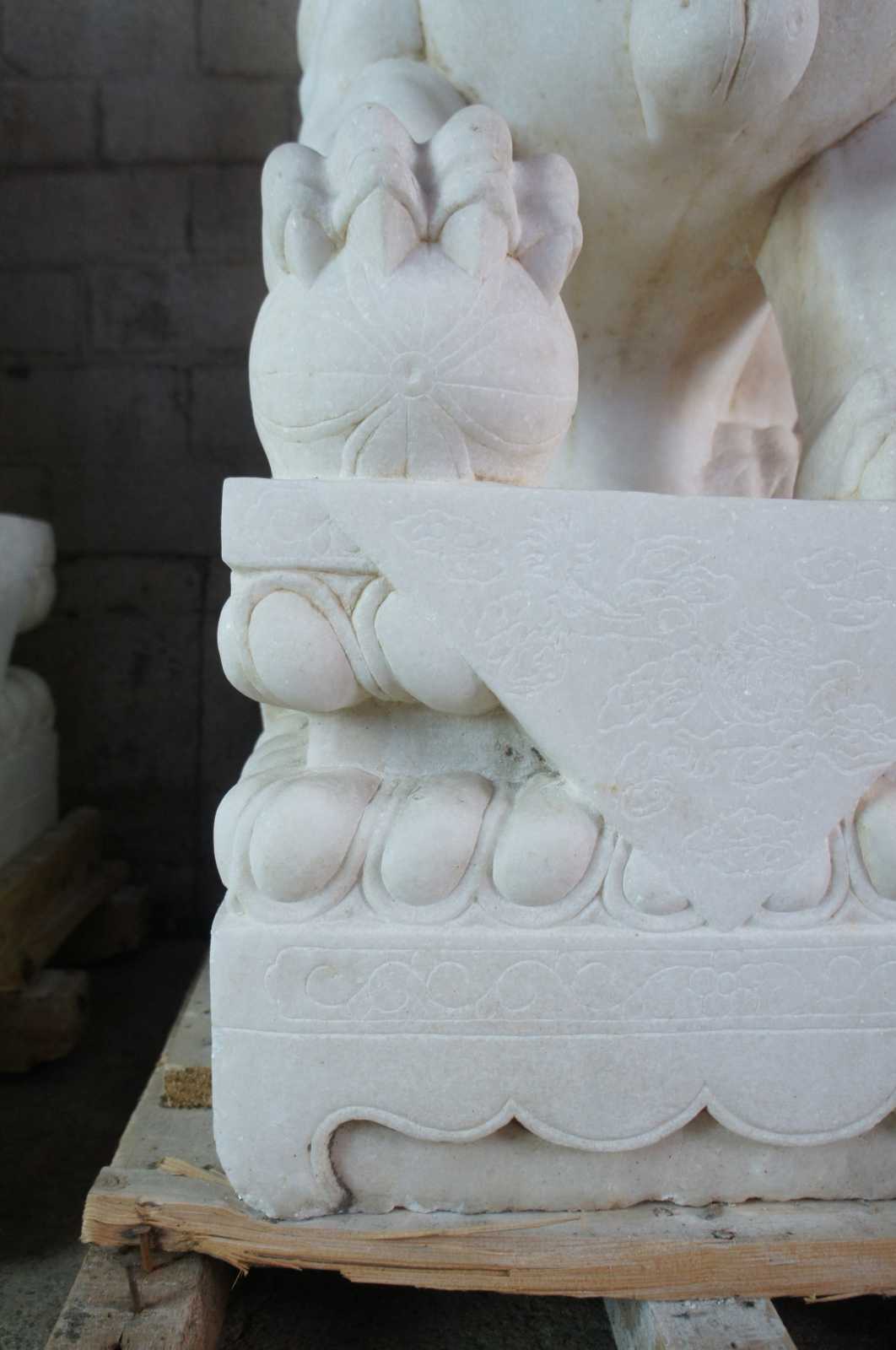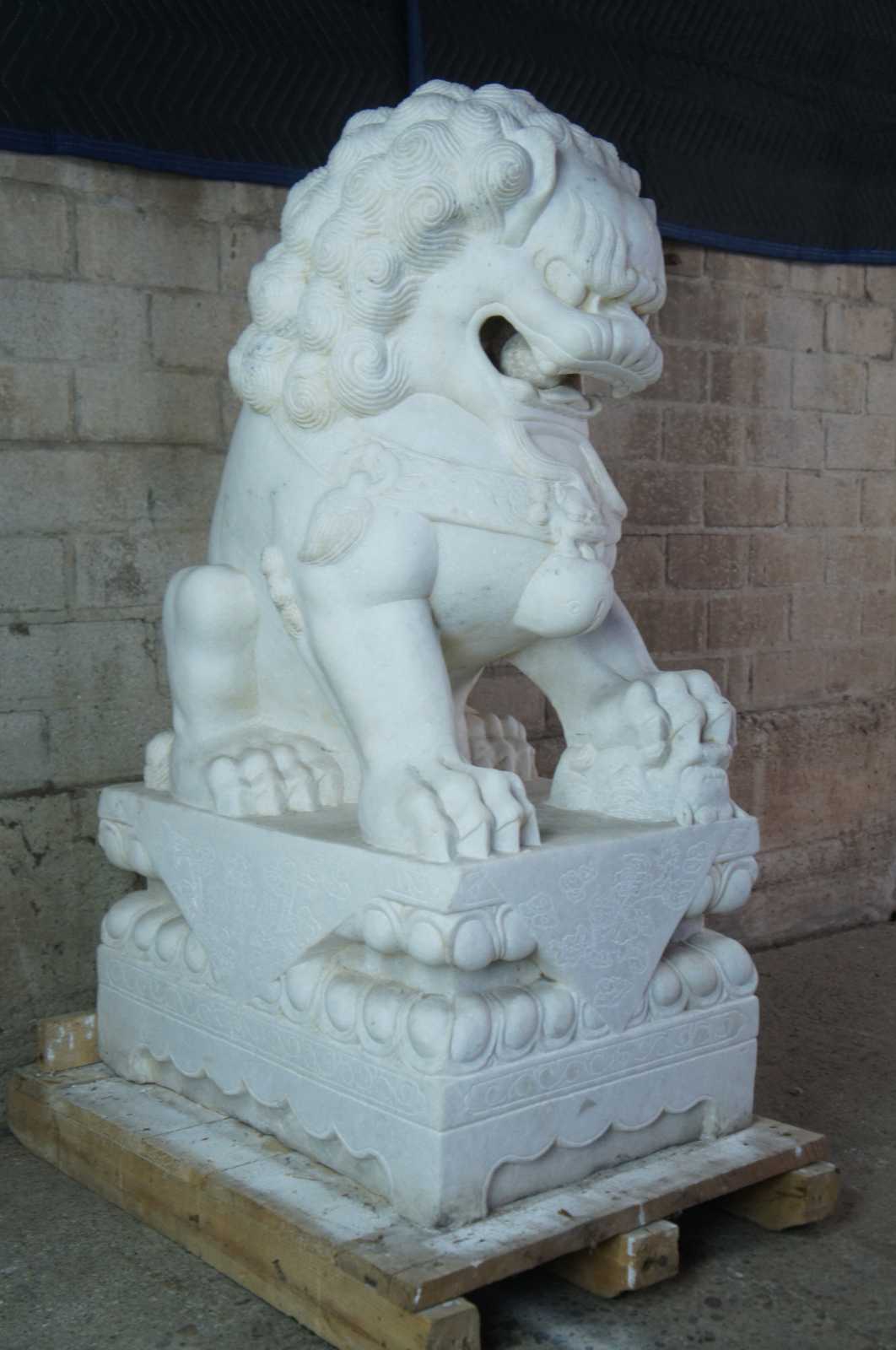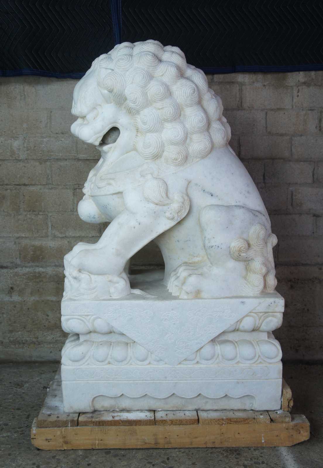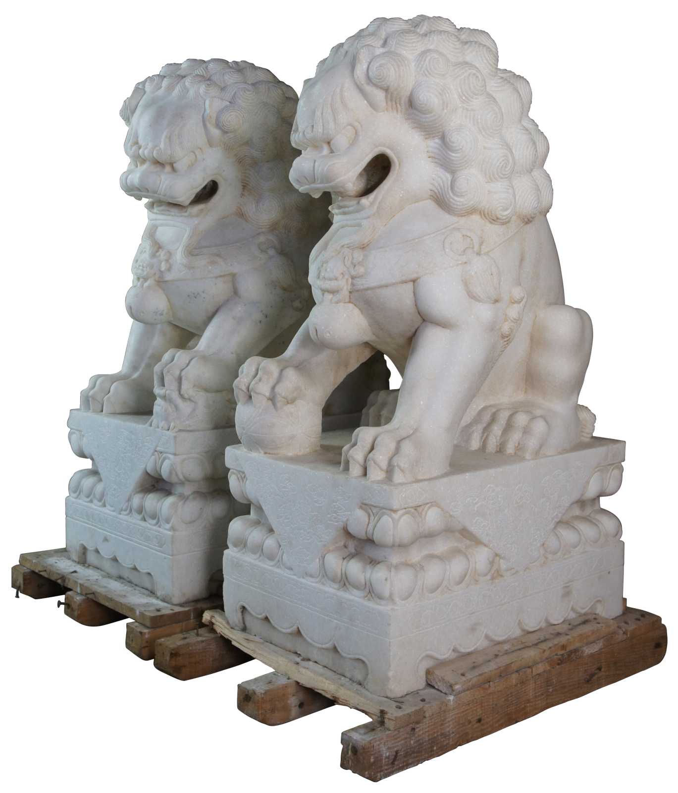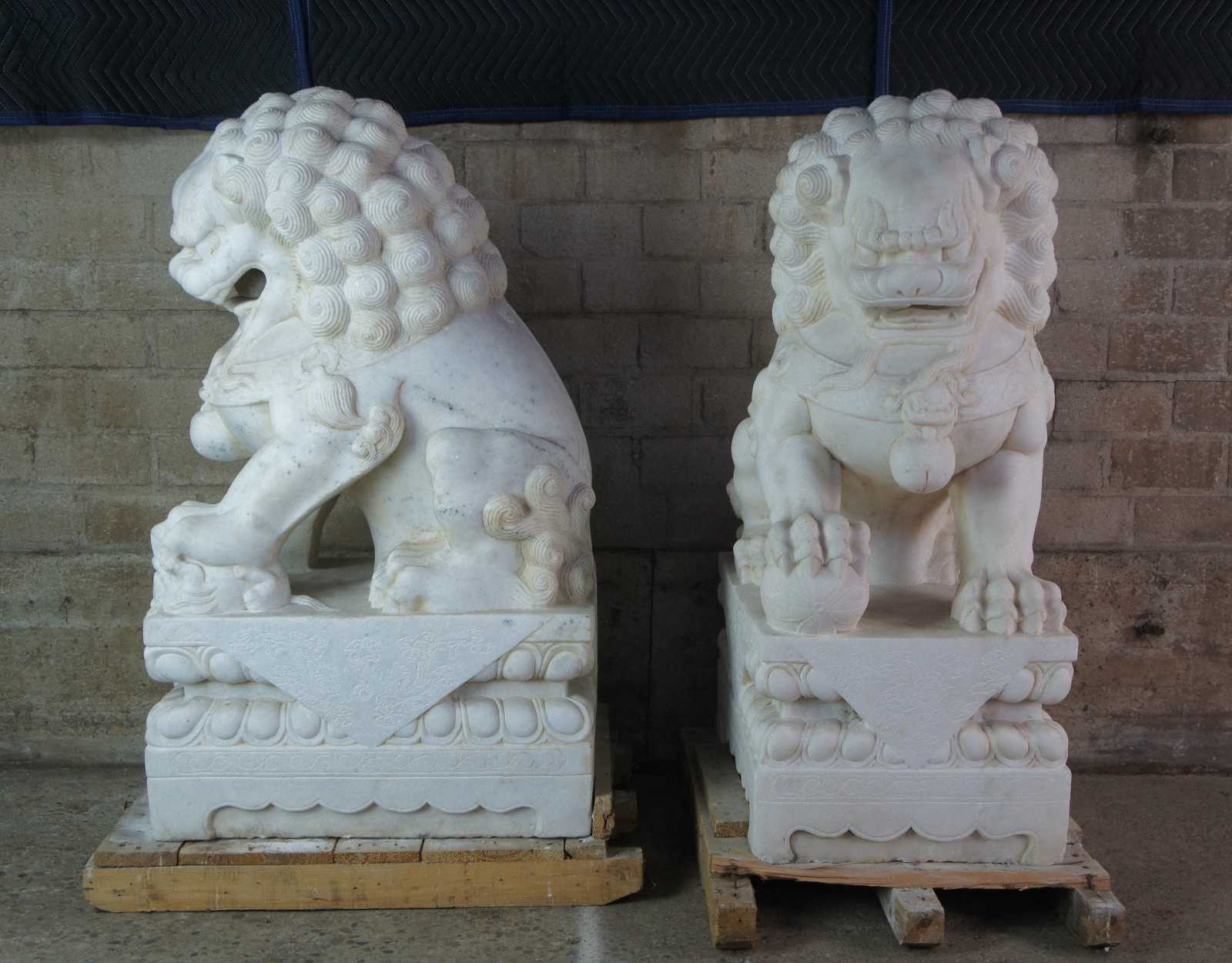 Two monumental antique Chines Chinese foo dogs, circa last quarter 19th century. Made of white marble featuring meticulously carved detail.