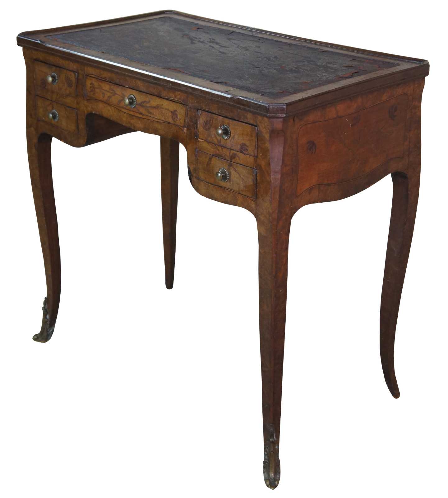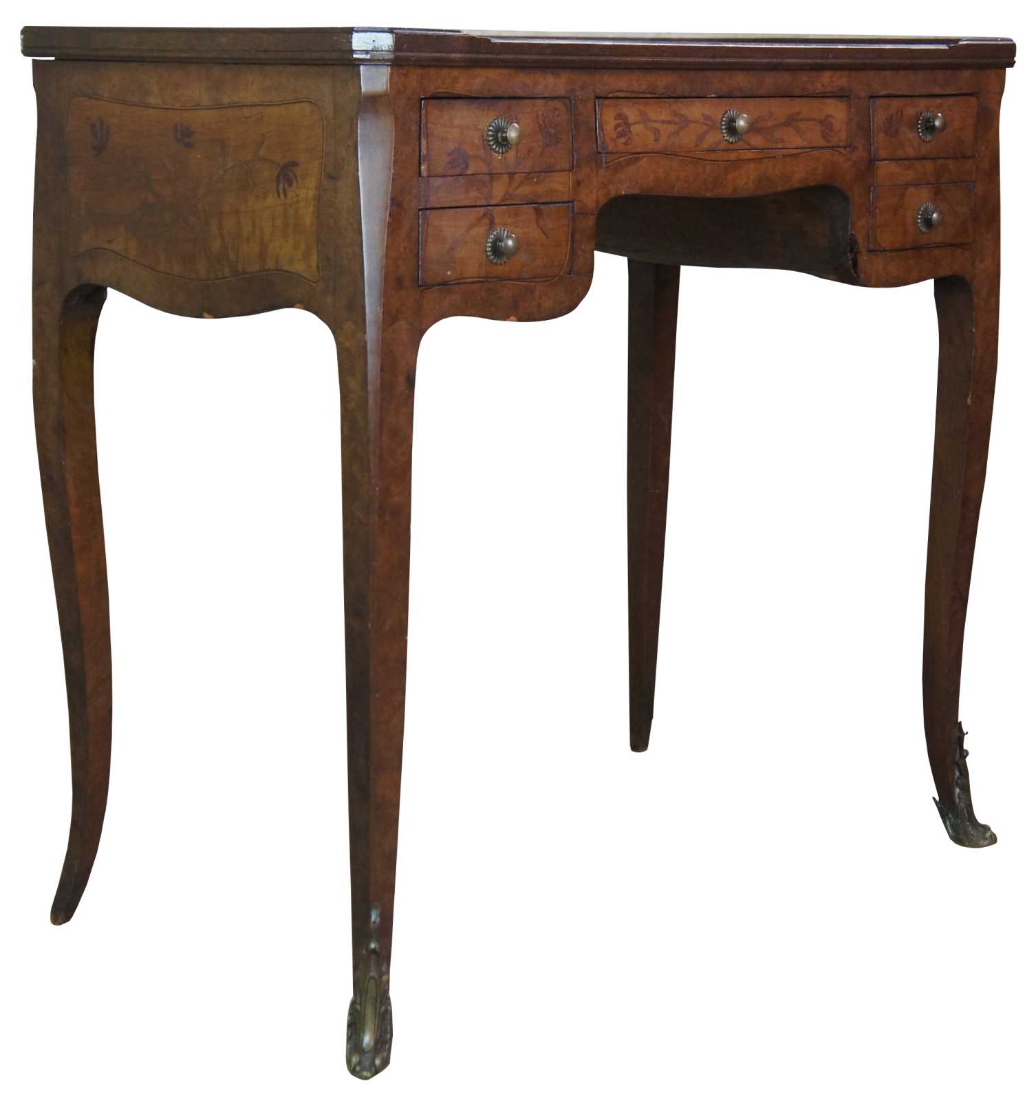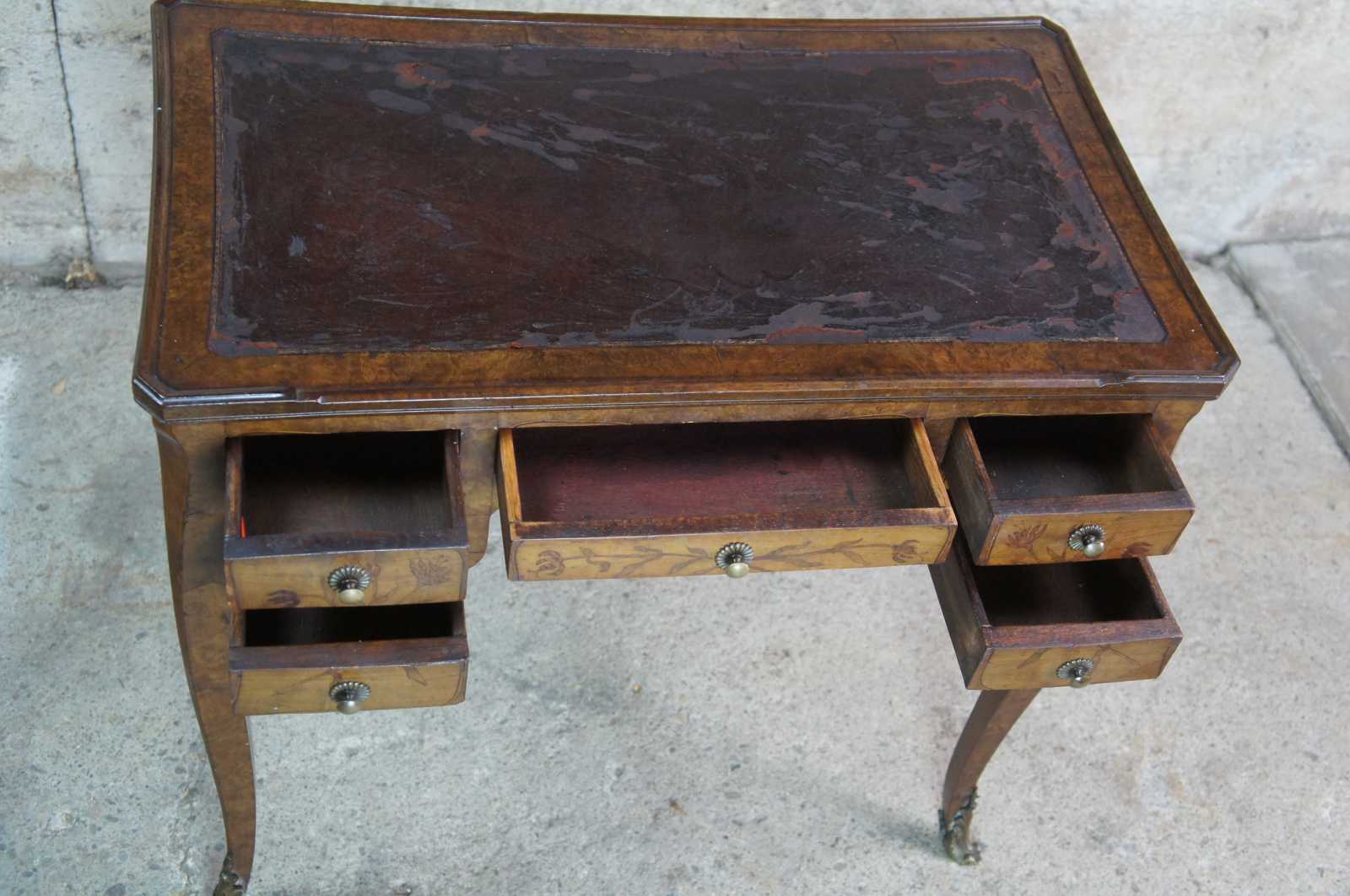 Antique Louis XV / Quinze style petite ladies writing table, desk or bureau . Made of burl walnut with rectangular form featuring marquetry inlaid floral accents, leather top with gallery, tapered cabriole legs with ormolu feet and finished false backside.