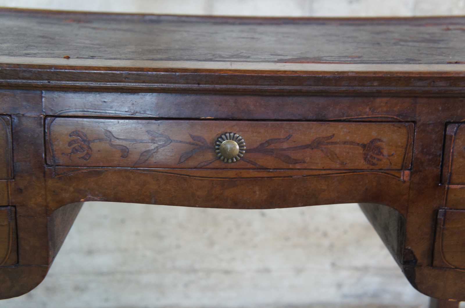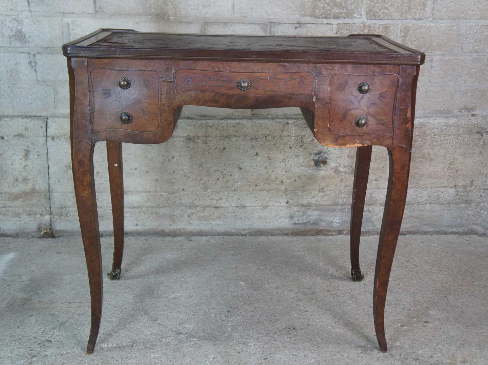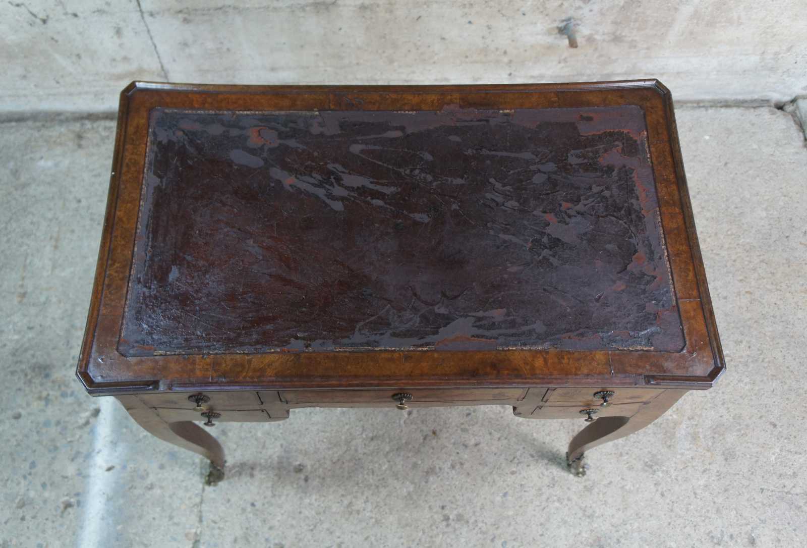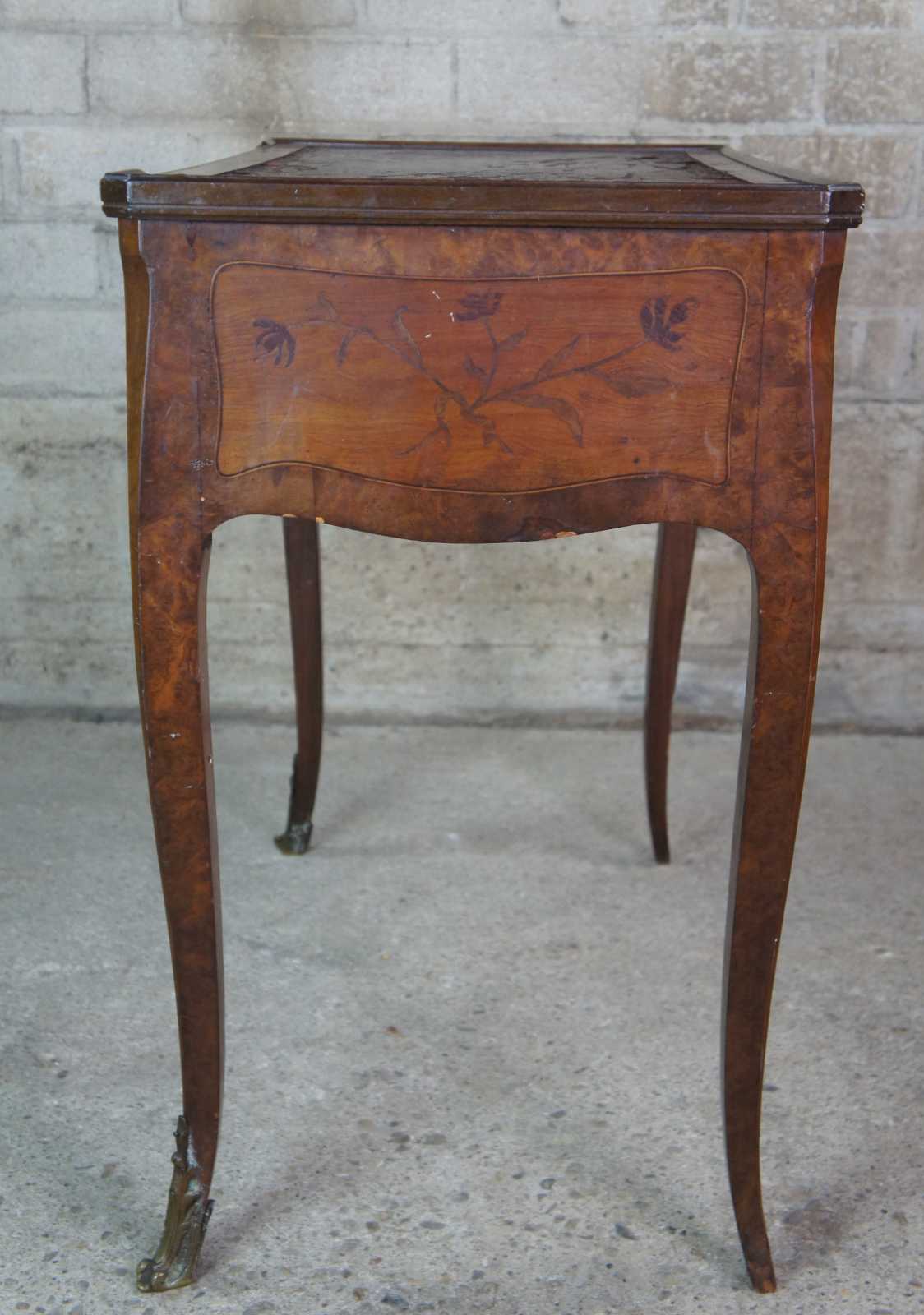 Antique Louis XV / Quinze style petite ladies writing table, desk or bureau . Made of burl walnut with rectangular form featuring marquetry inlaid floral accents, leather top with gallery, tapered cabriole legs with ormolu feet and finished false backside.