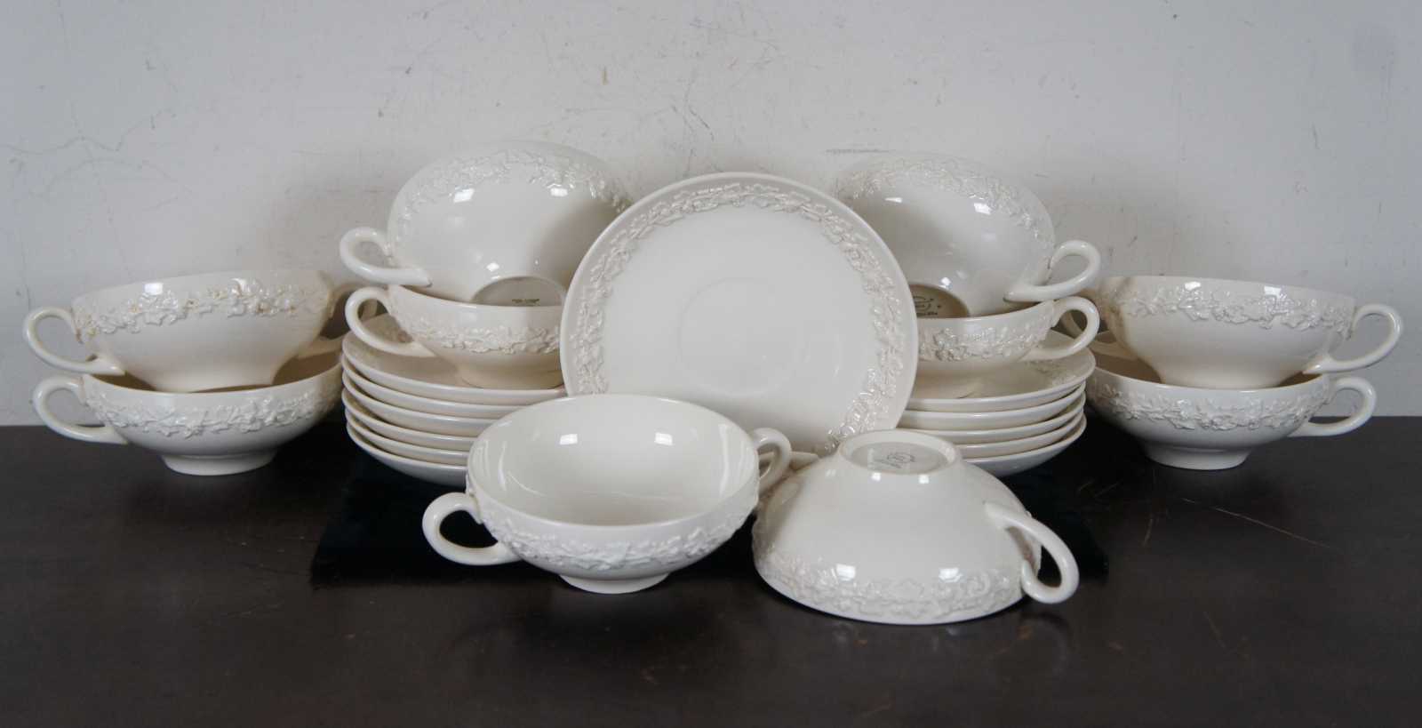 Pair of circa 1930s Königliche Porzellan-Manufaktur white porcelain Arkadia Bacchantes bouillon soup bowls with a female nude figure cameo on one side. “The Royal Porcelain Factory in Berlin (German: Königliche Porzellan-Manufaktur Berlin, abbreviated as KPM), also known as the Royal Porcelain Manufactory Berlin and whose products are generally called Berlin porcelain, was founded in 1763 by King Frederick II of Prussia (known as Frederick the Great). Its actual origins, however, lie in three private enterprises which, under crown patronage, were trying to establish the production of ""white gold"" (i.e. porcelain) in Berlin from the mid-18th century onwards.