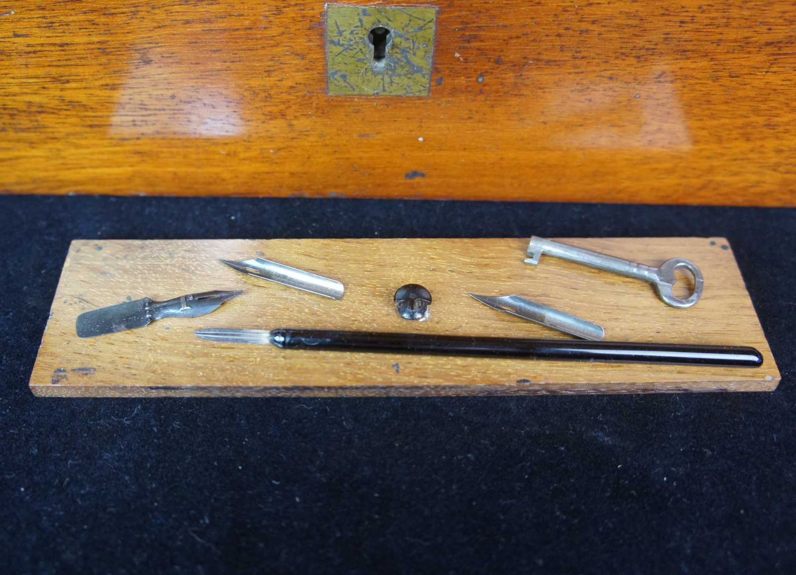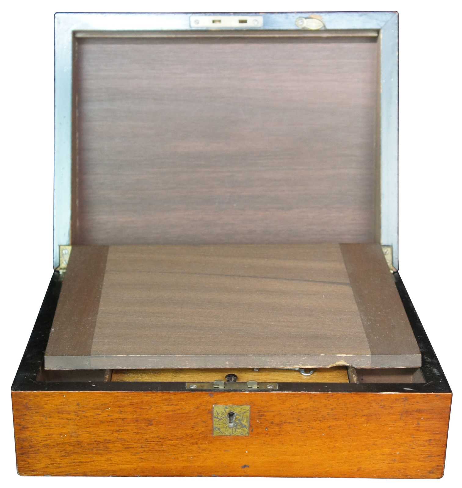 Antique Victorian campaign writing desk slope. Made of walnut featuring purple velvet writing surface with multiple compartments and functional lock / key. Few extra accessories included.