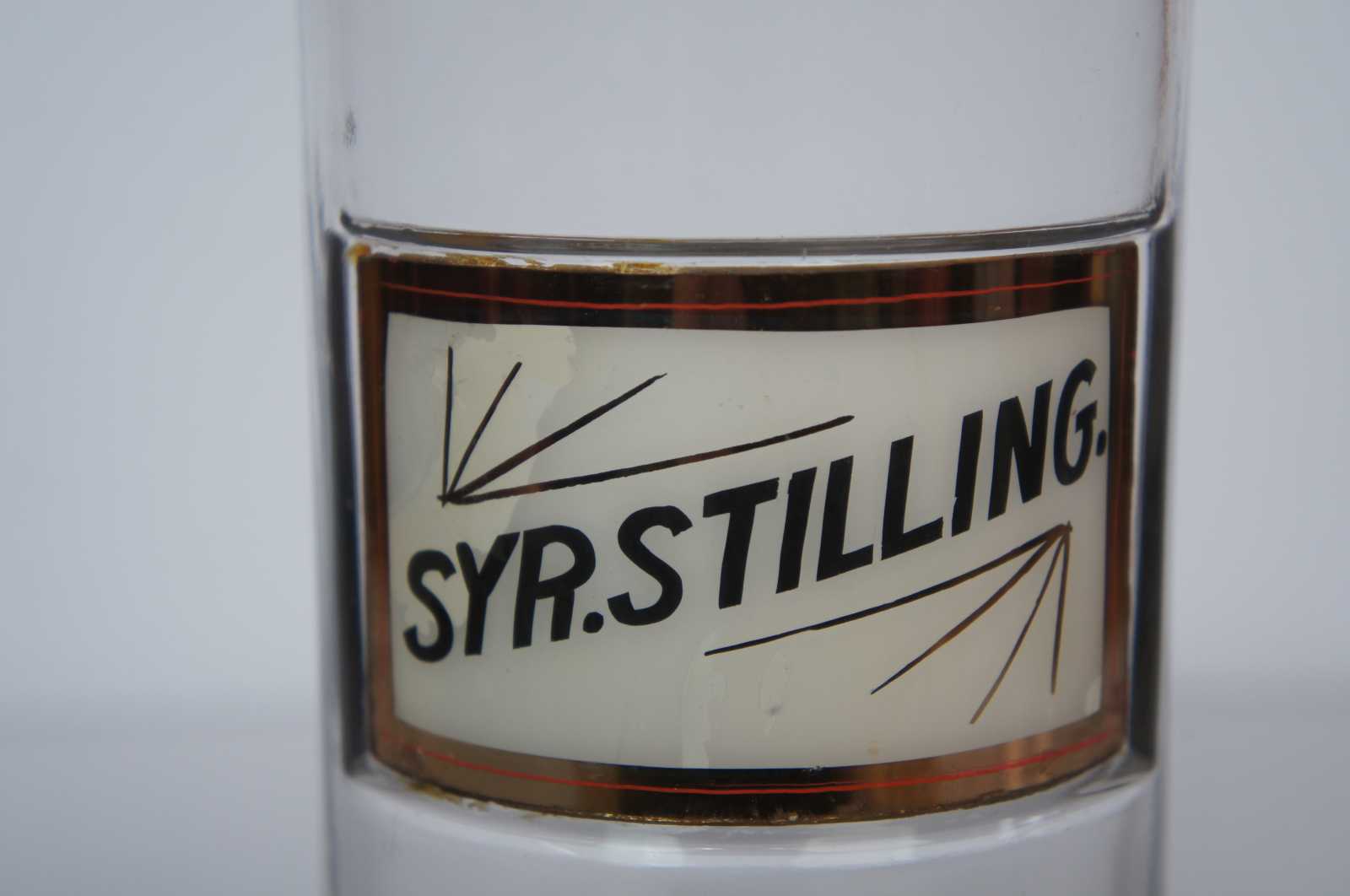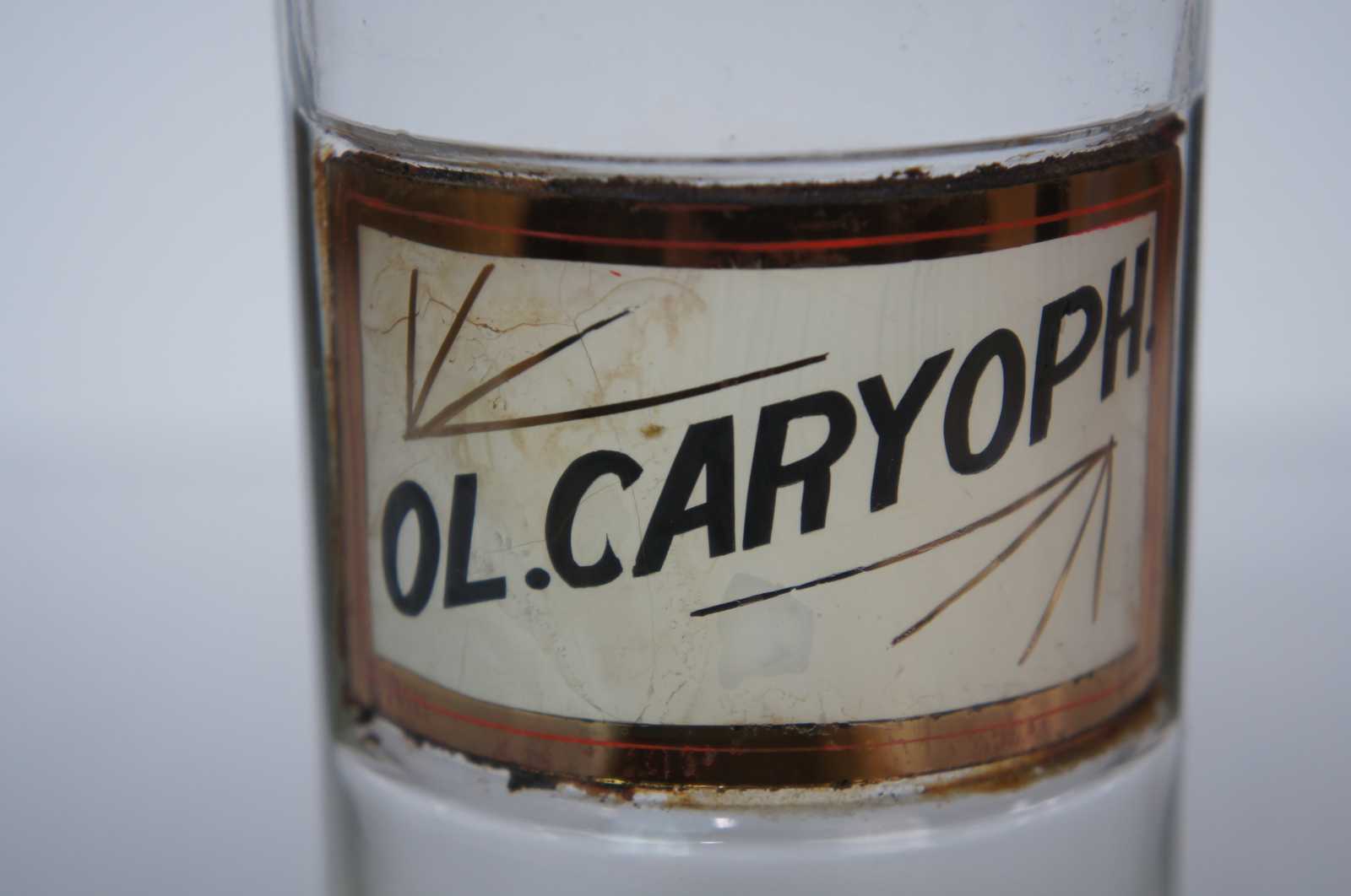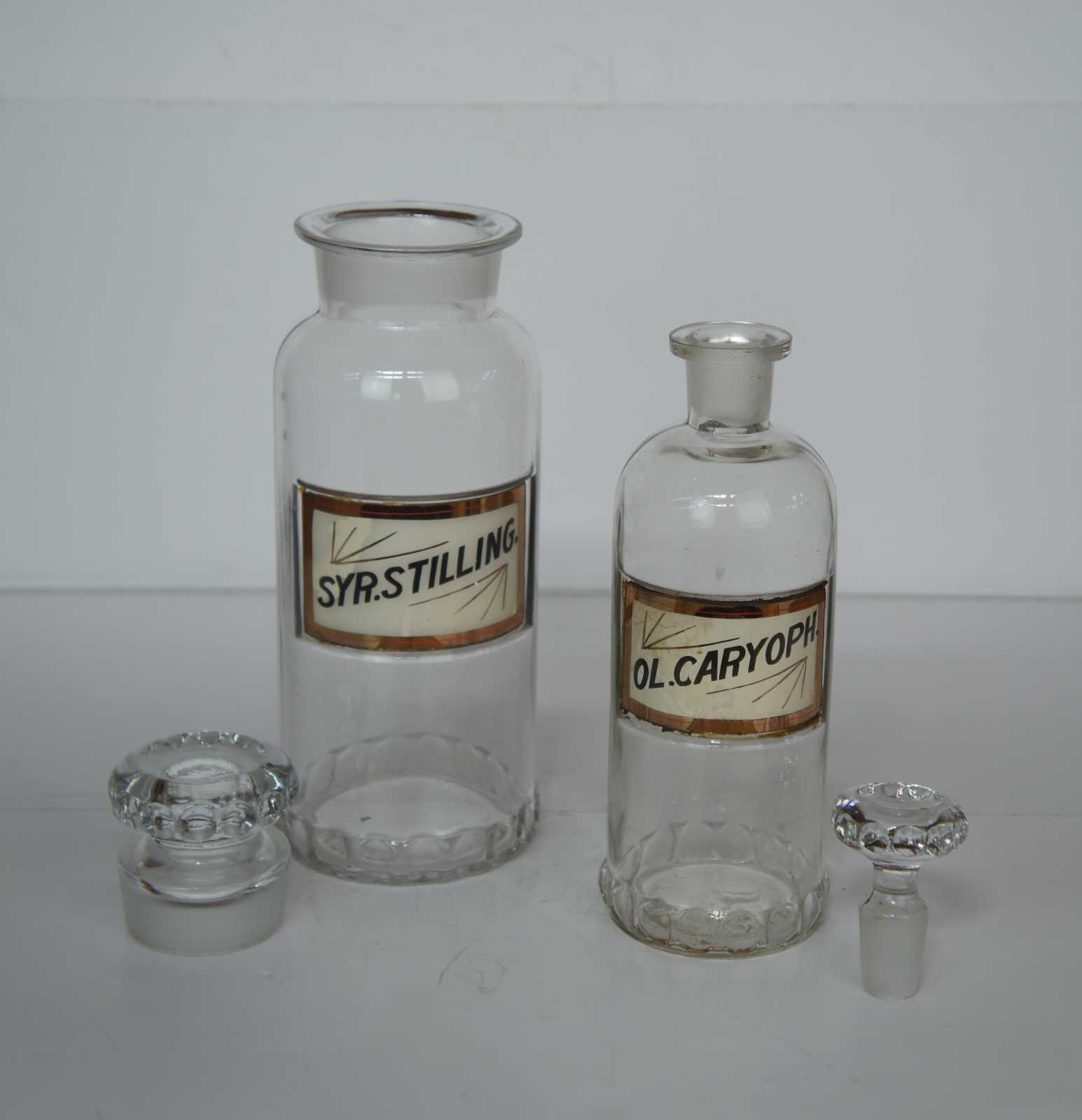 2 antique chemist bottle, marked March 1891. Features shaped base and matching topper. Each bares the orignal hand written label. Marked ""Syr. Stilling"" & ""OL Caryoph"" or Caryophyllene oxide