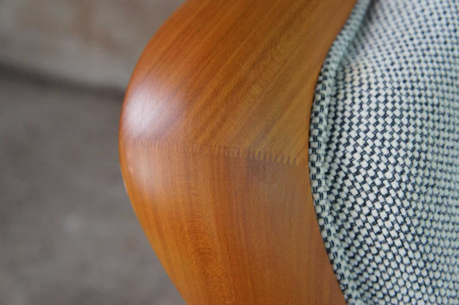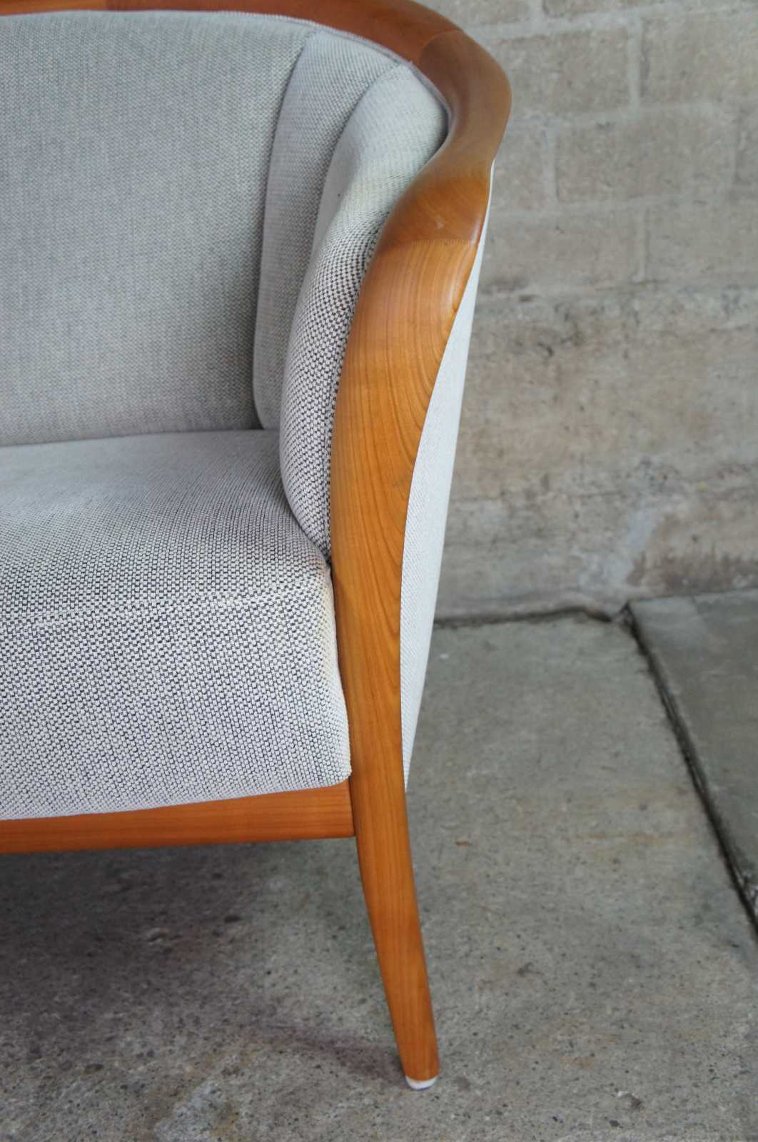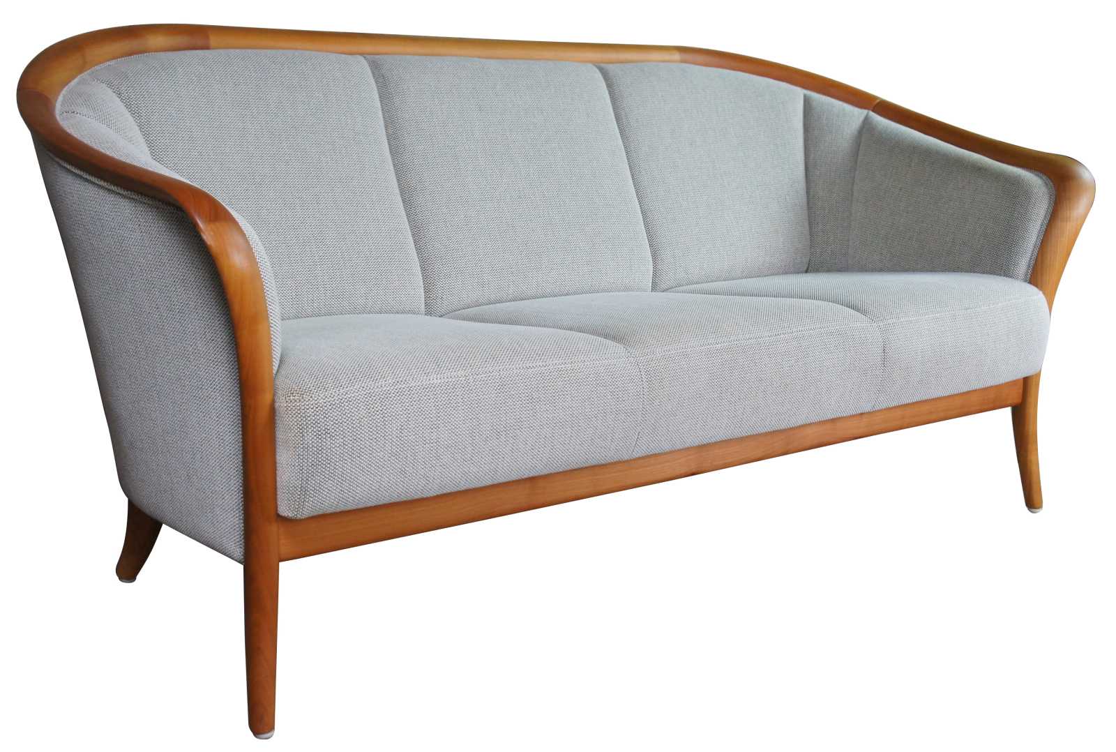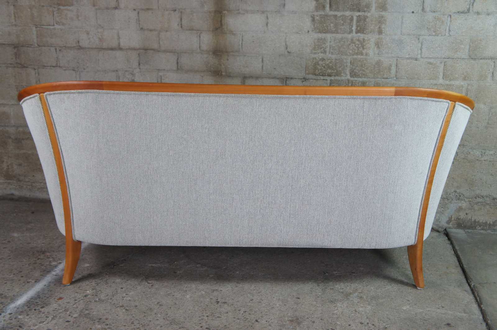 Mid Century Modern Skipper Mobler Furniture Co couch or Sofa. Made in Denmark featuring bentwood maple frame with rounded form a neutral upholstery.