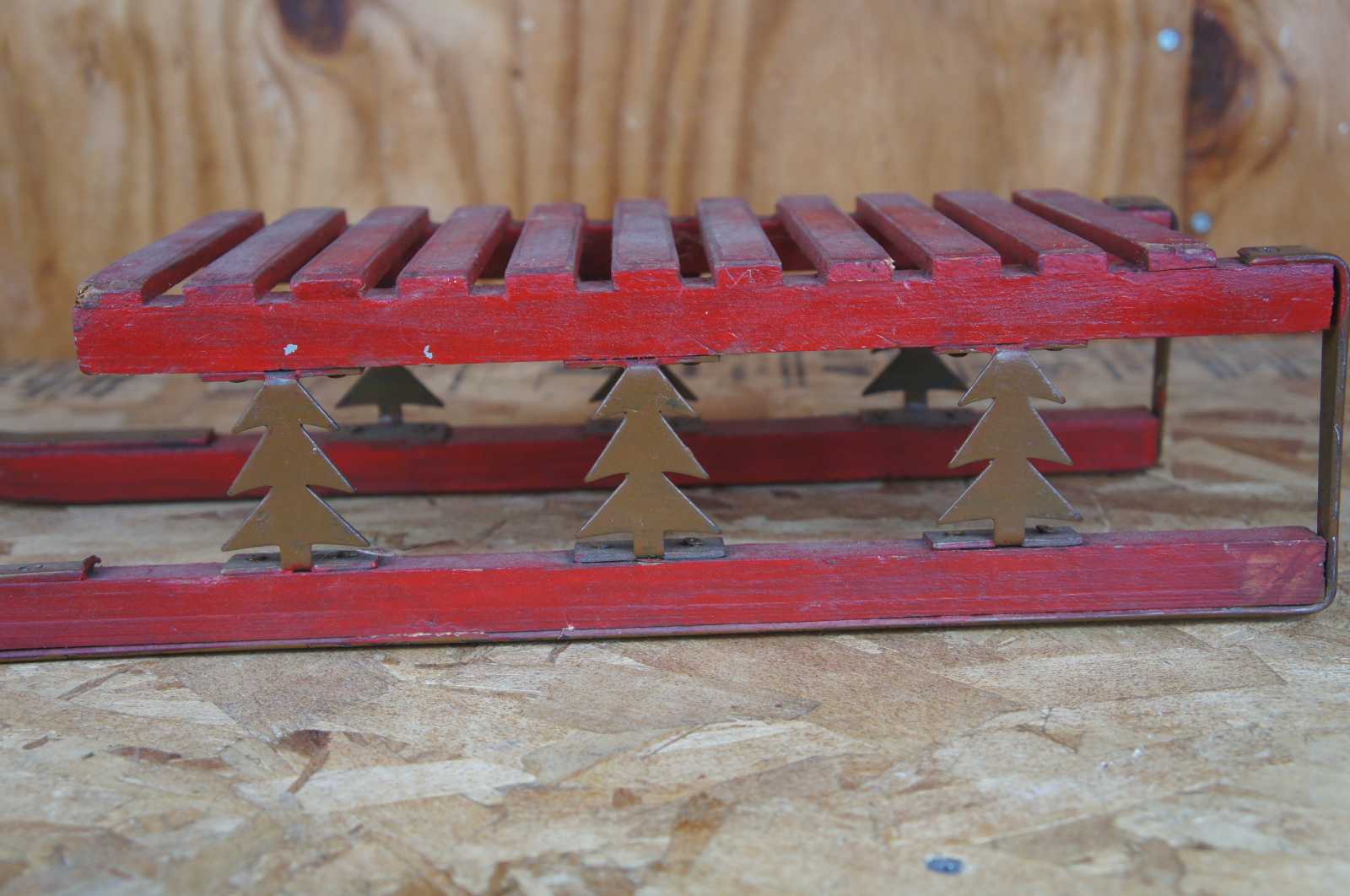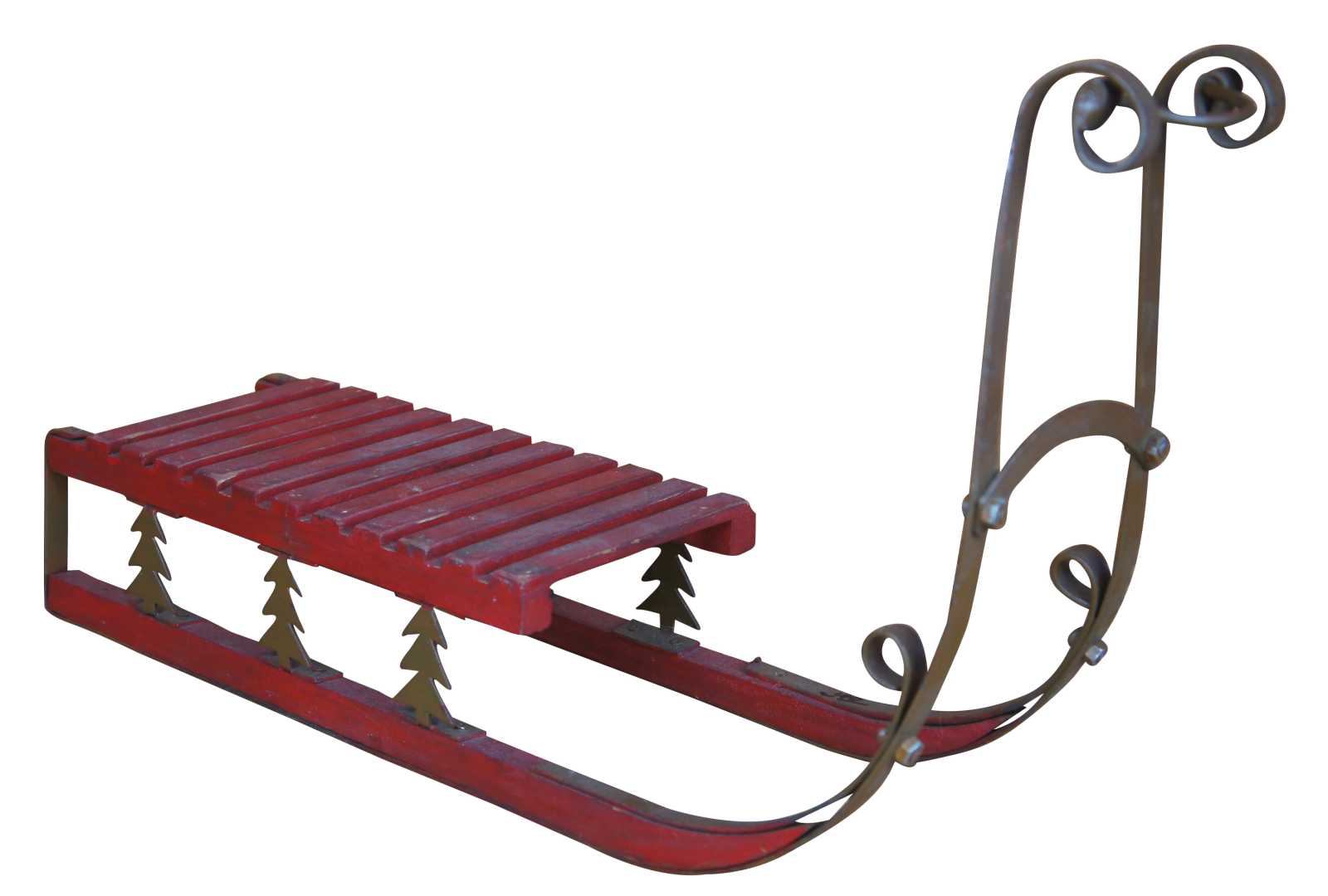 Vintage folk art toy or childs christmas sleigh/ sled / toboggan. Made of slatted wood with scrolled iron accents featuring cut out christmas trees.