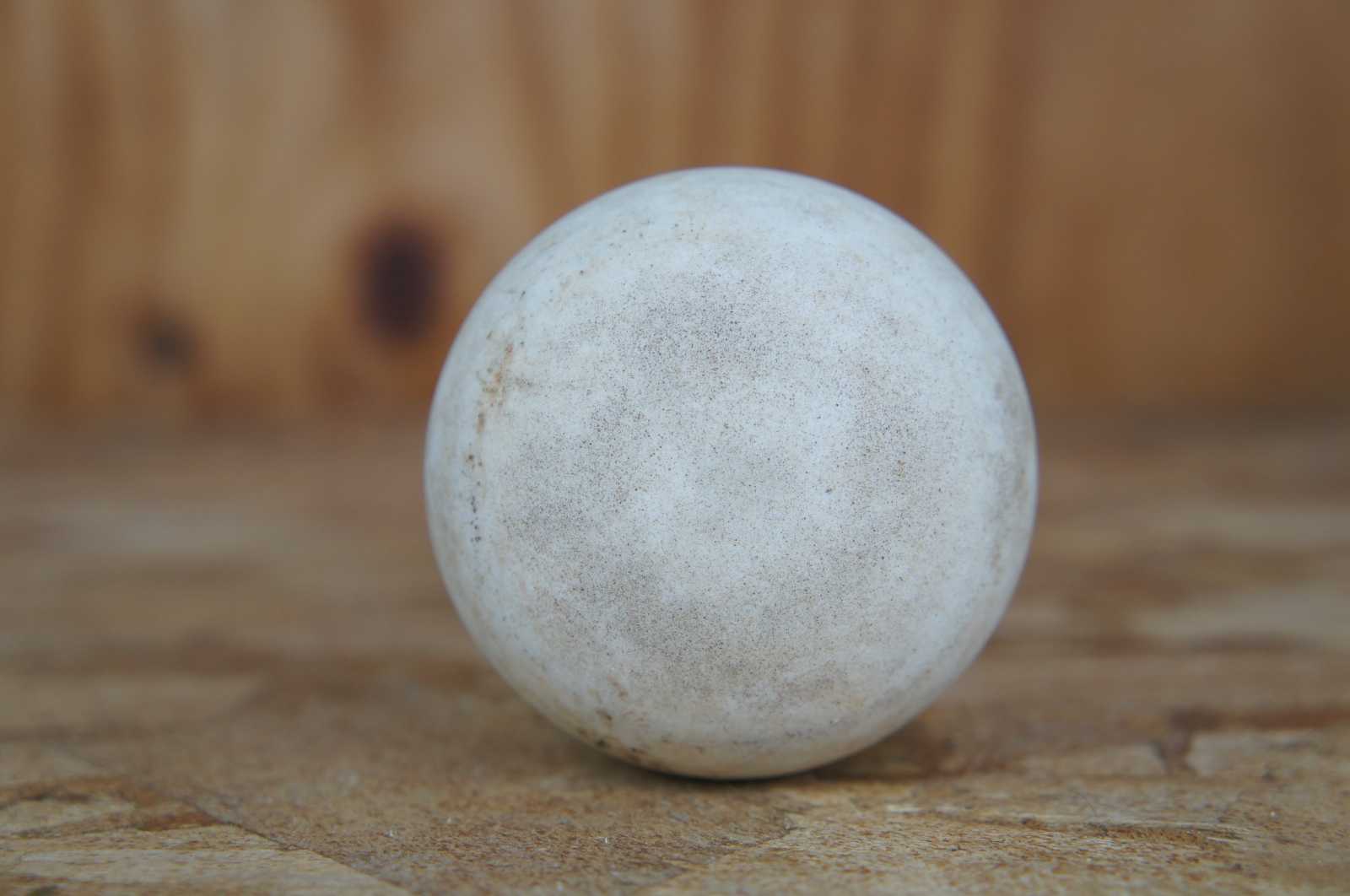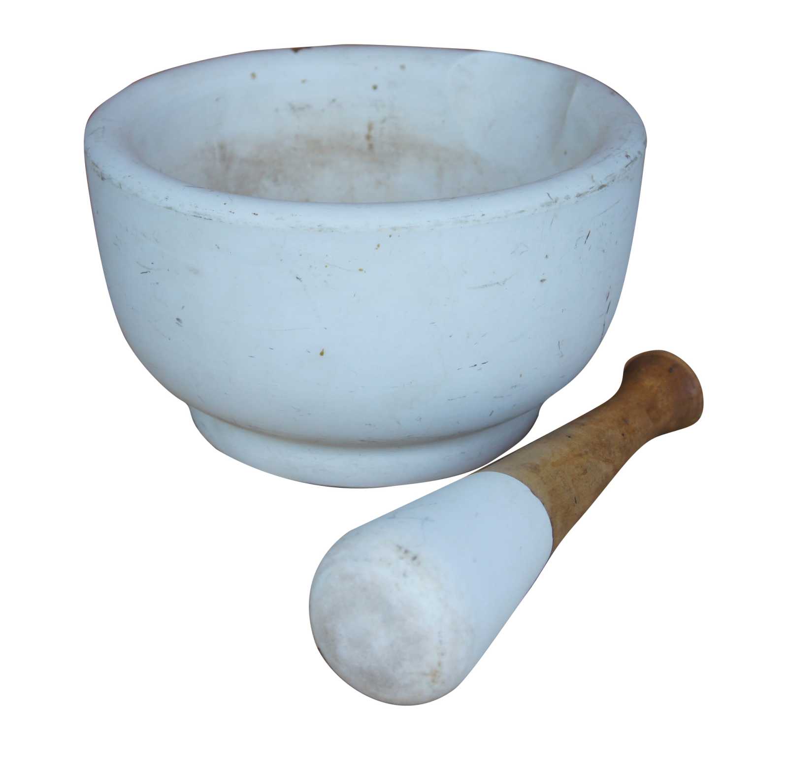 Vintage Engish ironstone mortar and pestle featuring stone bowl and wood / stone pestle. Marked Trade Mark M with diamond.