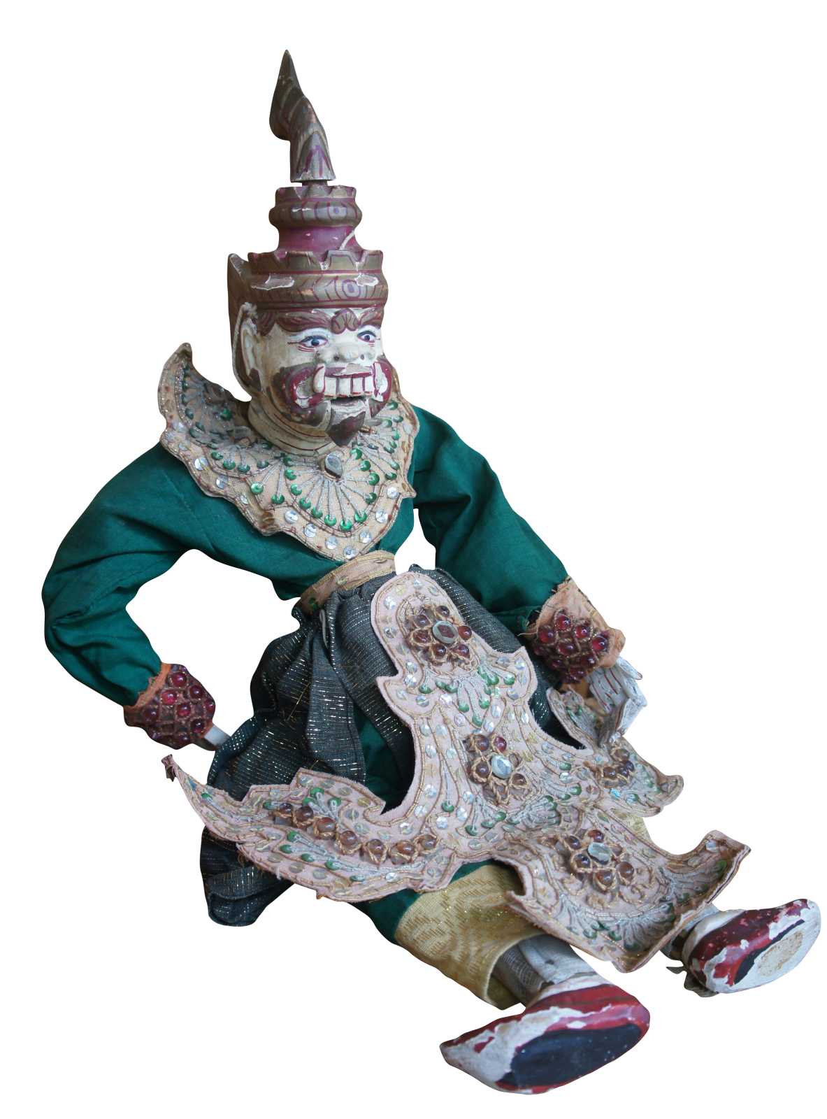 Antique carved Thai Burmese Ramayana Warrior marionette string puppet. Hand made from wood featuring ornate beaded clothing / attire.