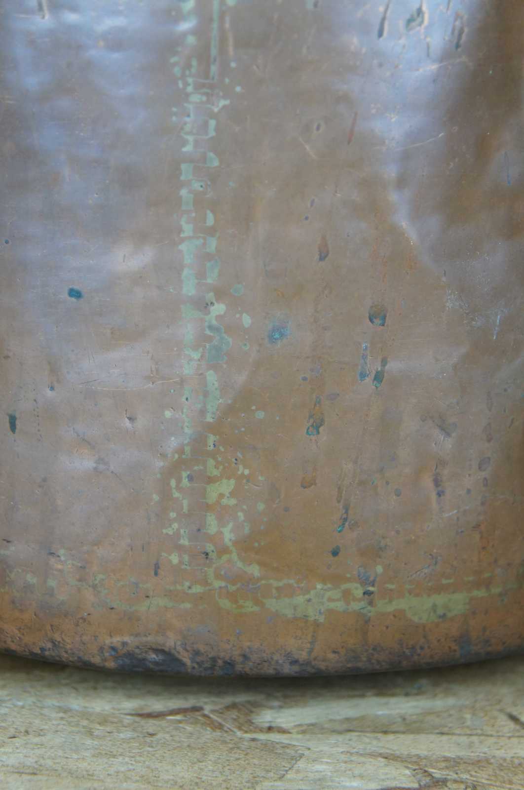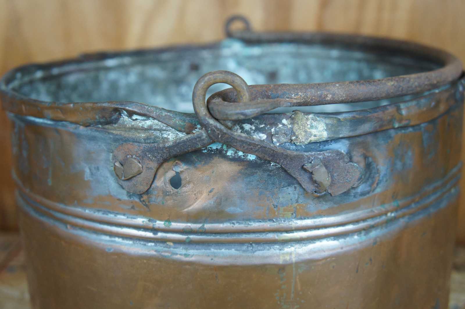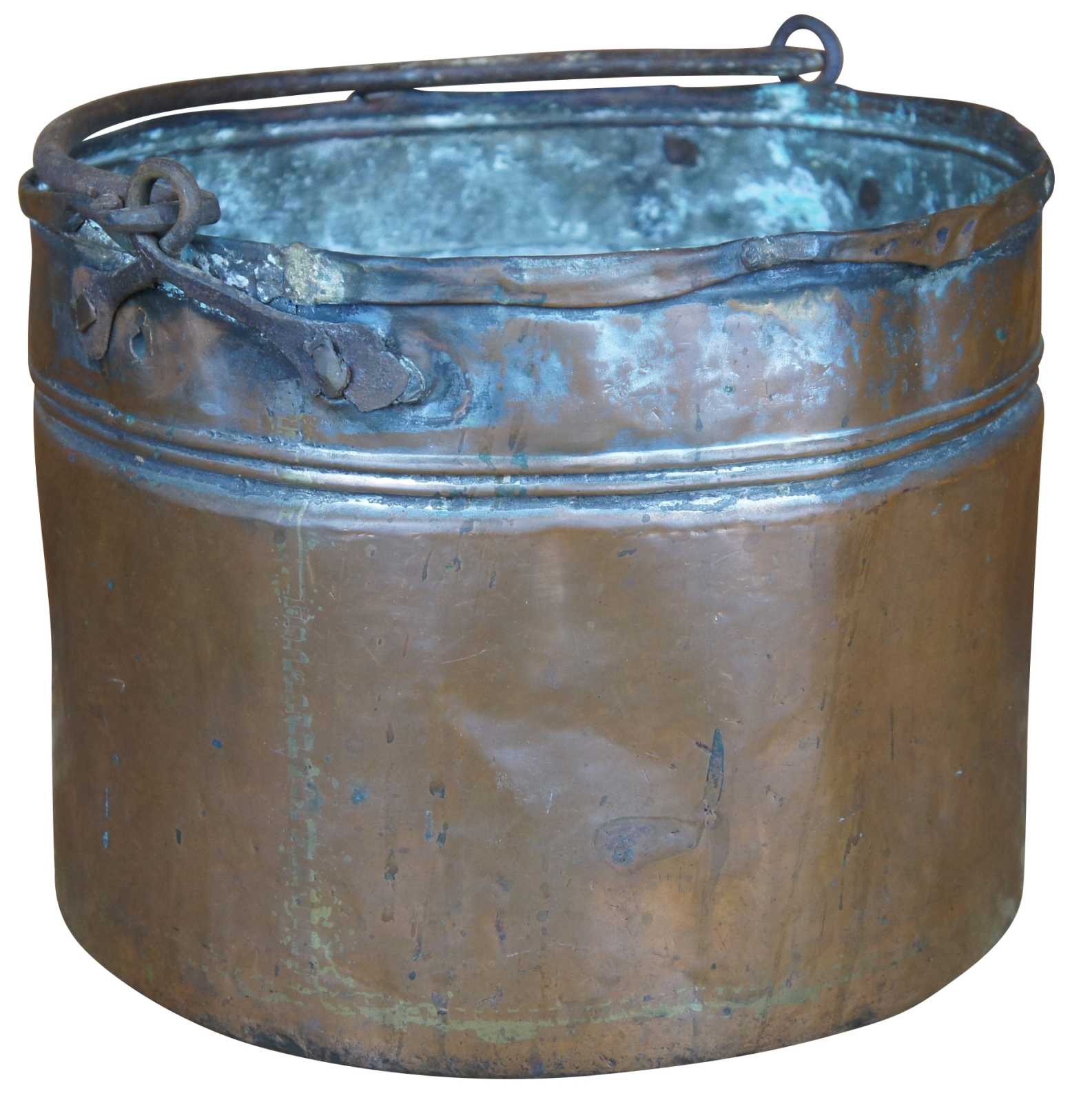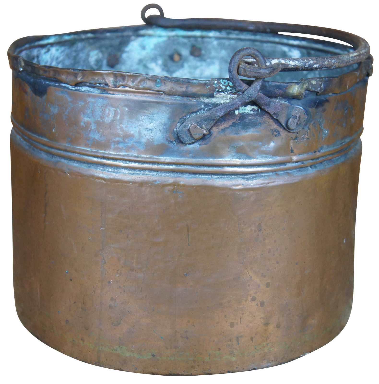 Antique 18th century hammered and dovetailed copper cauldron featuring ornate scrolled iron handle and double banding.