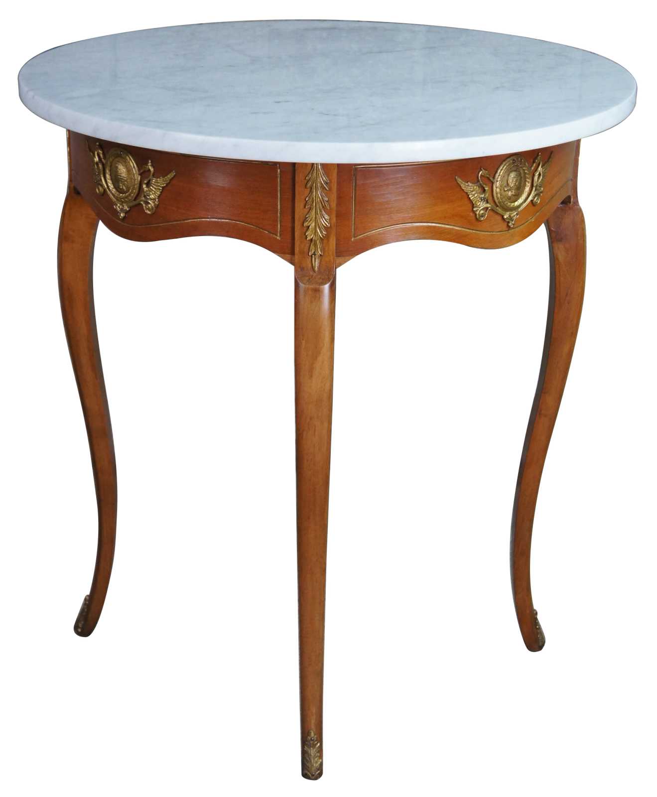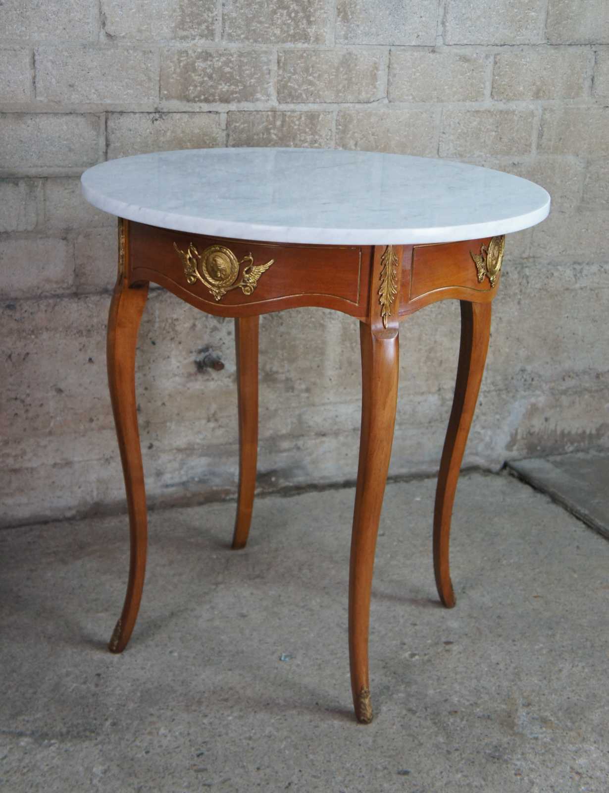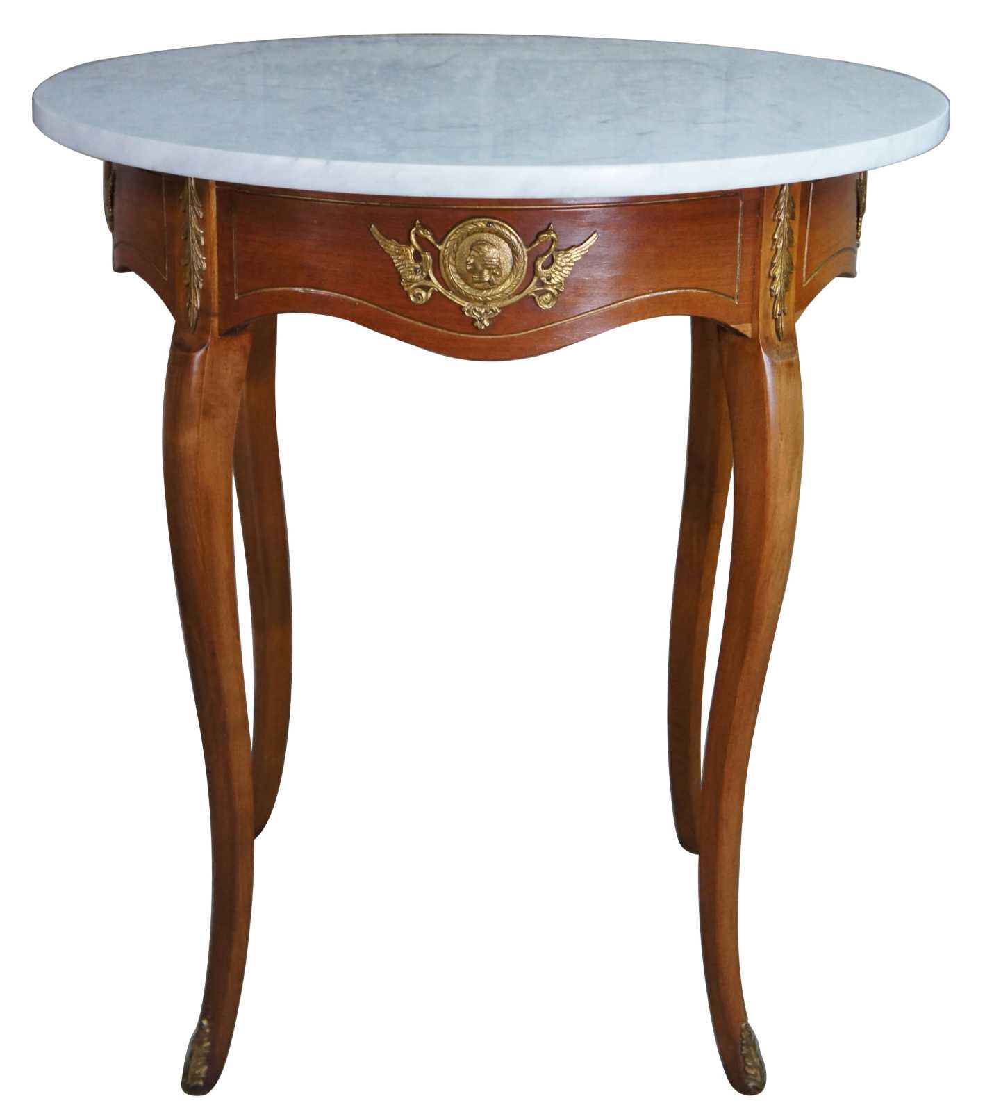 Two antique Italian Neoclassical Gueridon tables. Made of fruitwood with gold medallions that feature a bust of a mans head surrounded by a wreath flanked by swans / birds. Accanthus accents and feet caps adorn the serpentine legs. Original marble marked Wite Carrara 52, Made Italy.