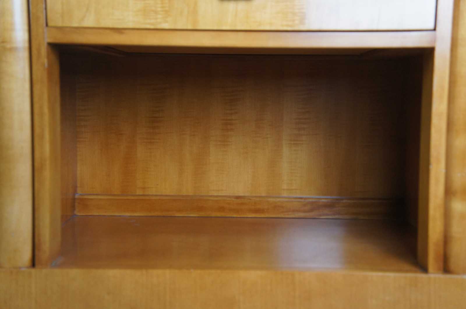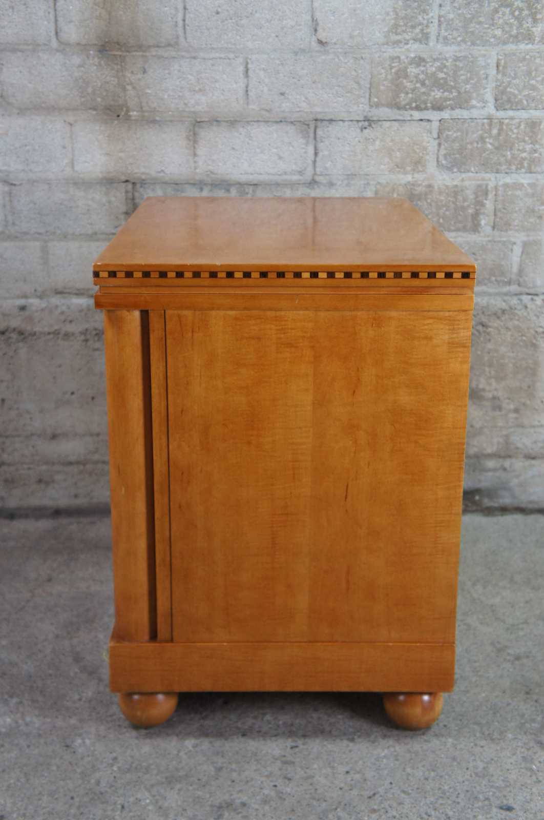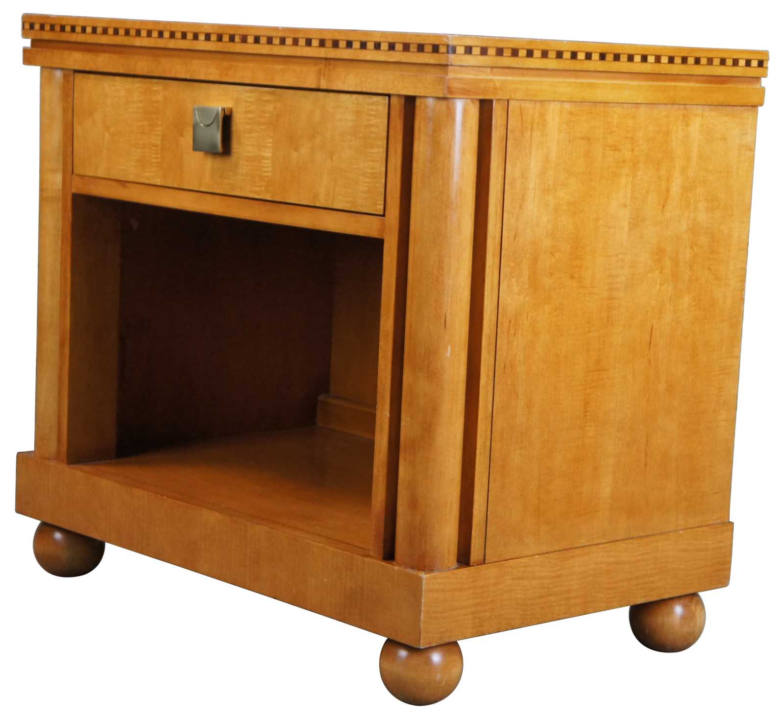 Vintage Hickory White Genesis collection Biedermeier style satinwood (carmel) nightstand. Features one drawer with brass hardware over lower cubby flanked by beautiful columnar stiles. The chest is supported by bun feet.. #25571.