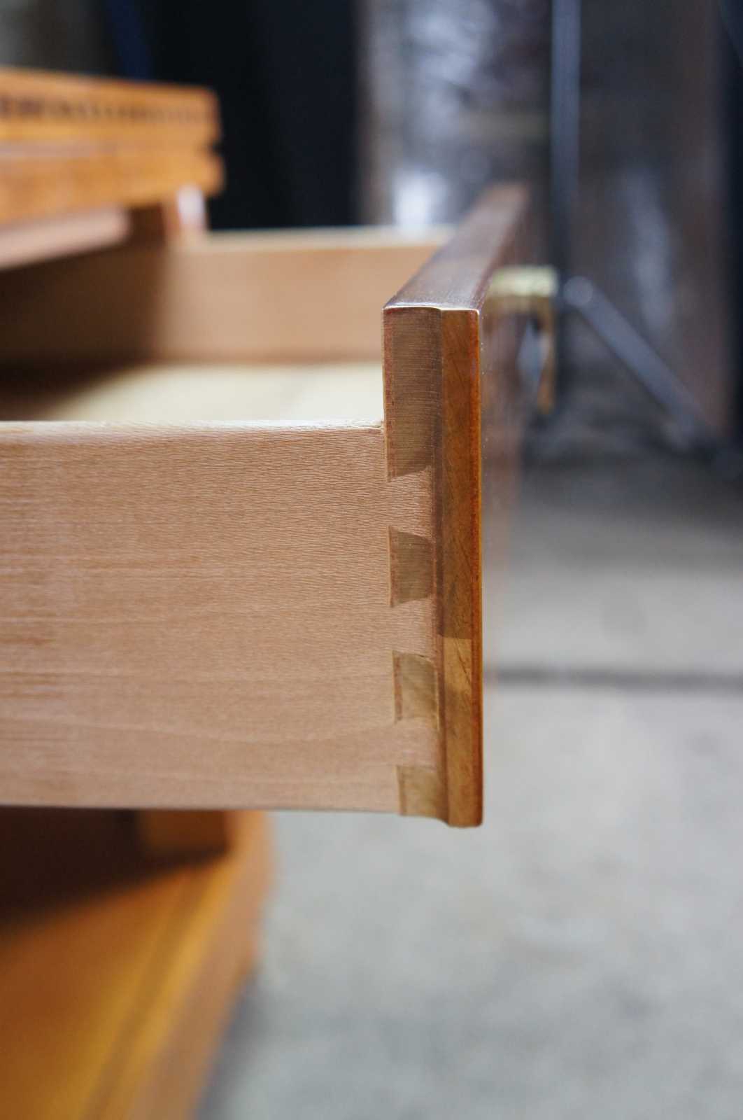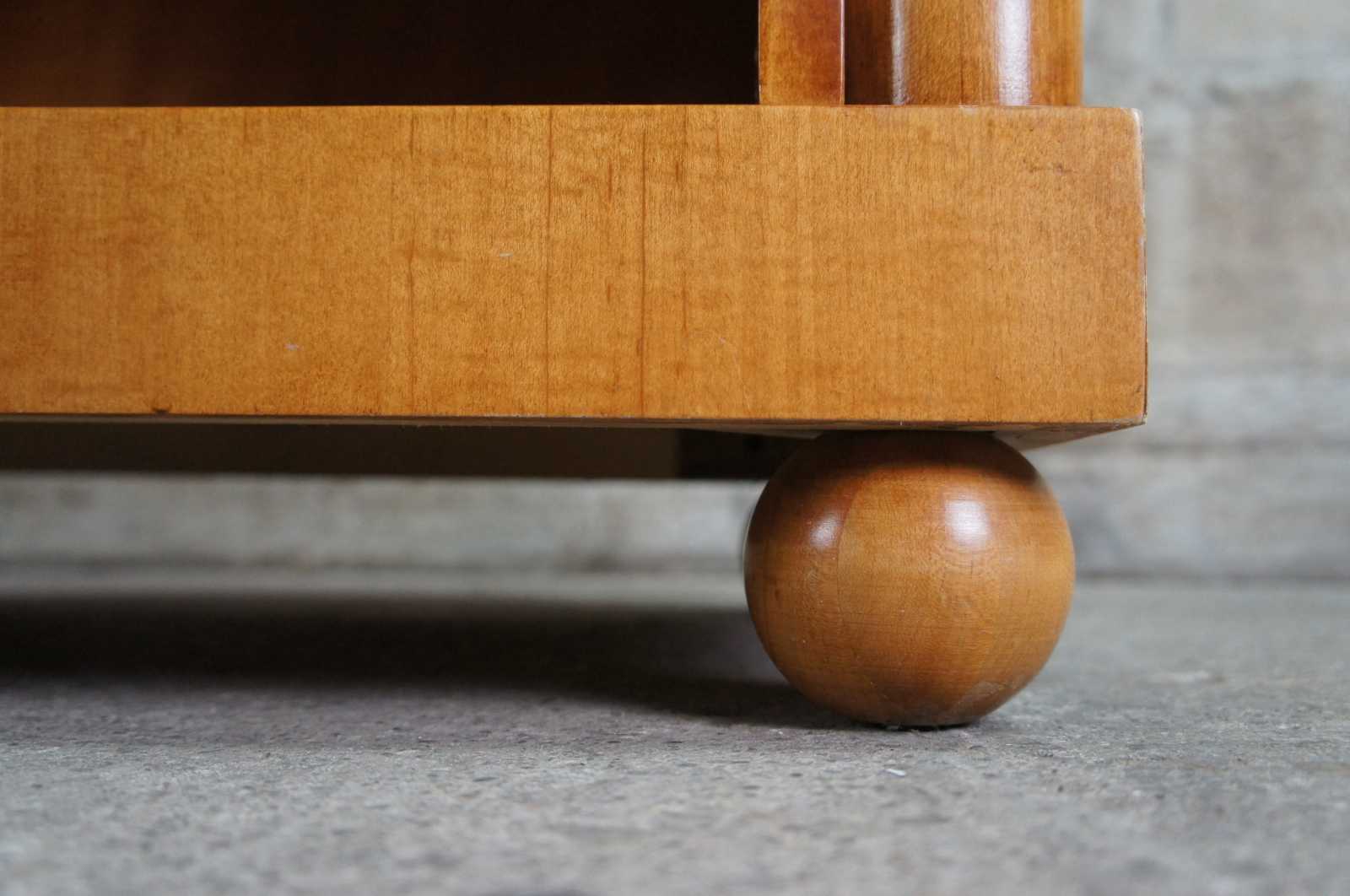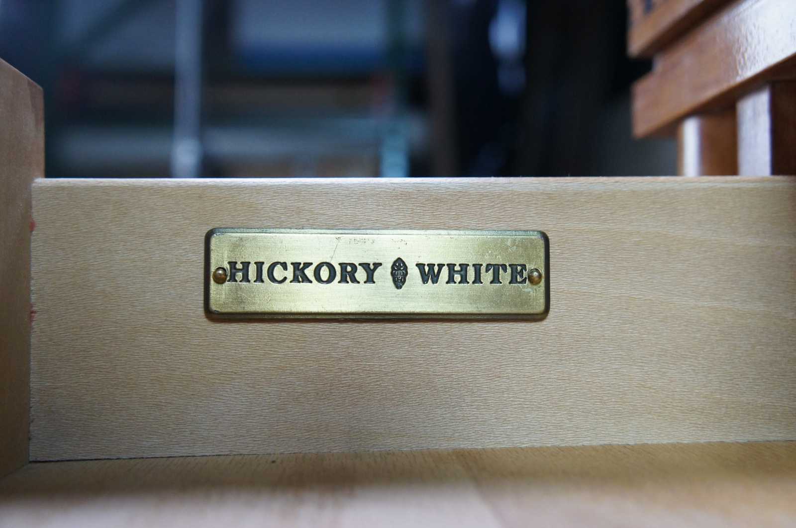 Vintage Hickory White Genesis collection Biedermeier style satinwood (carmel) nightstand. Features one drawer with brass hardware over lower cubby flanked by beautiful columnar stiles. The chest is supported by bun feet.. #25571.