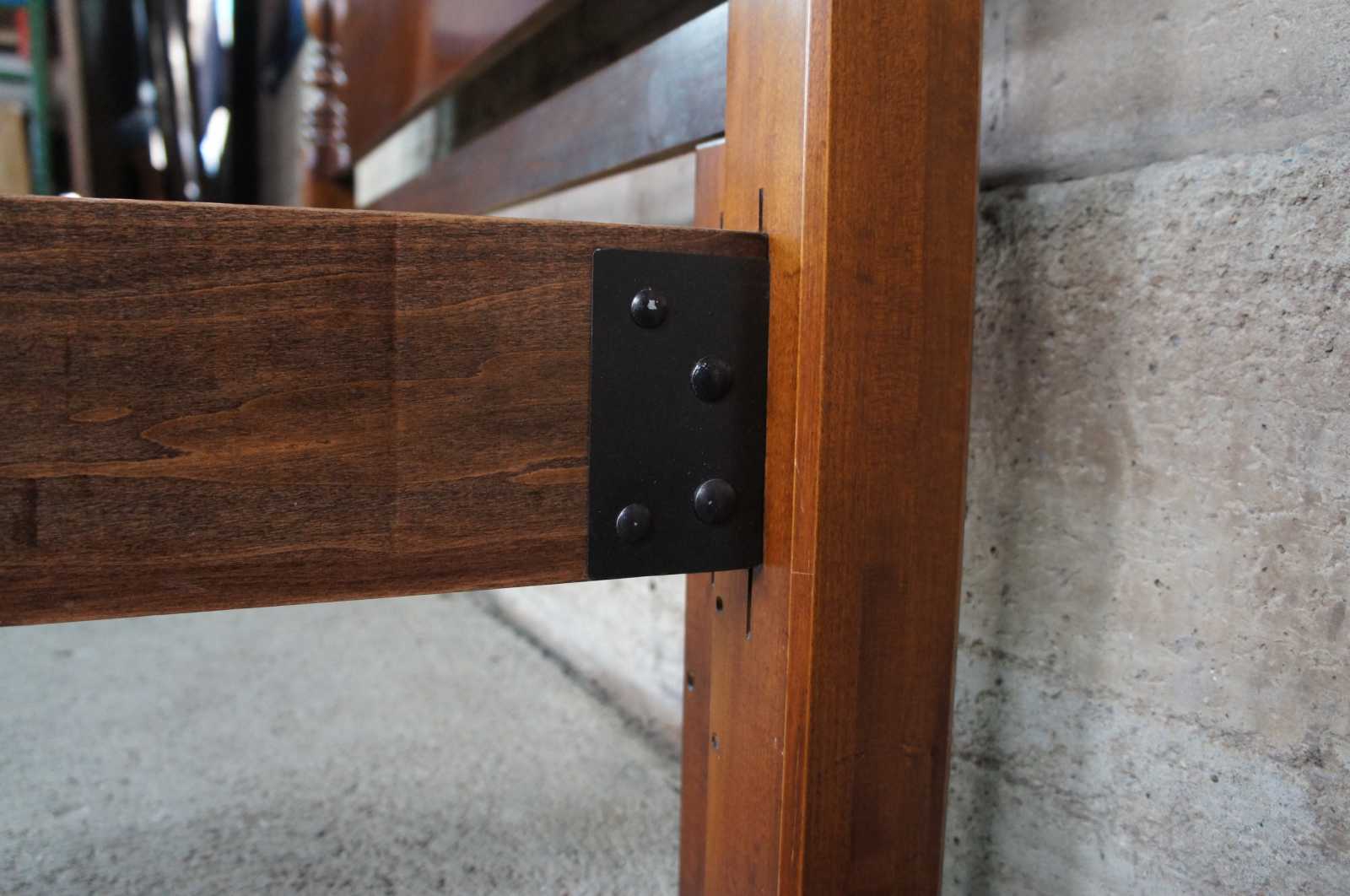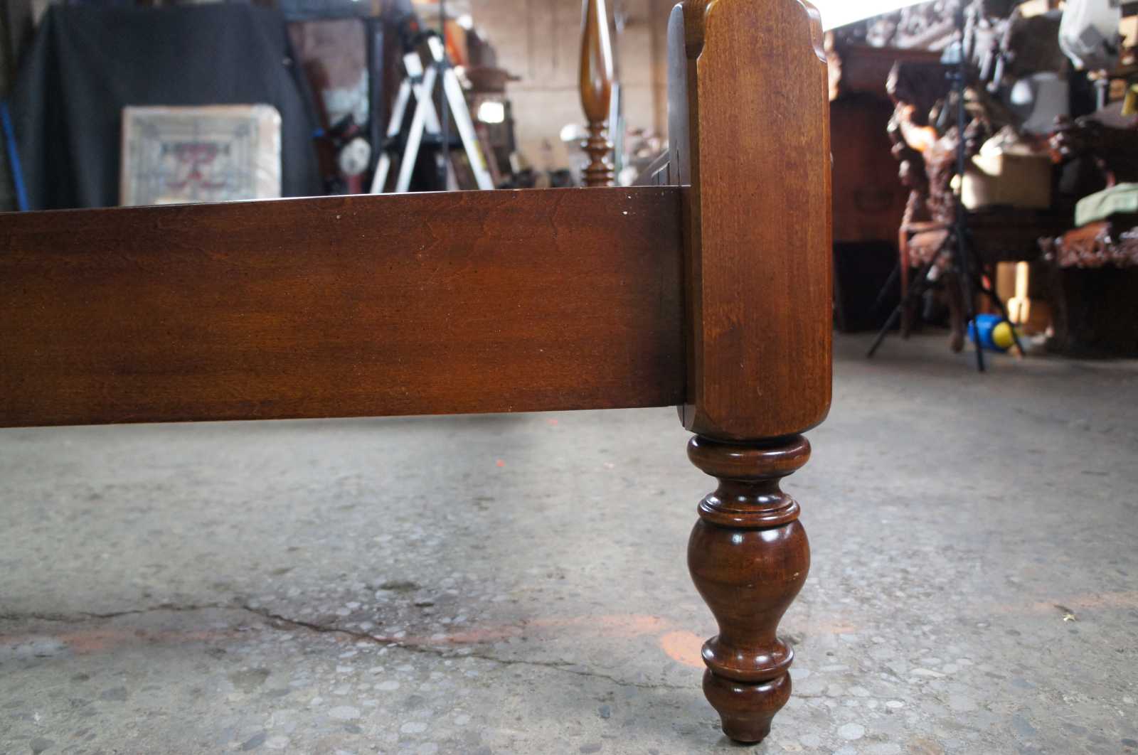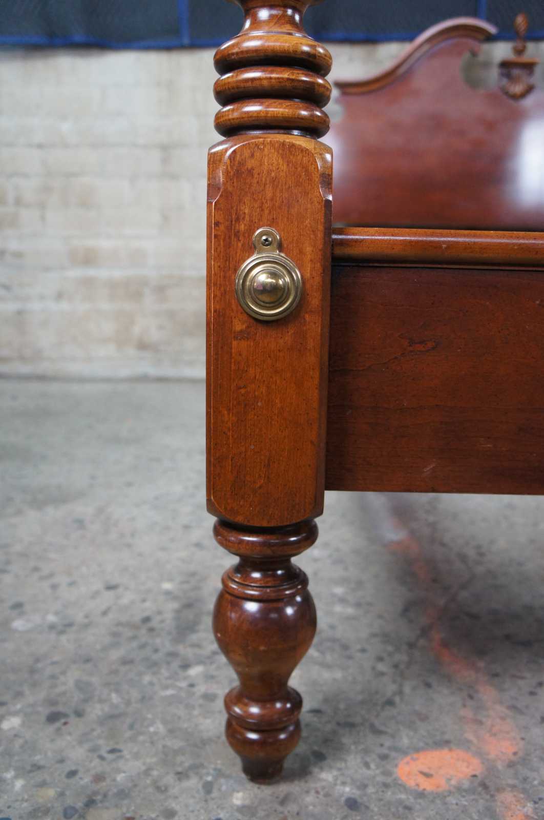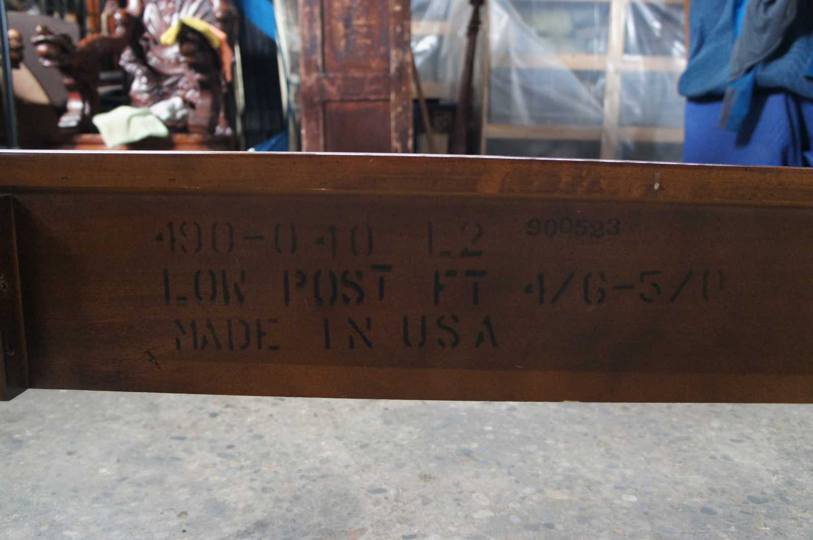 Vintage American Drew low post queen to full size bed. Made of solid cherry featuring serpentine form with open pediment, fluted and turned pine cone style finials and shell design.