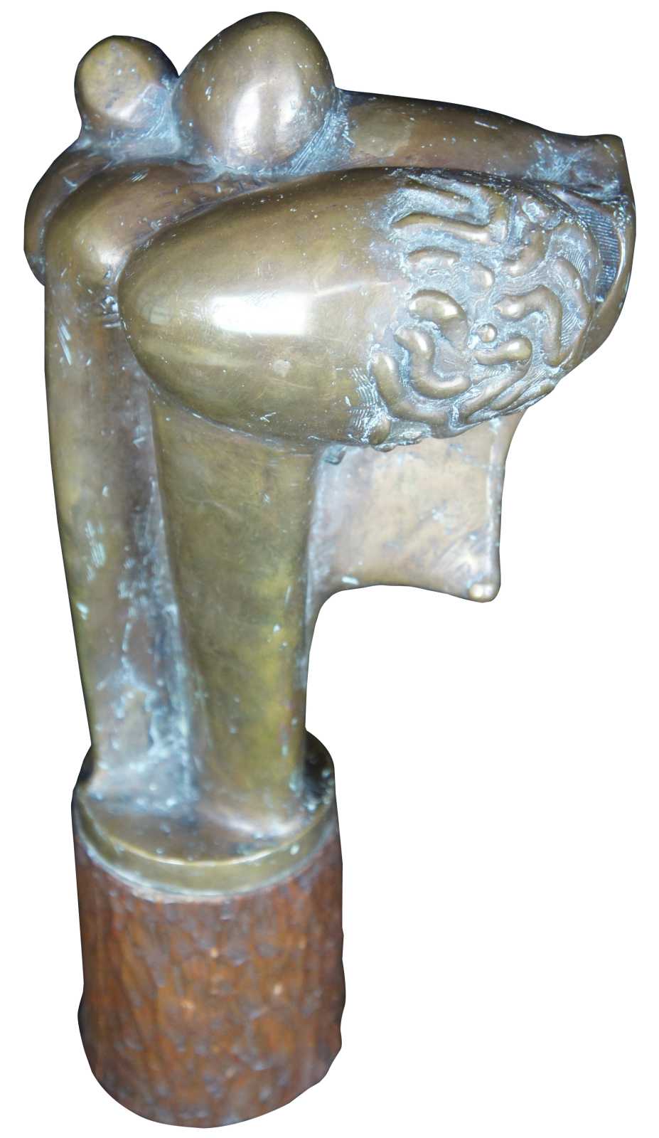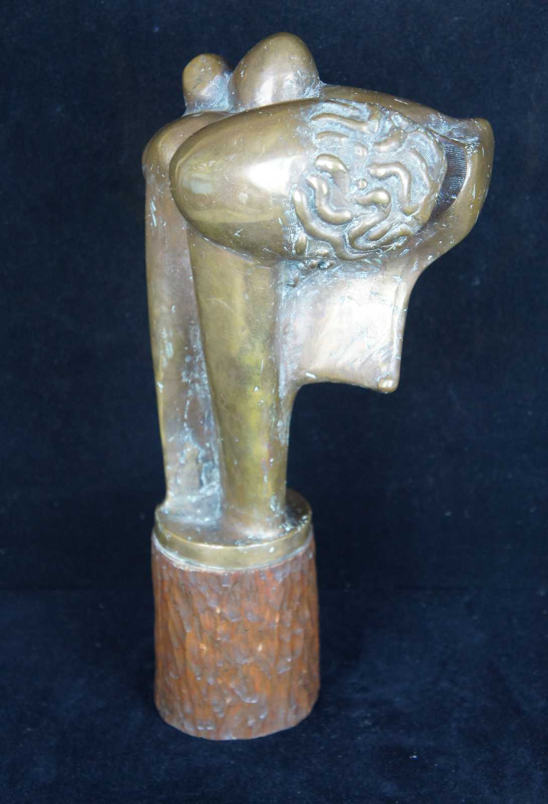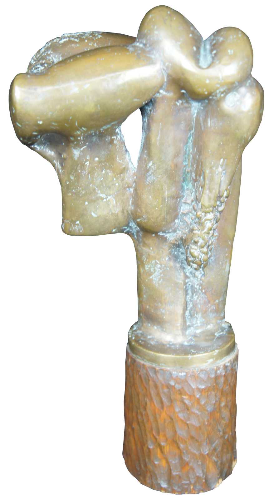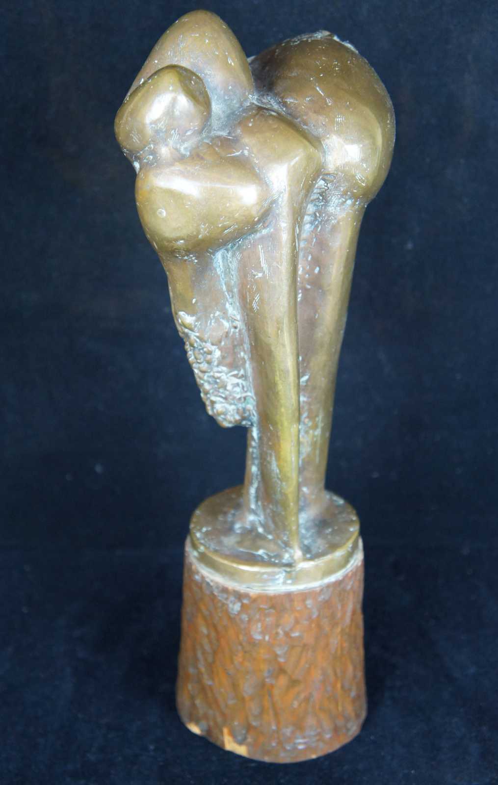 Mid century abstract bronze statue on wood base featuring brutalist style.