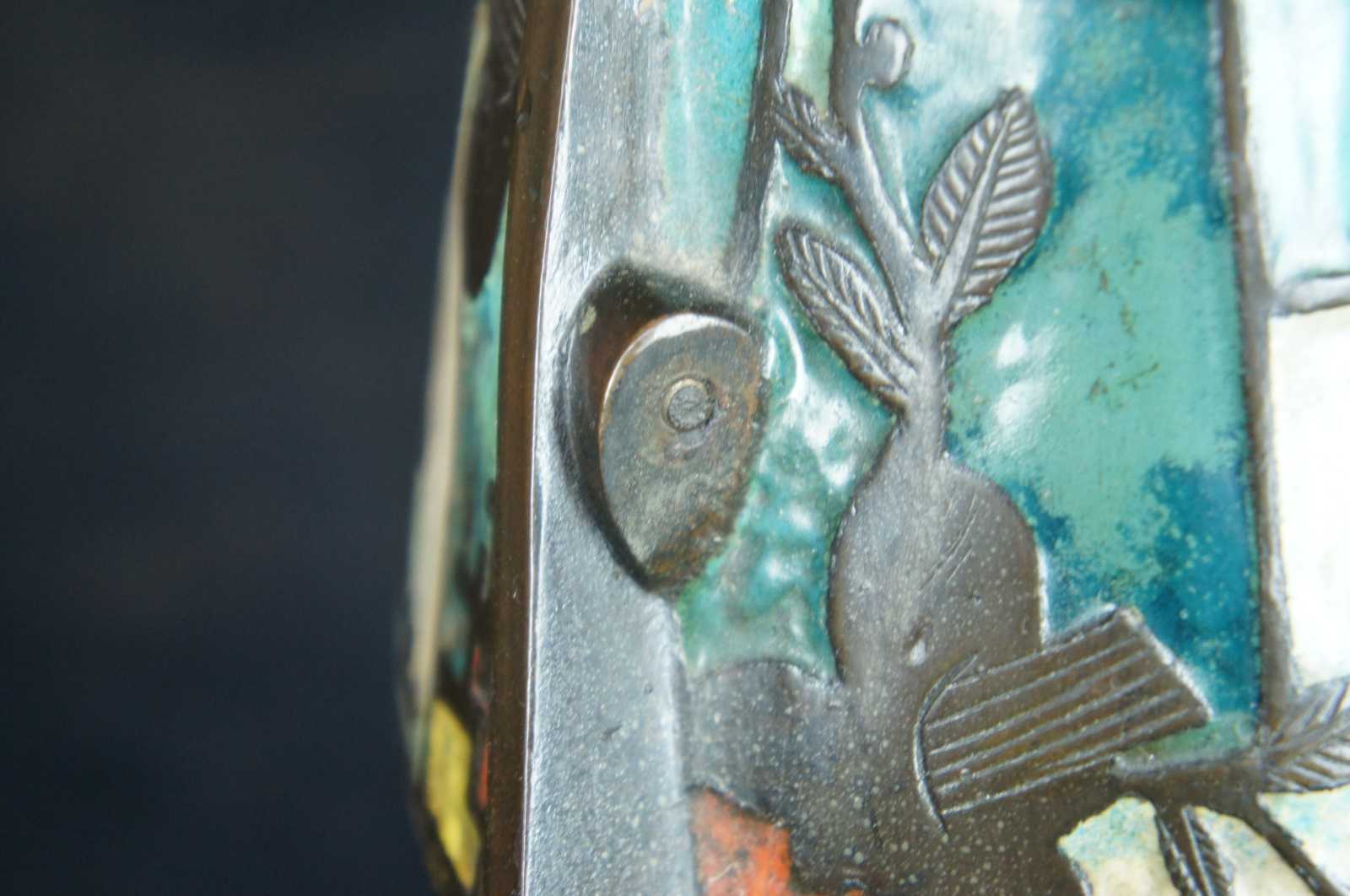 Exquisite antique French Art Deco statue of a woman. Made of heavy bronze with a graceful design. Features an outstretched neck, bob haircut and turned head. Dressed in a colorful enameled cloisonne cloak with floral motif and skirt. Rests upon a plinth base. Tag/stamp along underside.