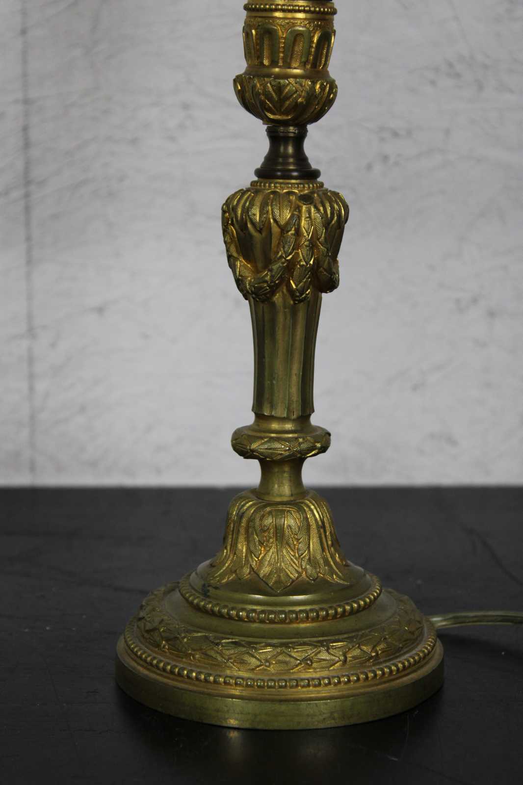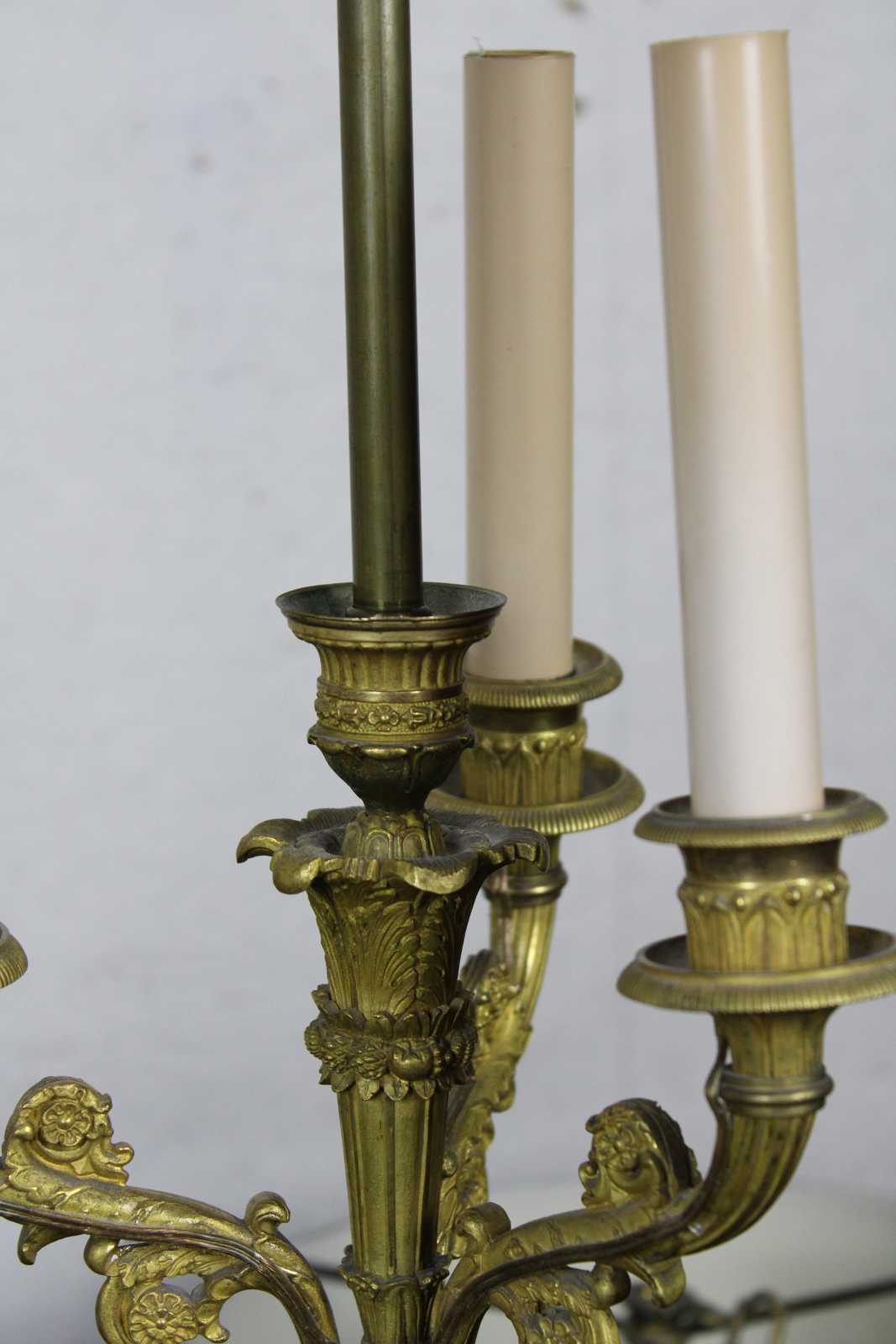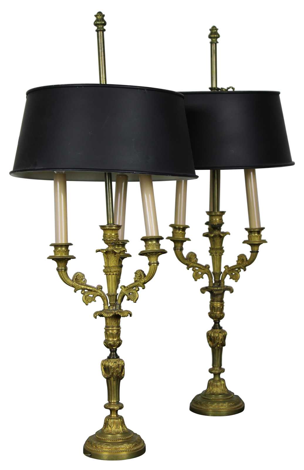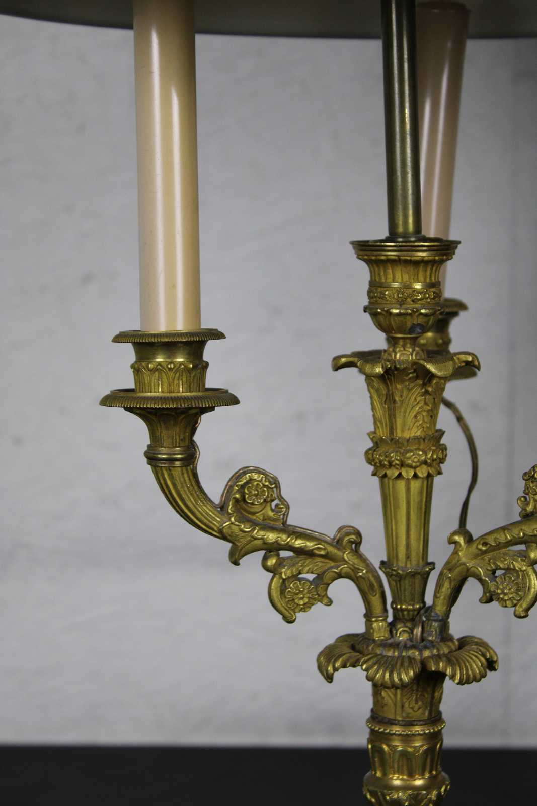 Two antique 19th century French gilt candelabra lamps featuring five arms with floral design, acanthus leaves, beading and metal tole shades. Converted to electric.
