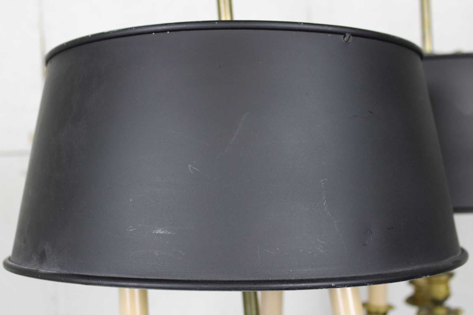 Fair condition, wear and distressing commensurate with age and use, converted to electric, bent arms, one shade support does not remove, loose wire.