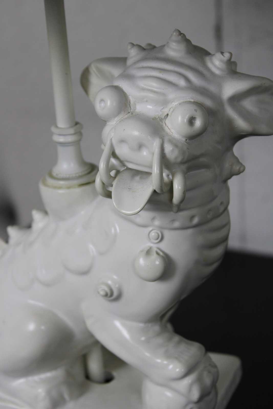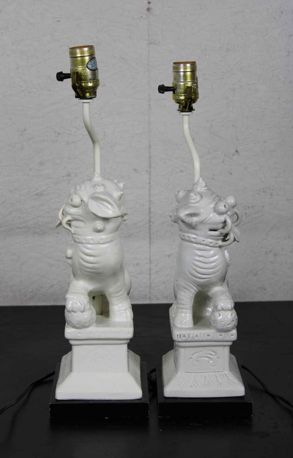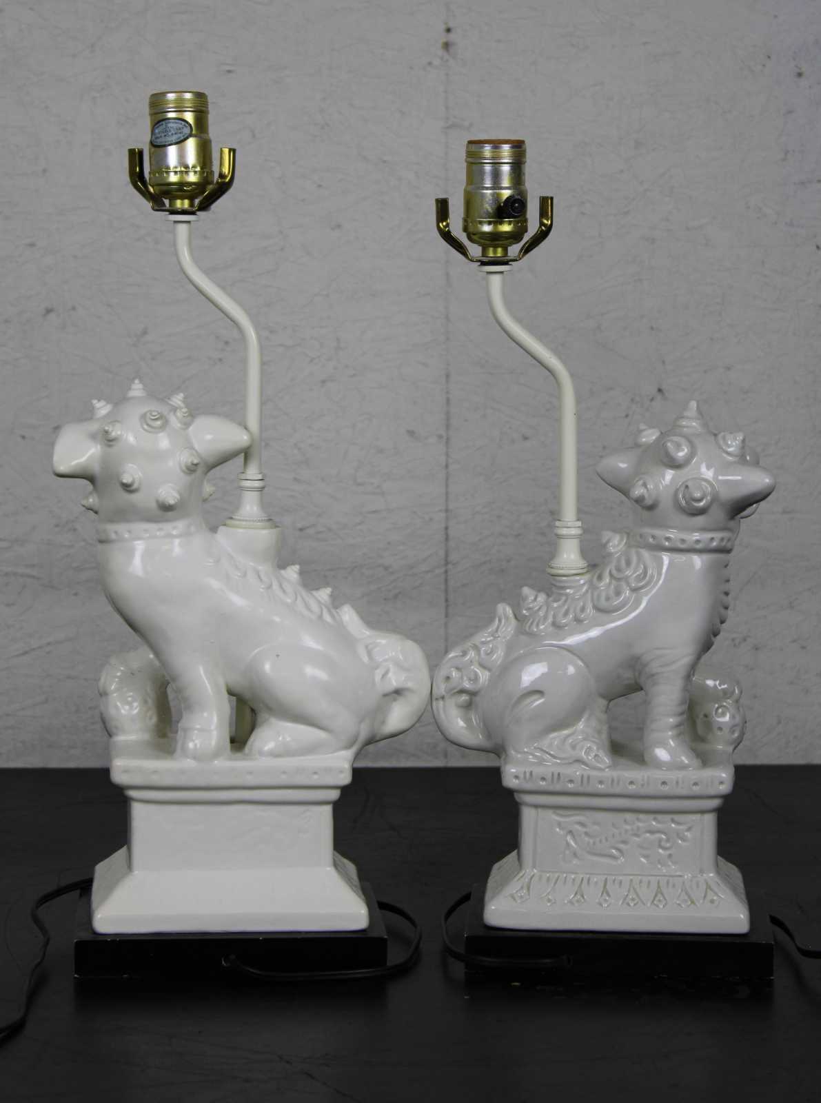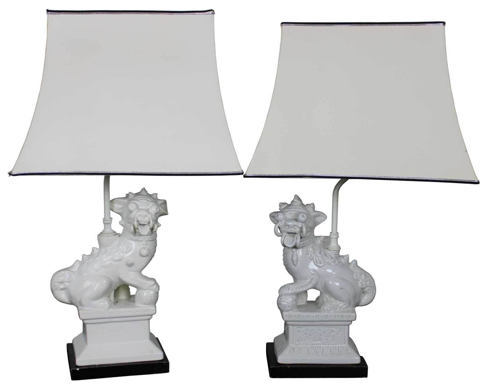 Two vintage Chinese Blanc De Chine white Dehua provence foo dog lamps. Made of white porcelain featuring ornate guardian dogs with wide eyes and ornate tusks