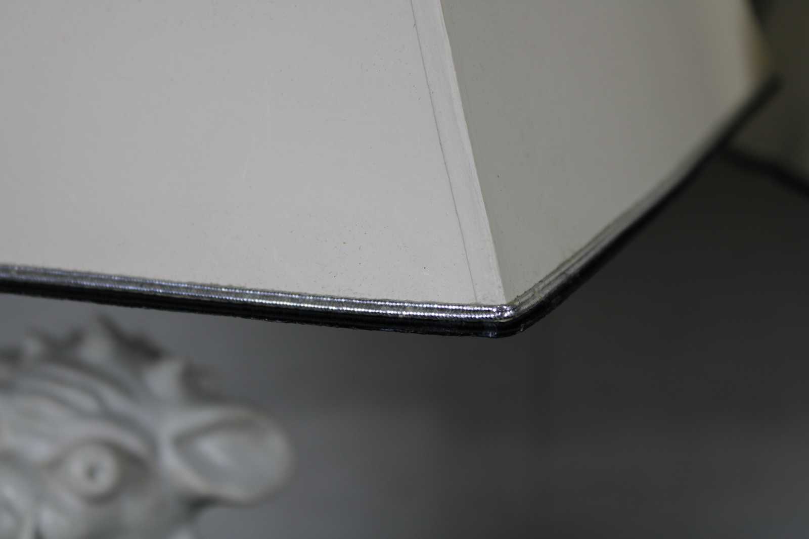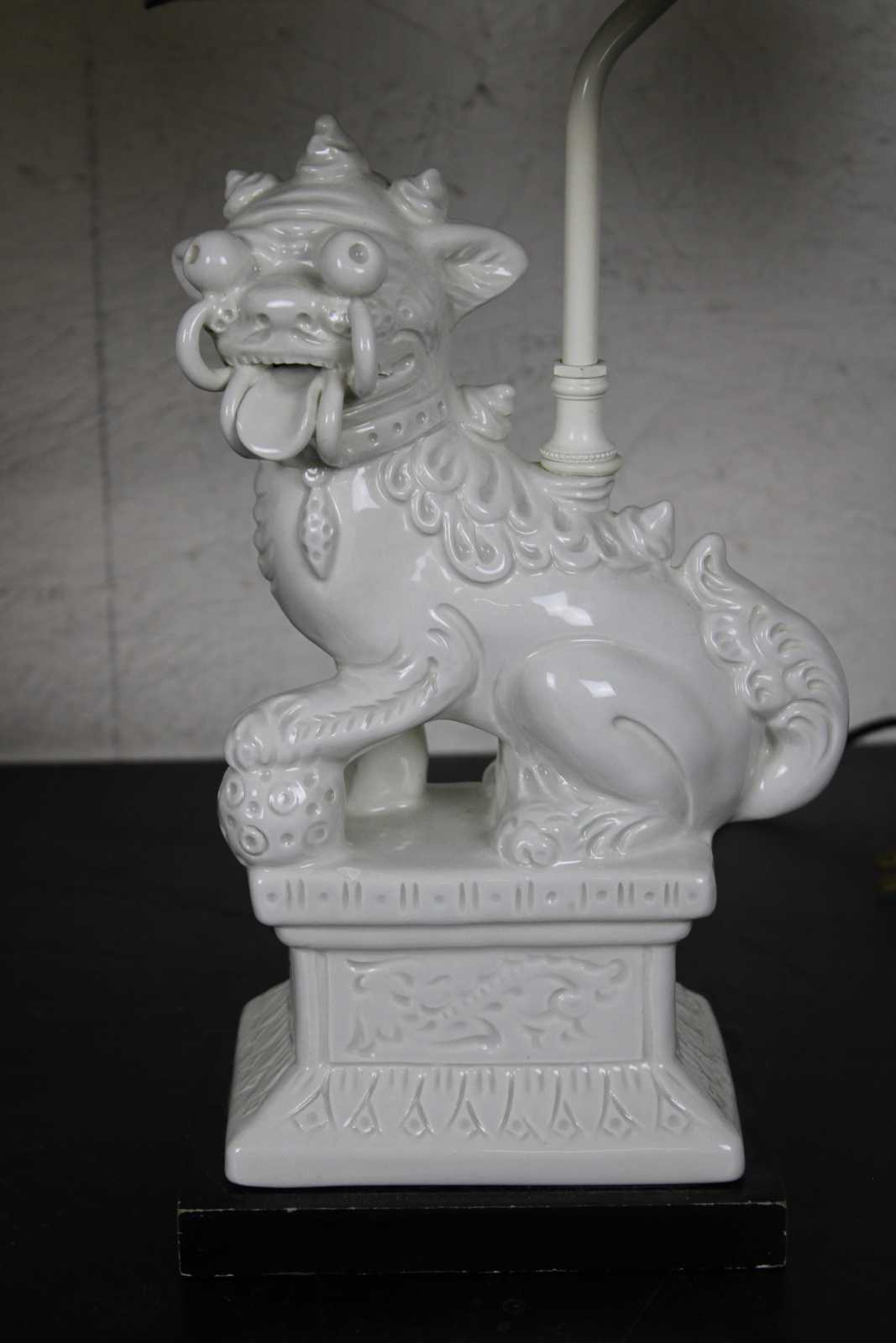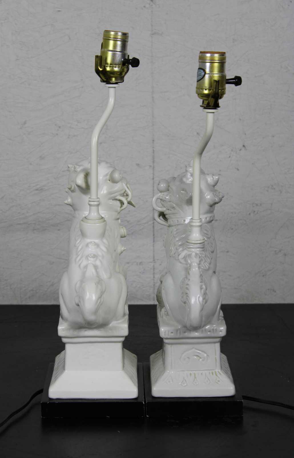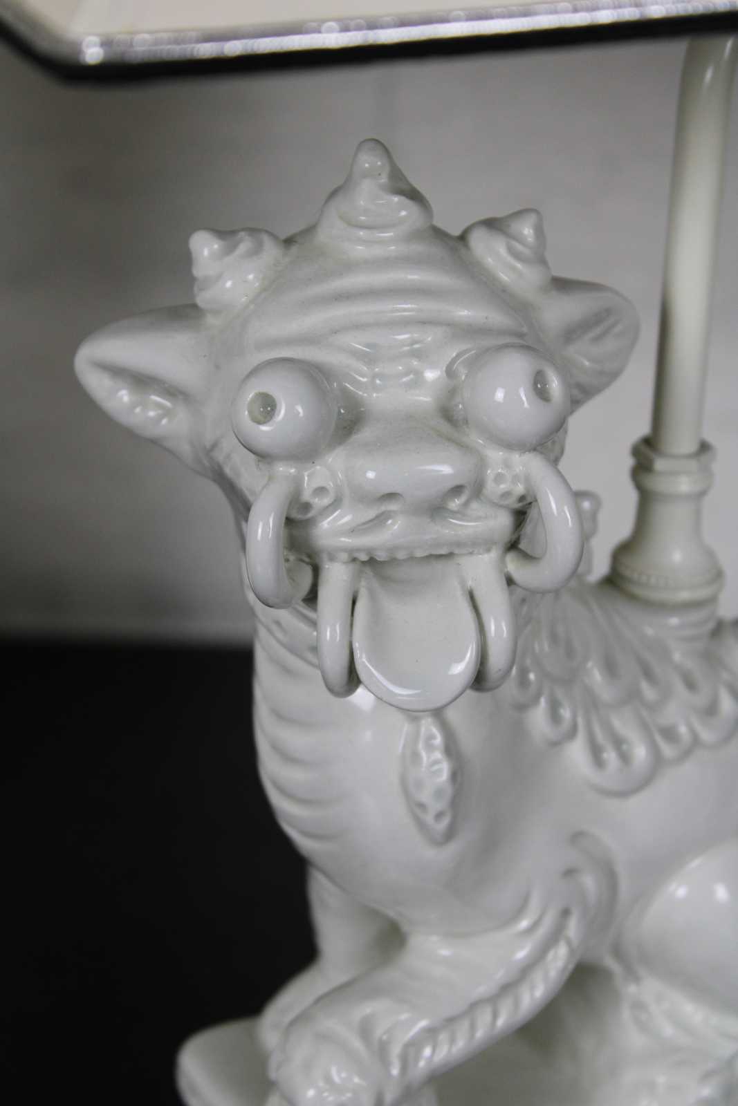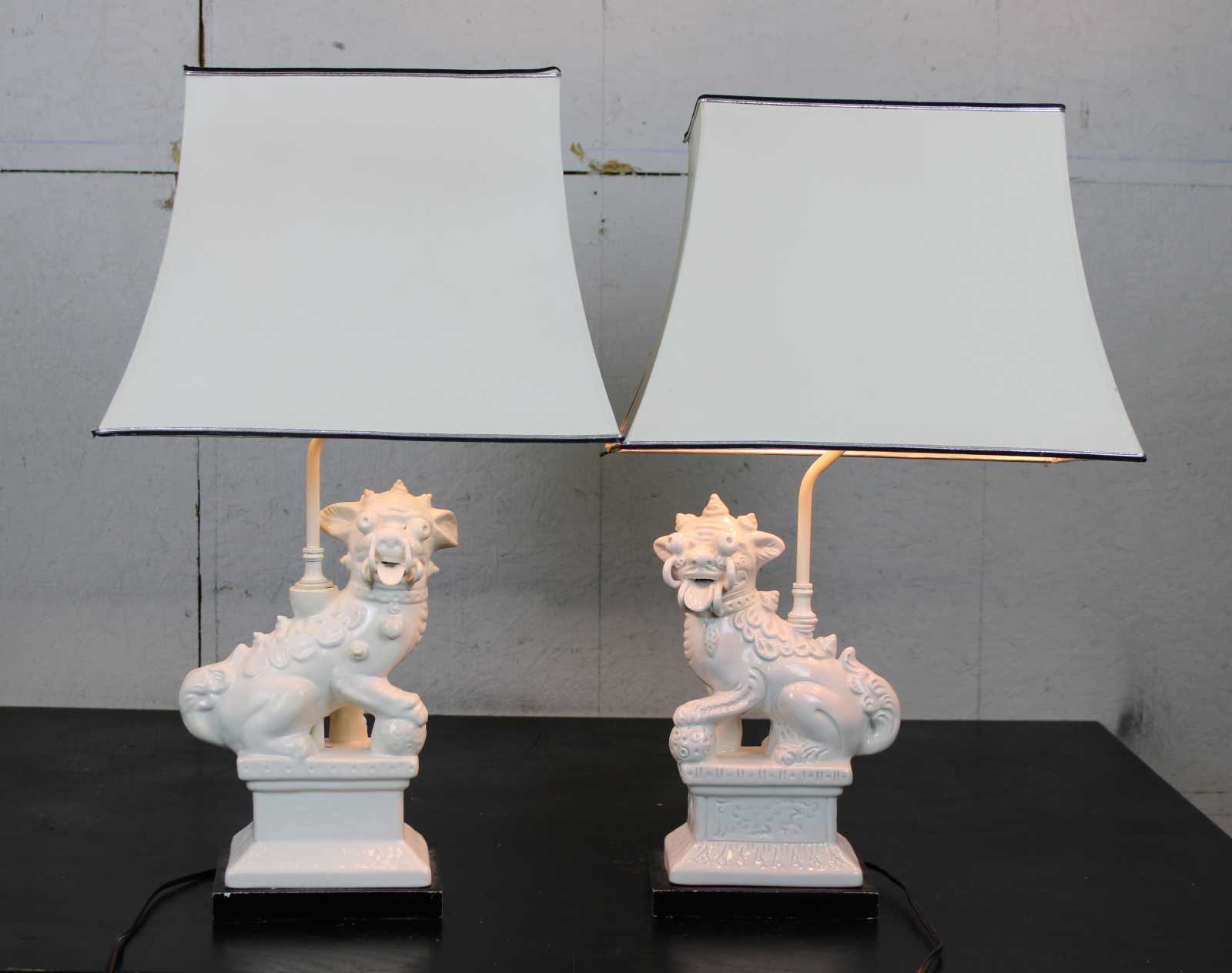 Two vintage Chinese Blanc De Chine white Dehua provence foo dog lamps. Made of white porcelain featuring ornate guardian dogs with wide eyes and ornate tusks