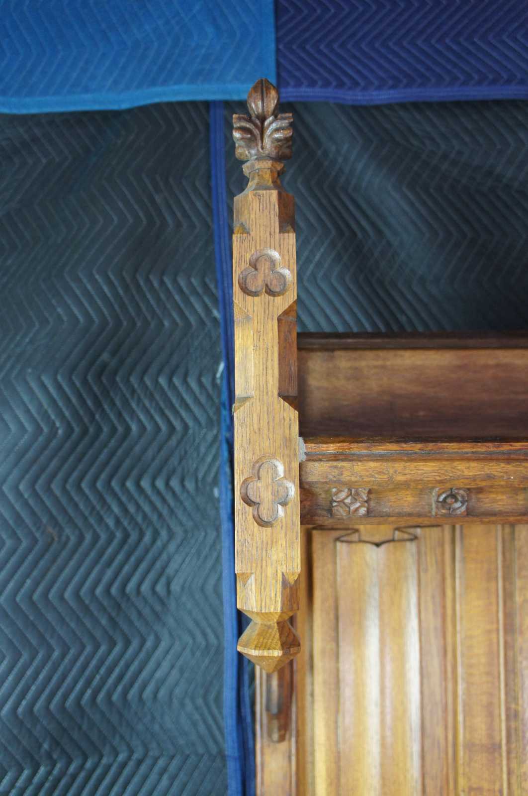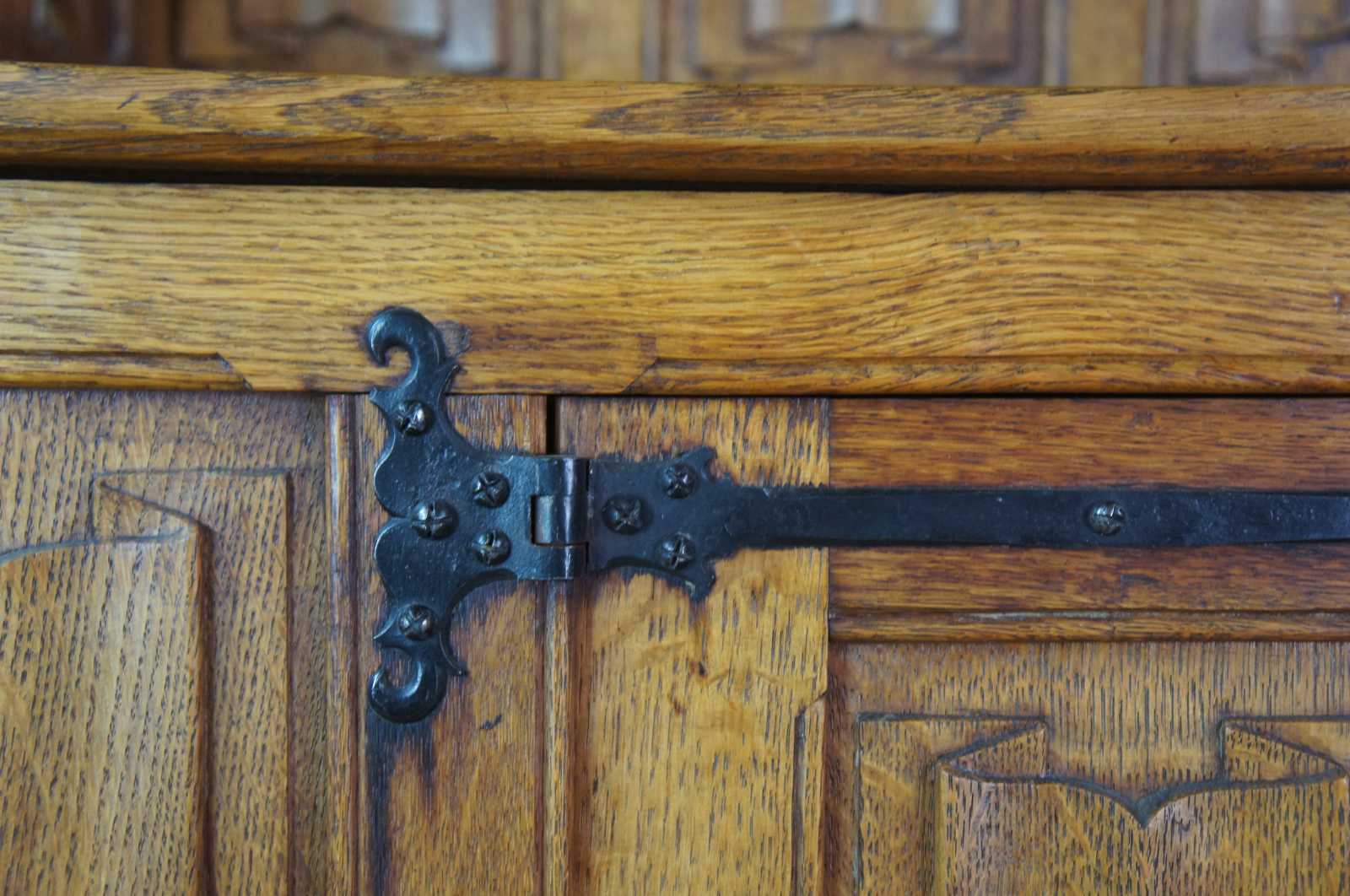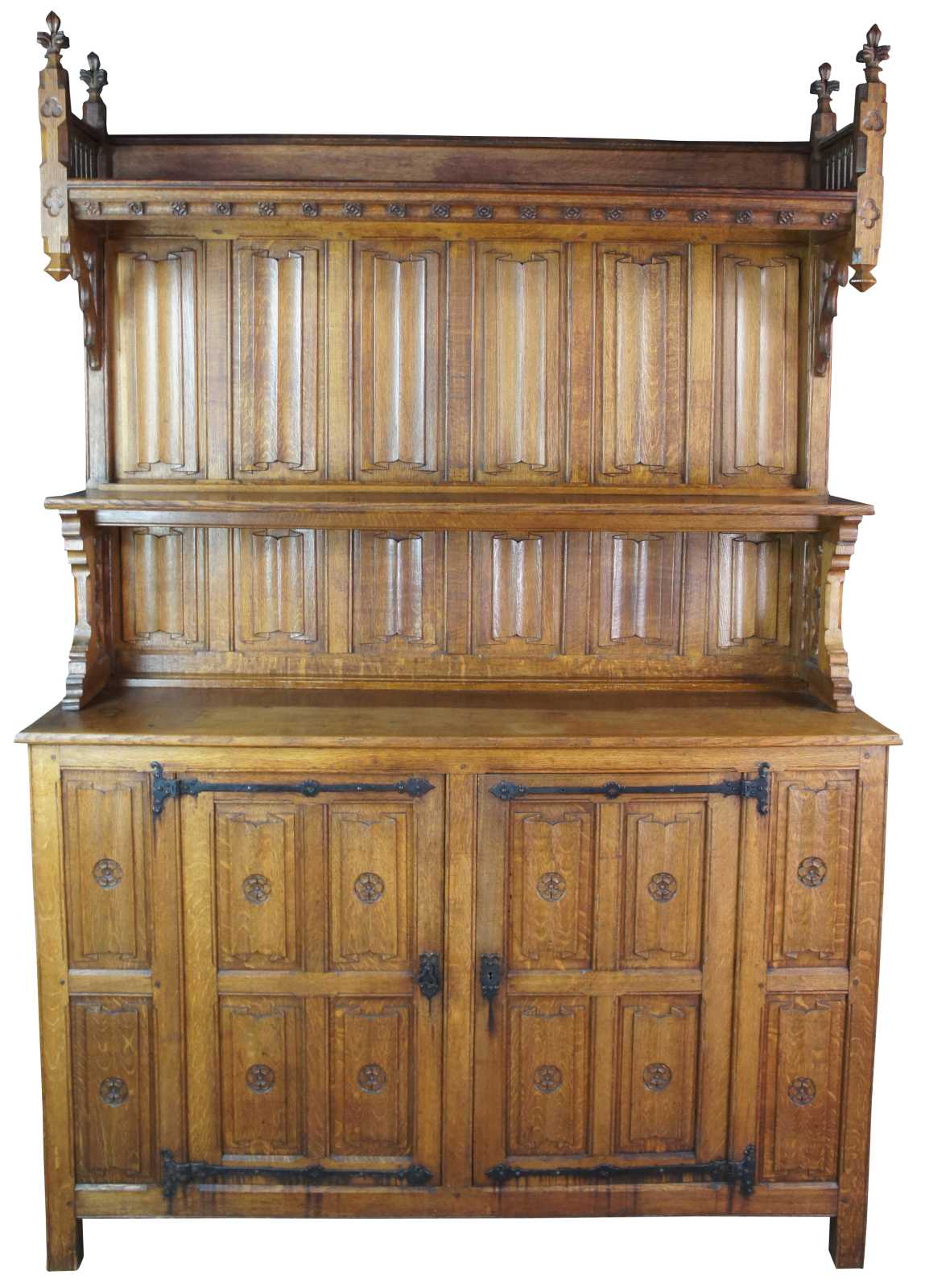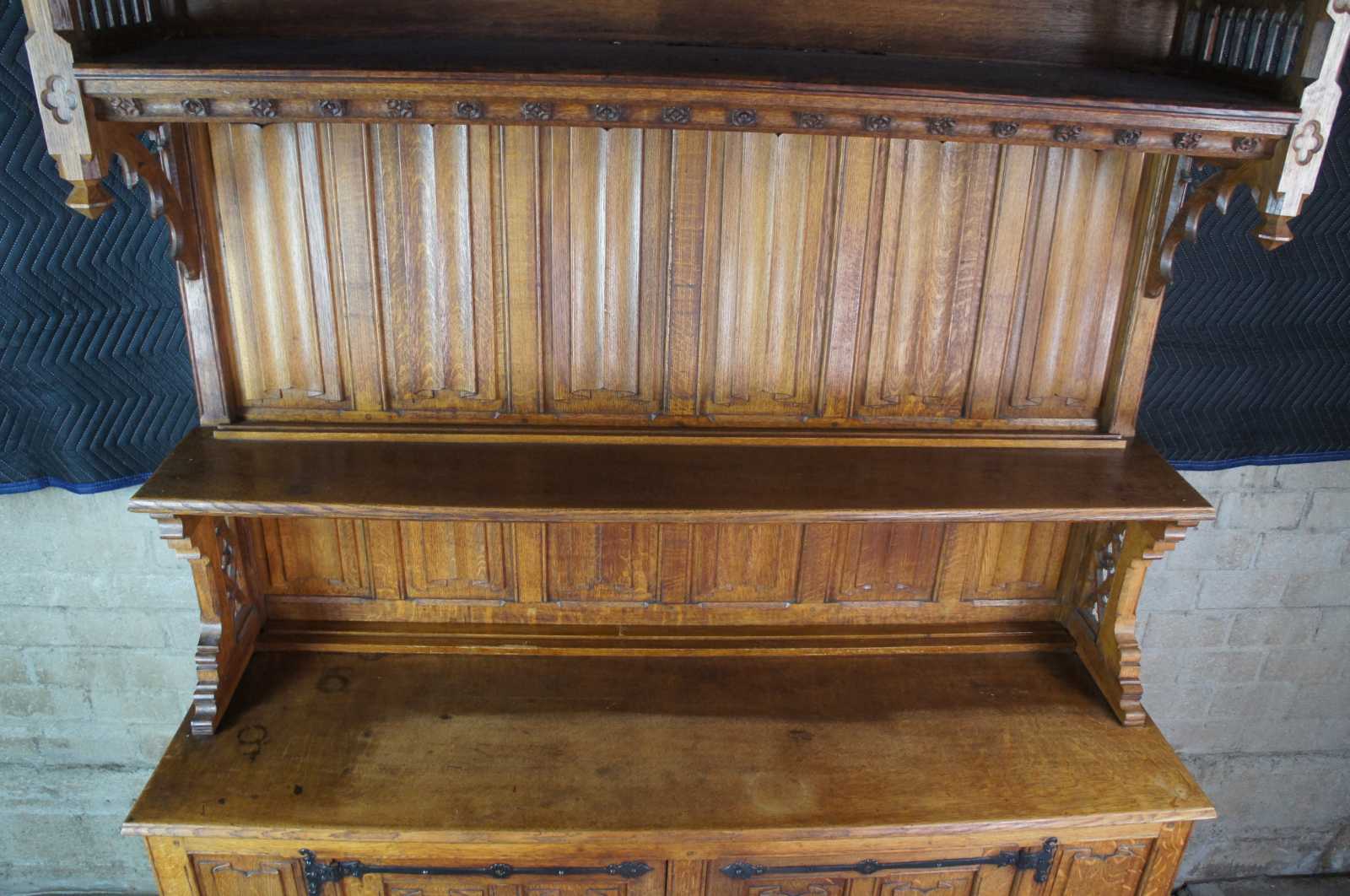 Monumental antique French Gothic Revival Vaisselier, bar back, server, buffet, sideboard or cupboard. Made of oak featuring paneled linen fold designs with fleur de lis finials, reticulated fretwork, plate grooves and hammered iron hardware.