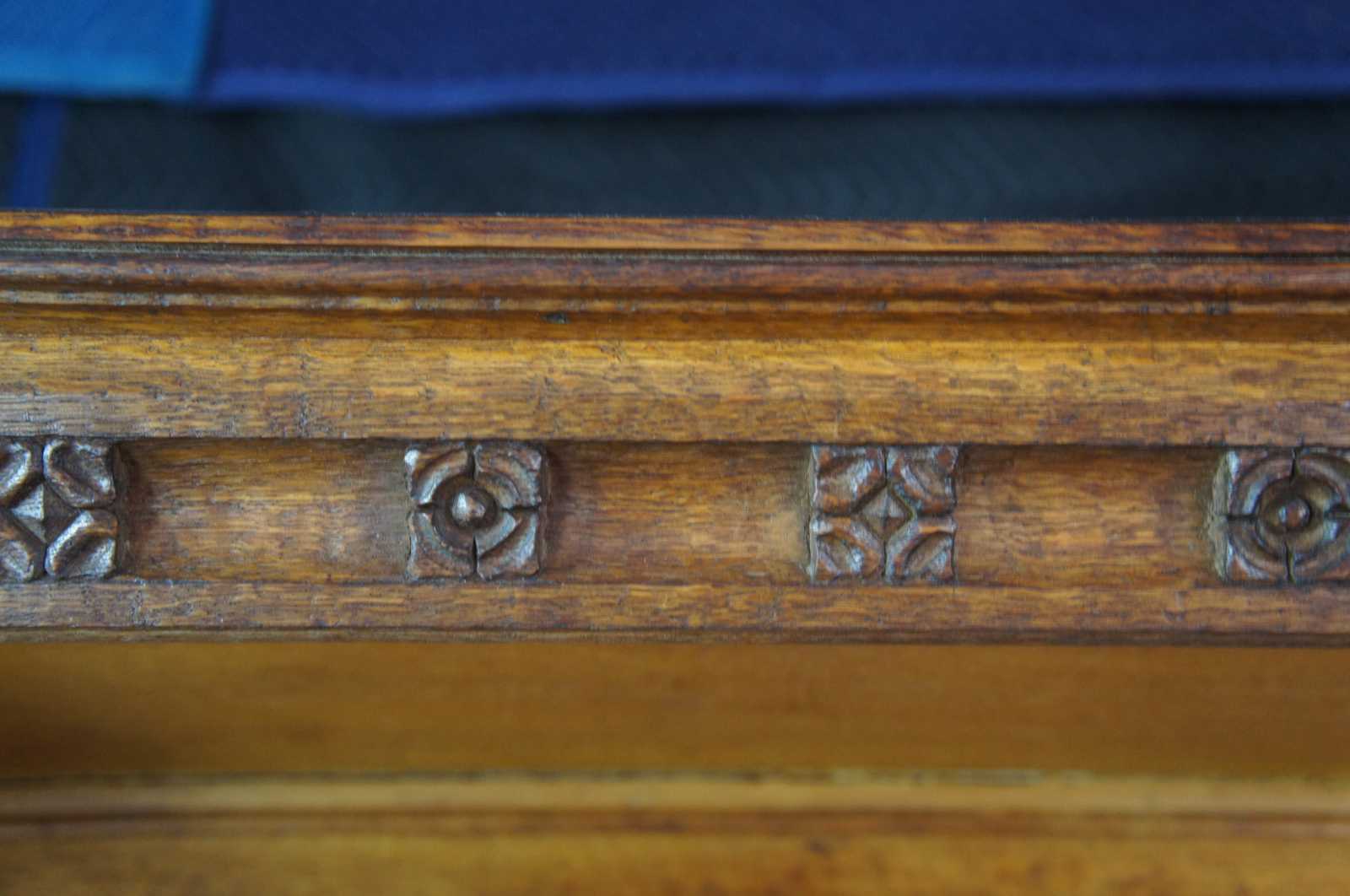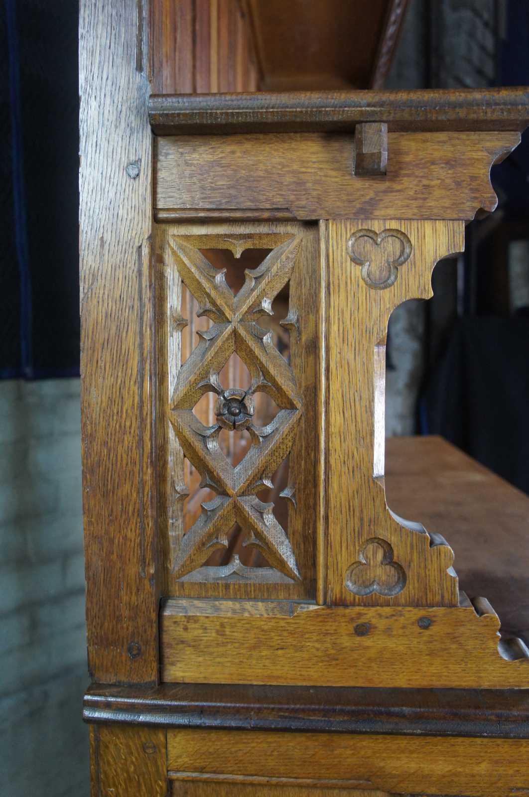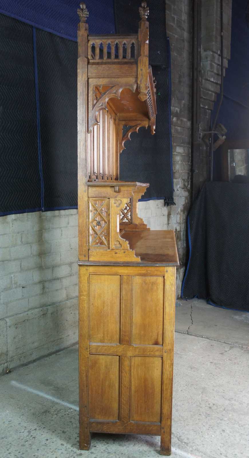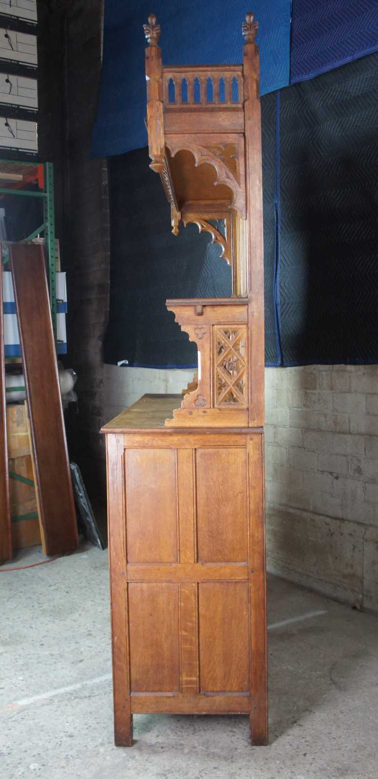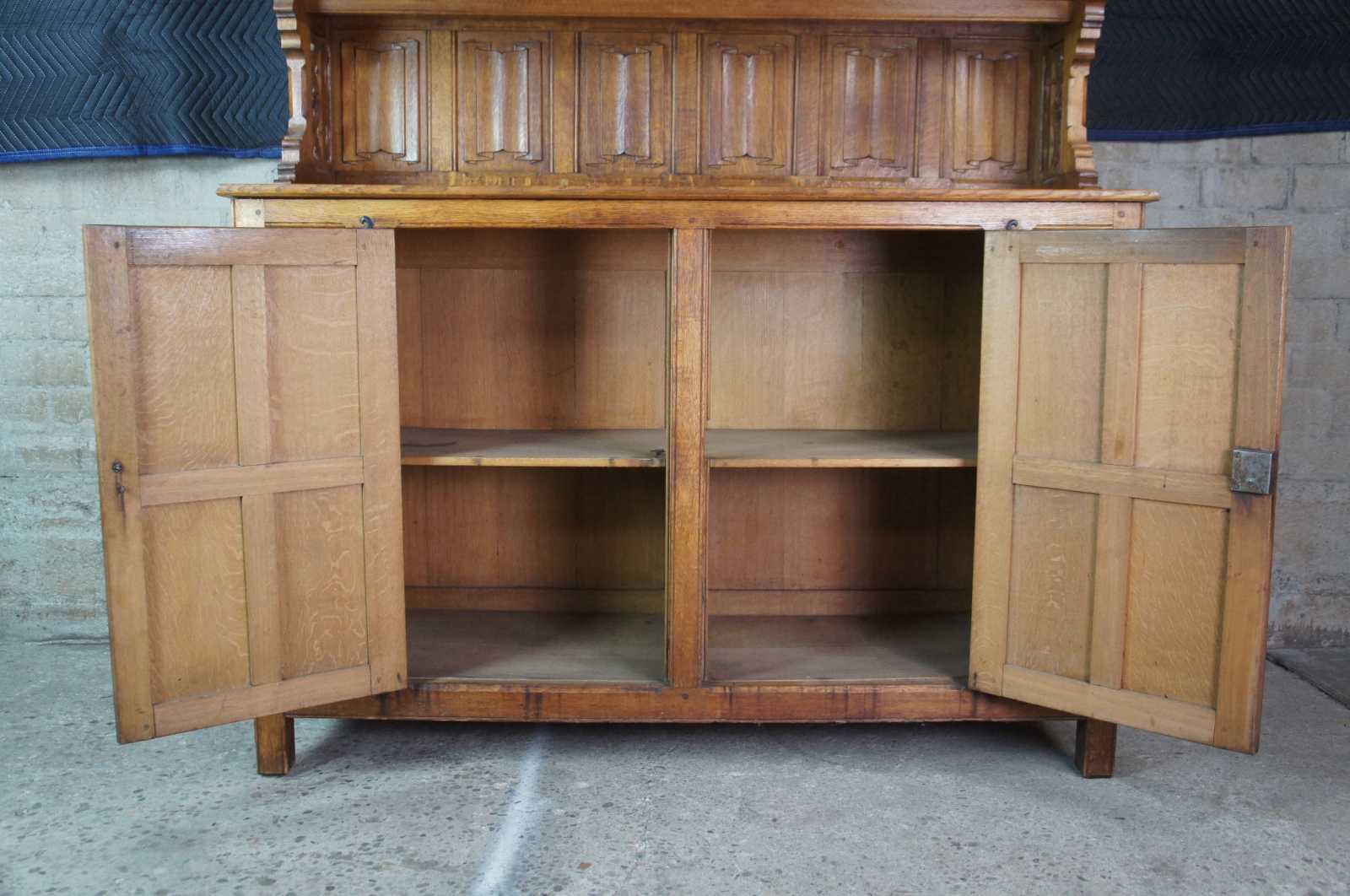 Monumental antique French Gothic Revival Vaisselier, bar back, server, buffet, sideboard or cupboard. Made of oak featuring paneled linen fold designs with fleur de lis finials, reticulated fretwork, plate grooves and hammered iron hardware.