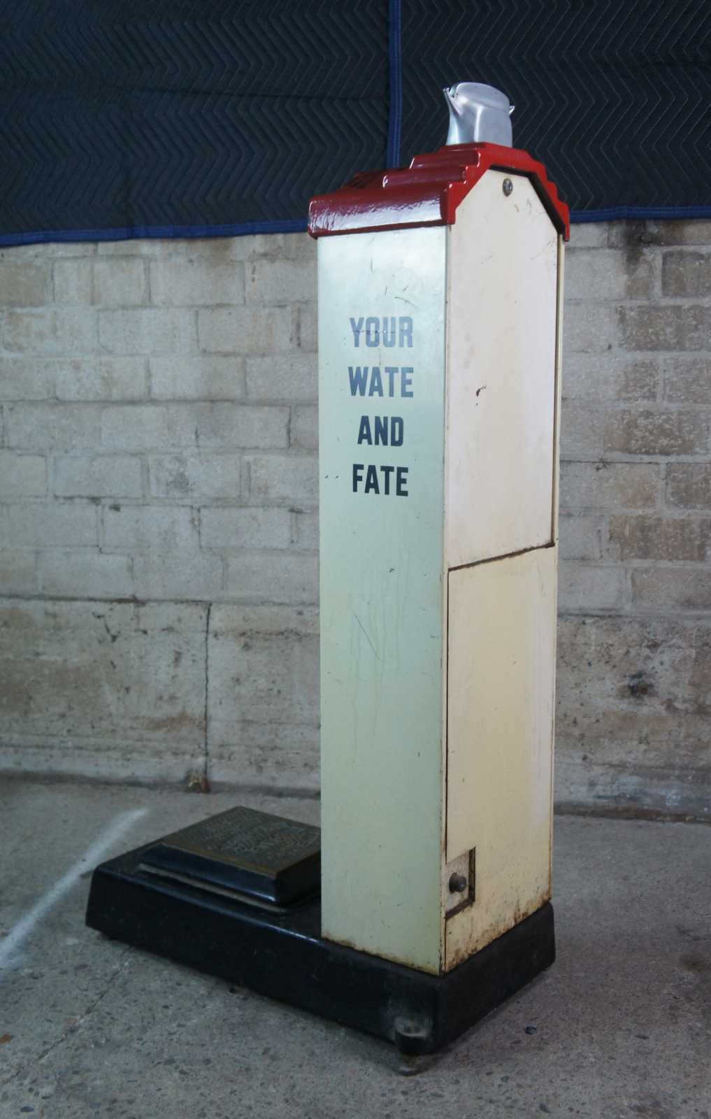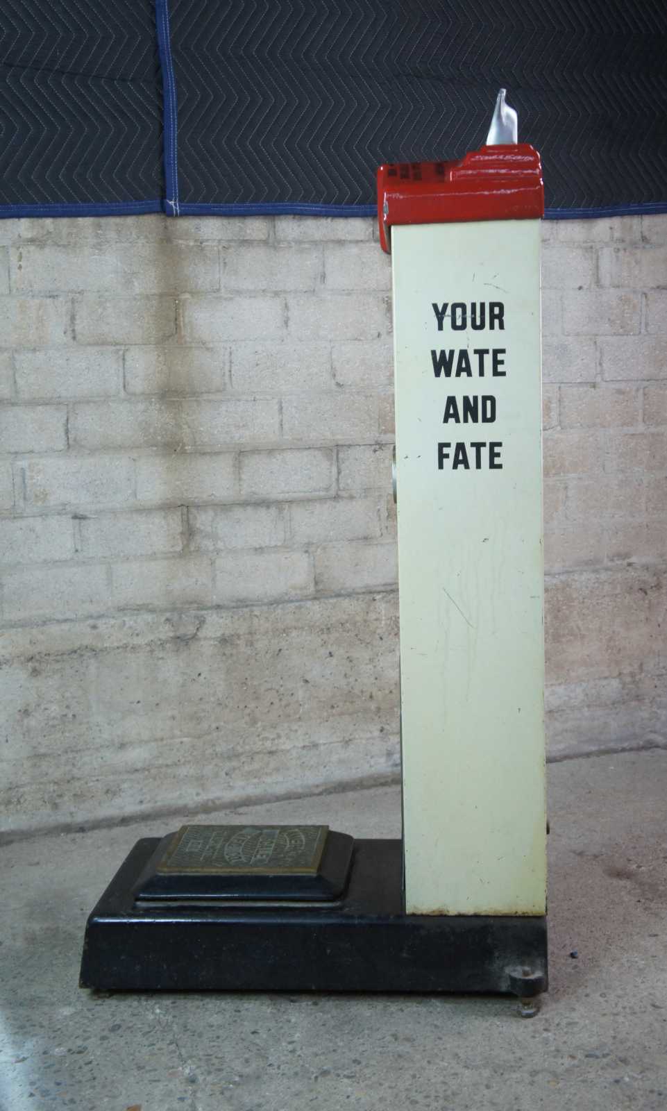 Antique Art Deco fortune penny weight scale from the American Scale Mfg. Co. of Washington DC. Made of enameled metal and brass featuring coin operated system that offers your "wate", fate and fortune / future character readings.