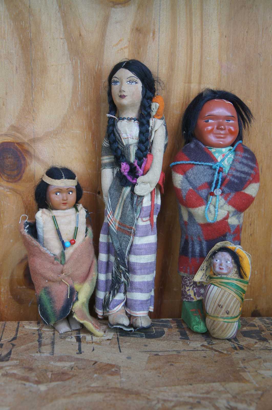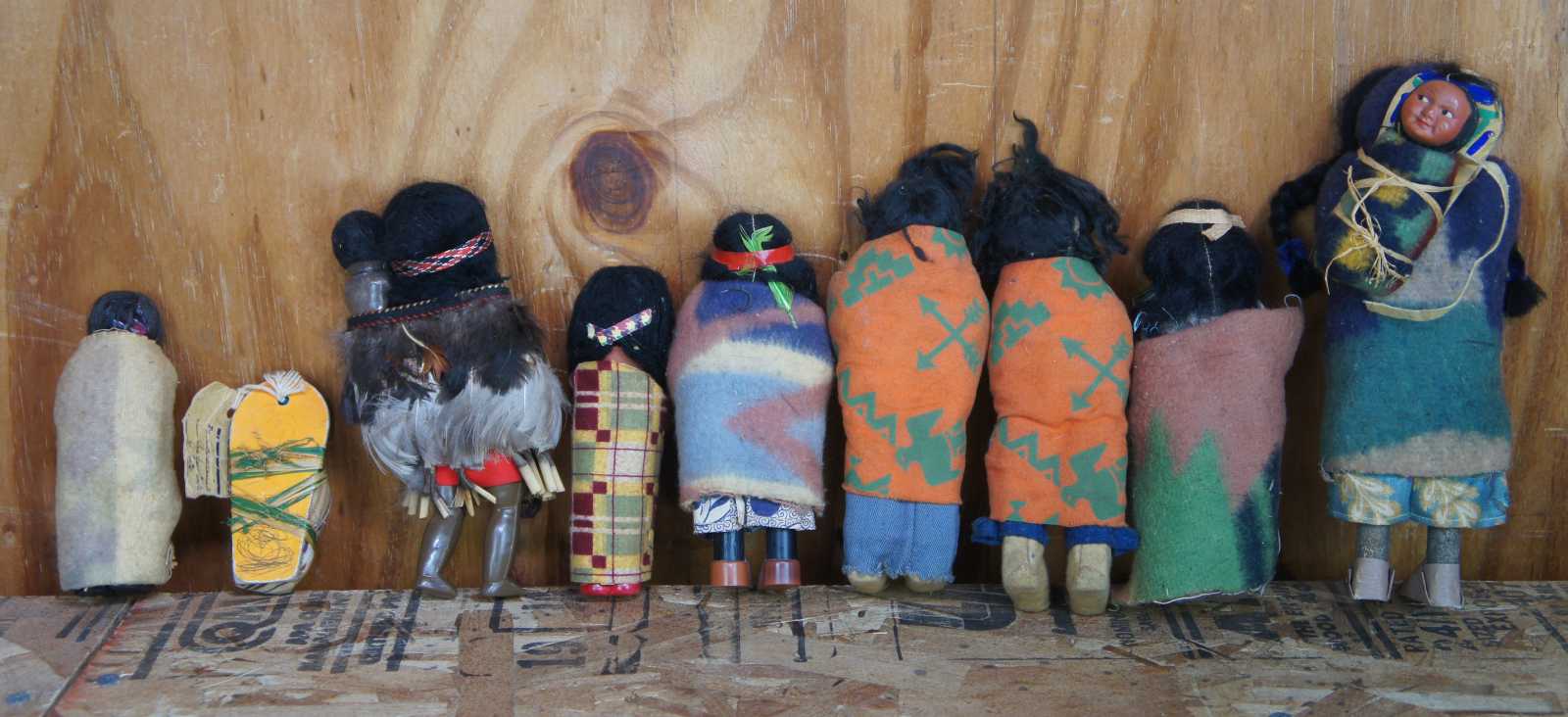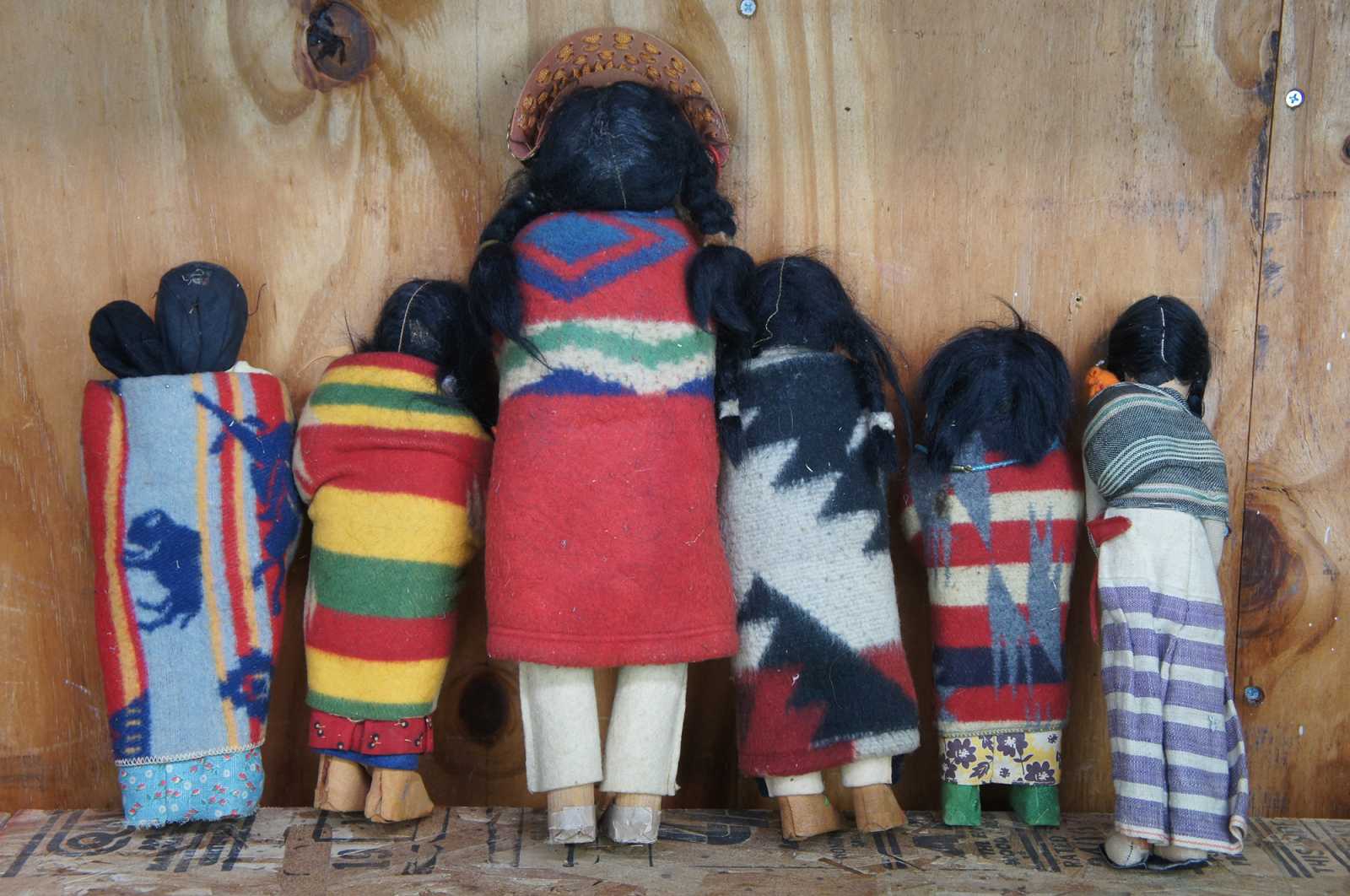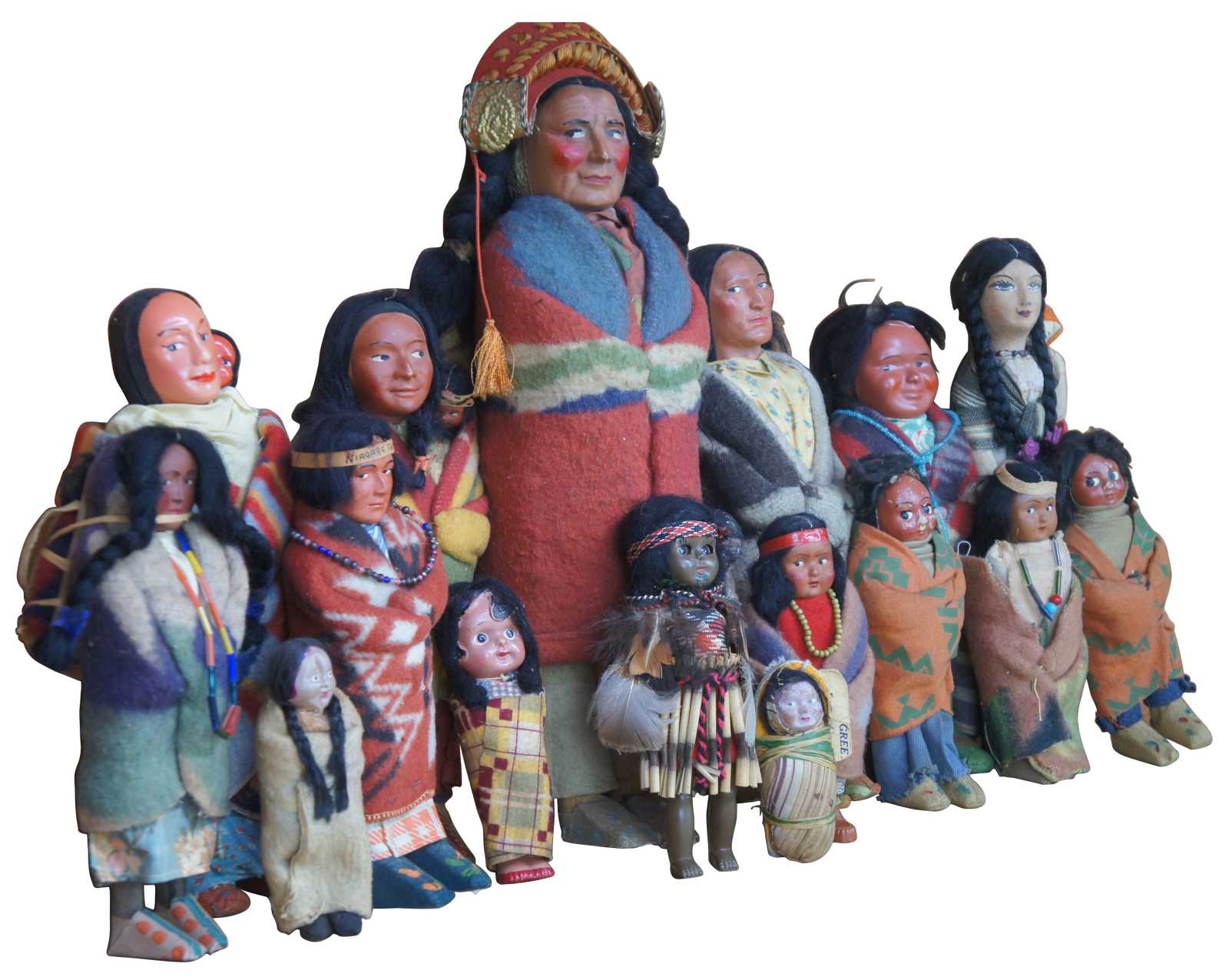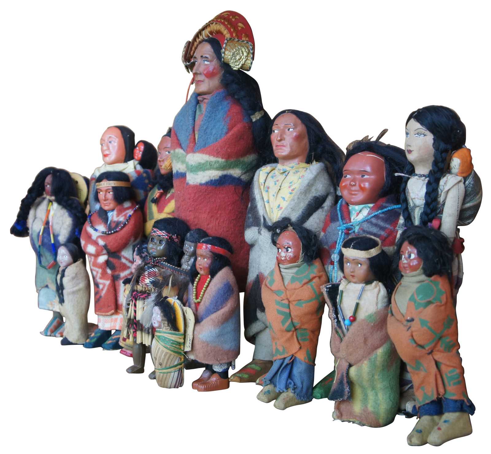 Lot of 16 antique Native American Skookum dolls featuring men, women, children and babies wearing traditional wool clothing with beaded accents, headdresses and tapestry blankets.