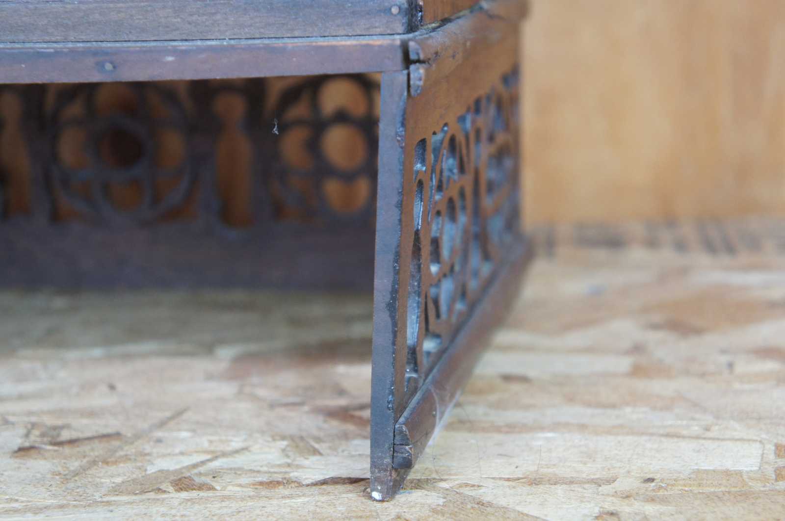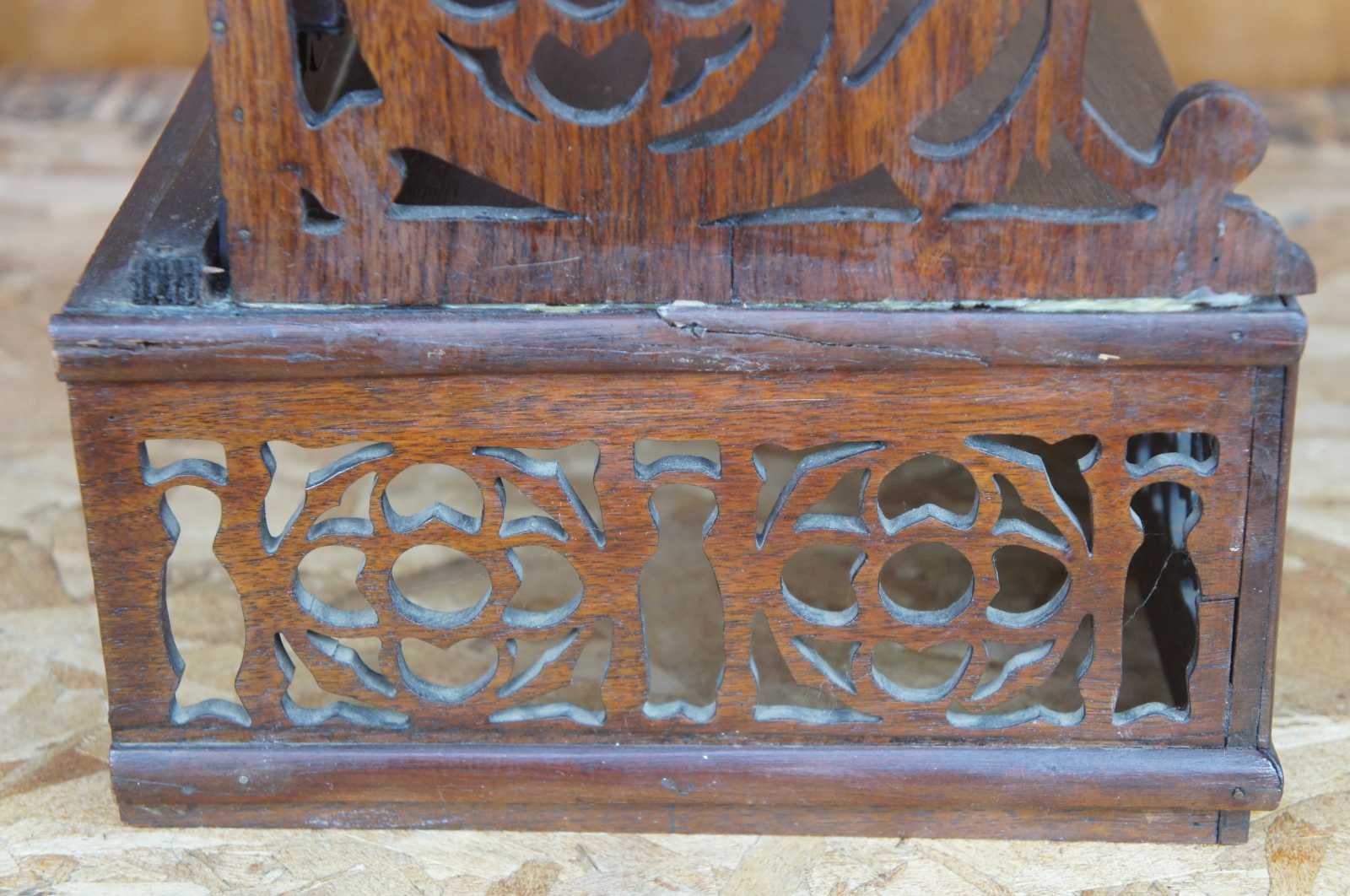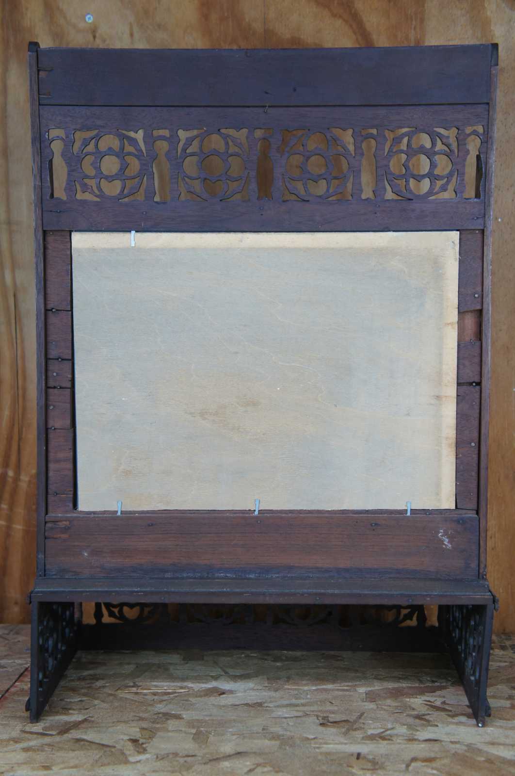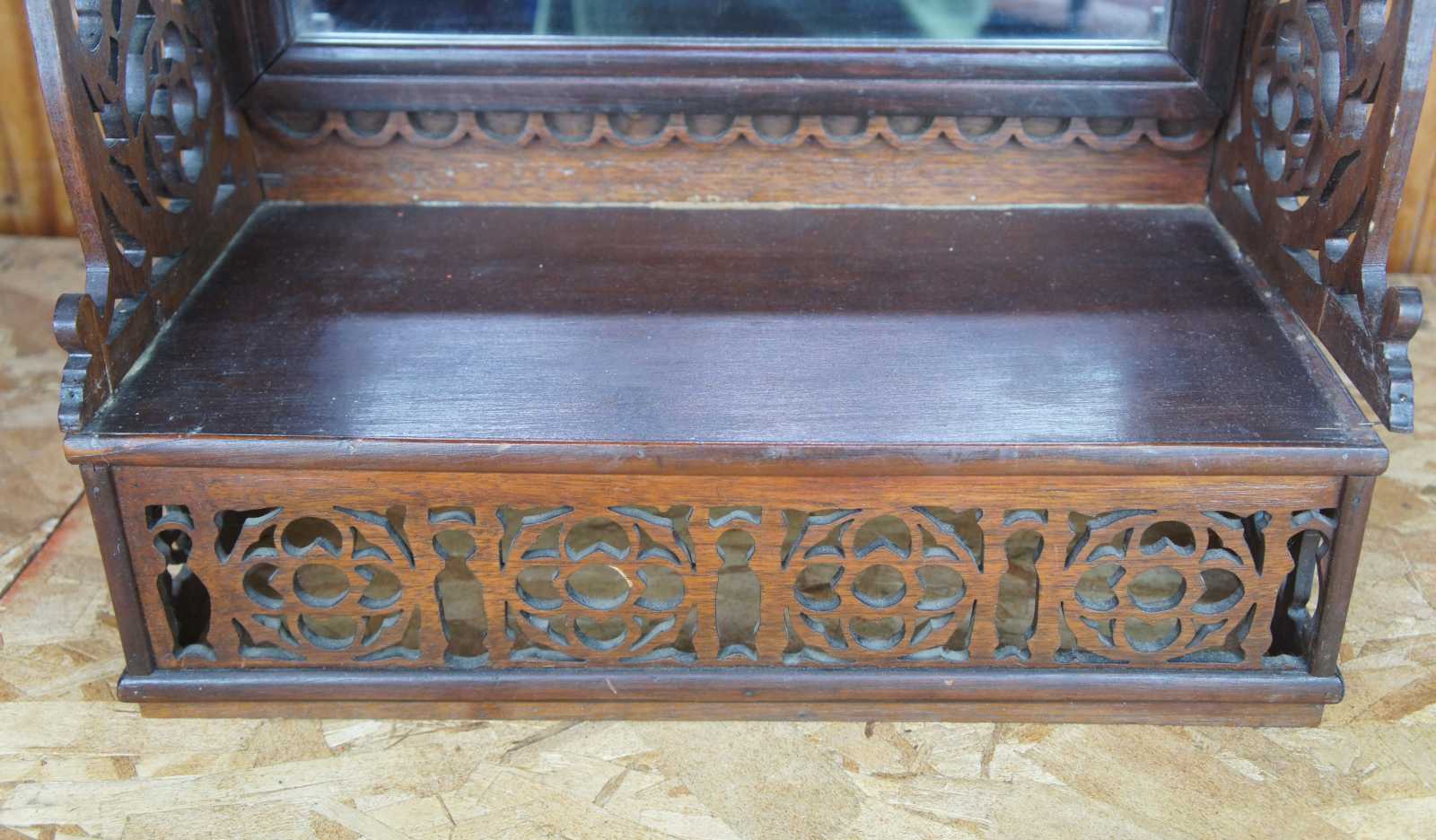 antique reticulated or pierced desktop vanity mirror with shelf. Features ornate carvings with dragon motif.