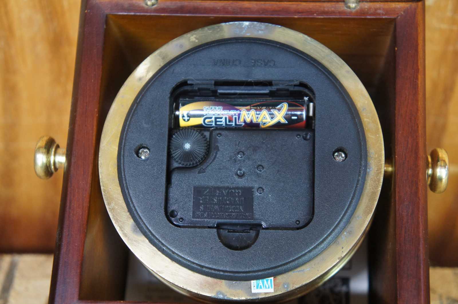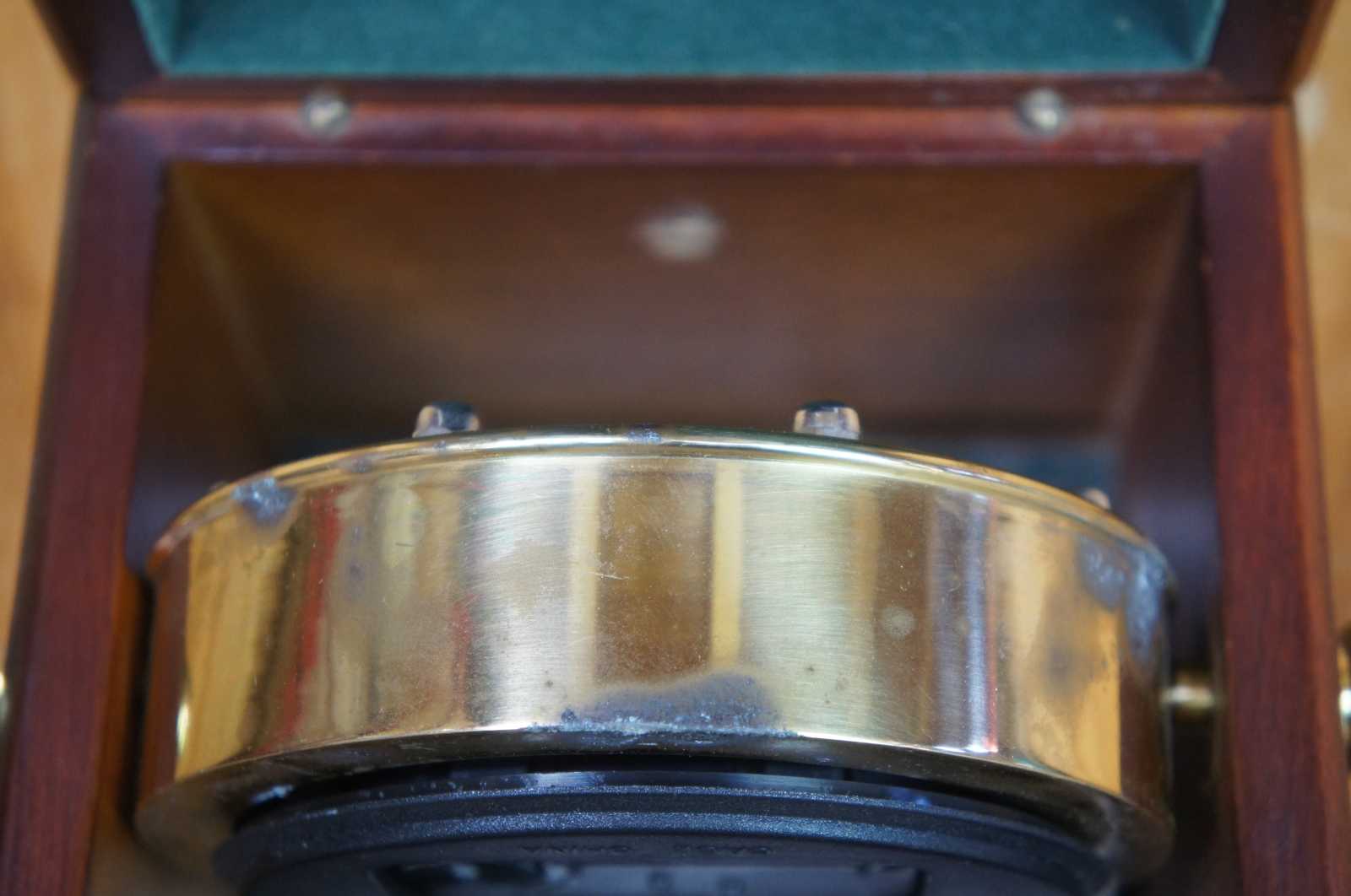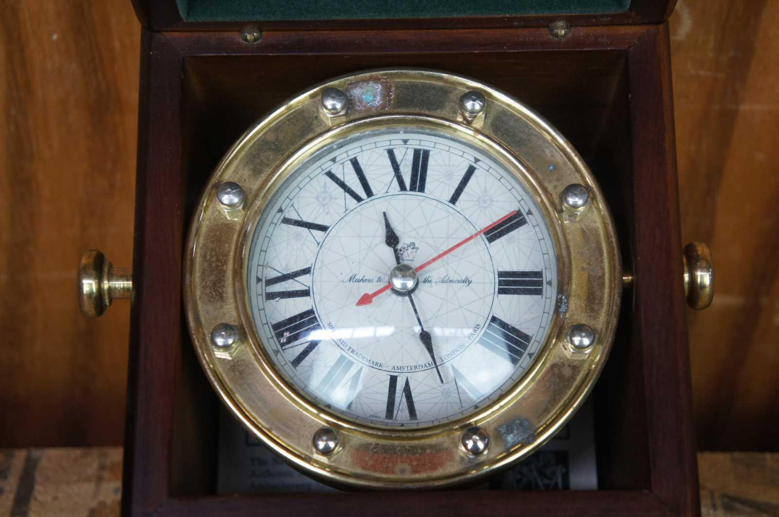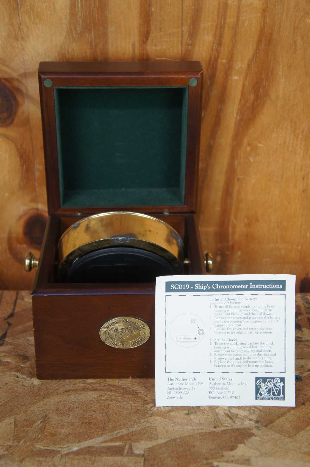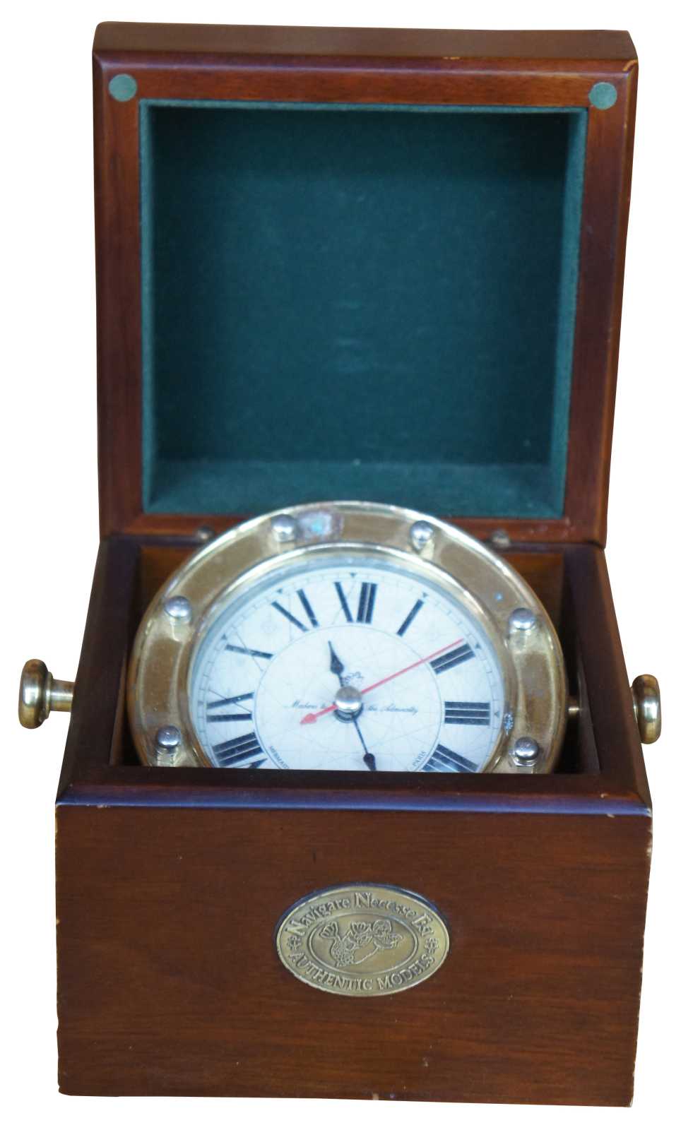 Navigare necesse Est Authentic Models desktop clock, (Amsterdam London Paris), fashioned after an original by the famous London instrument maker, John Poole. The inlaid case is solid wood, mahogany finished with green felt lining. The brass cased clock features Roman numerals and is mounted in concentric rings, called gimbals. Gimbal rings compensated for the pitching and rolling of the ship. Mermaid Trademark, Makers to the Admiralty, Navigare Necesse Est, Authentic Models.