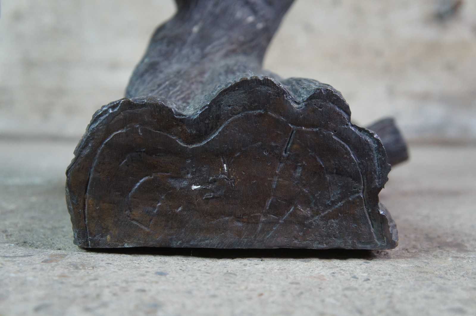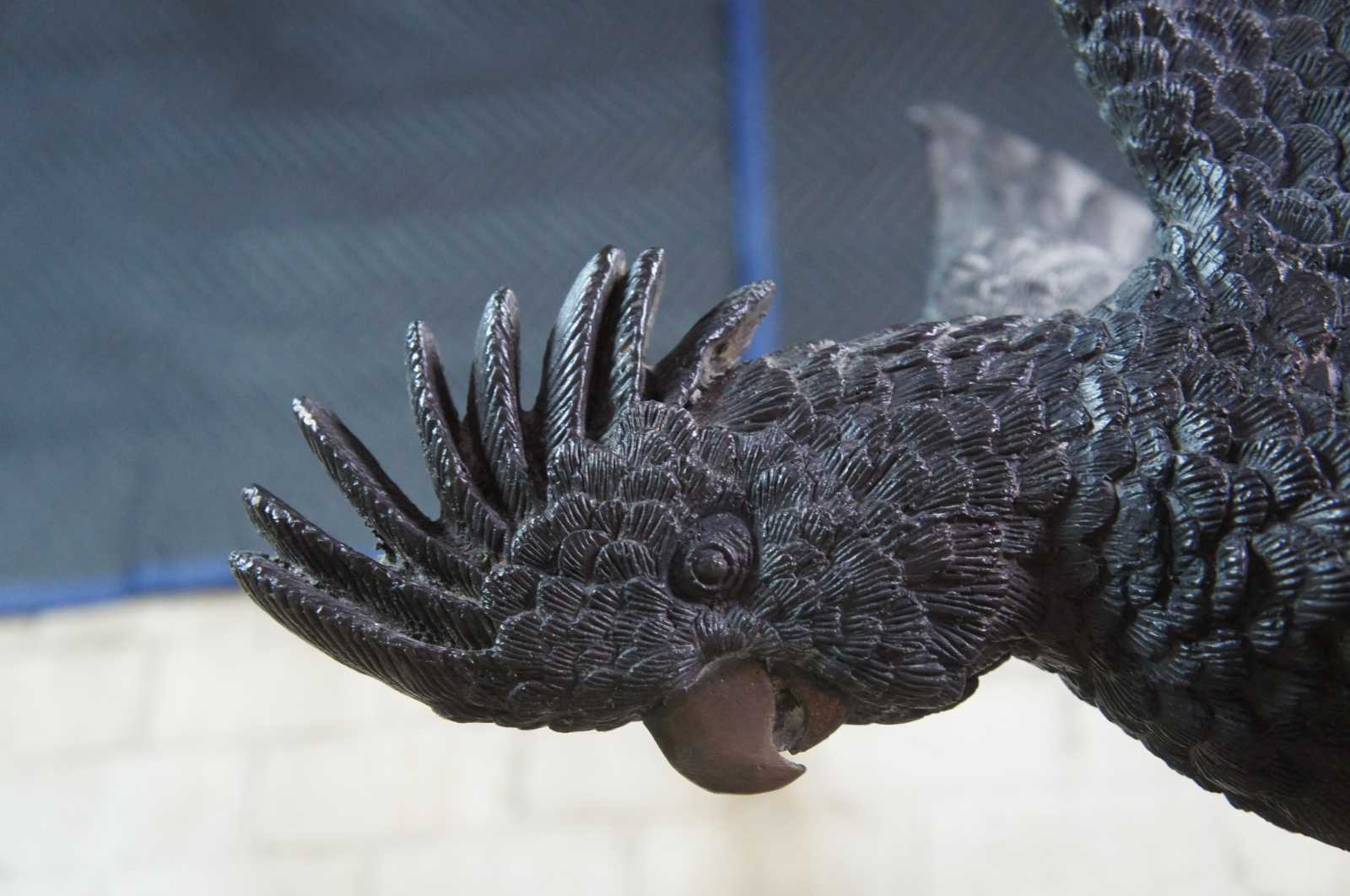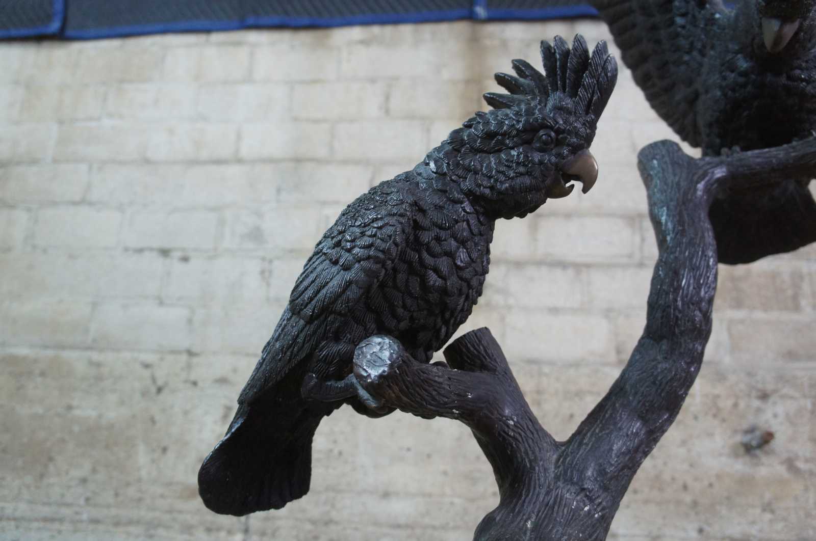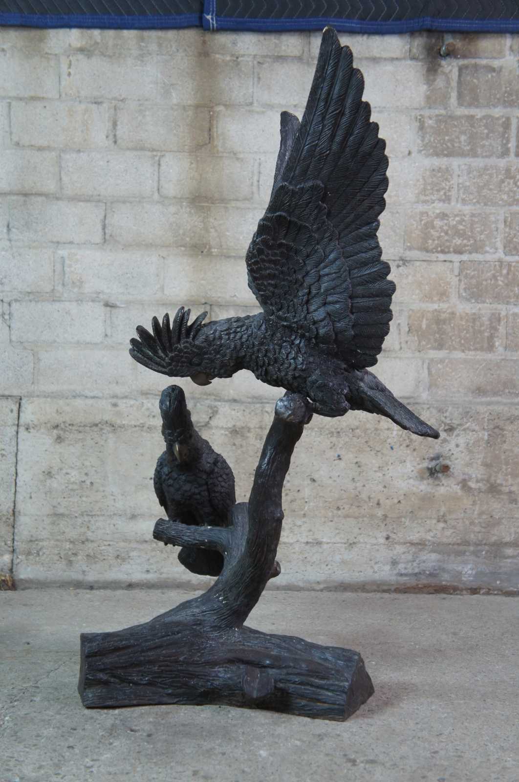 Mid 20th Century French bronze Cockatoos / Parrots or birds. This life size art sculpture features a mated pair perched on a tree branch or log with realistic feathers, beaks and eyes. Made from the "lost wax" casting method. Great for use indoor and outdoor.