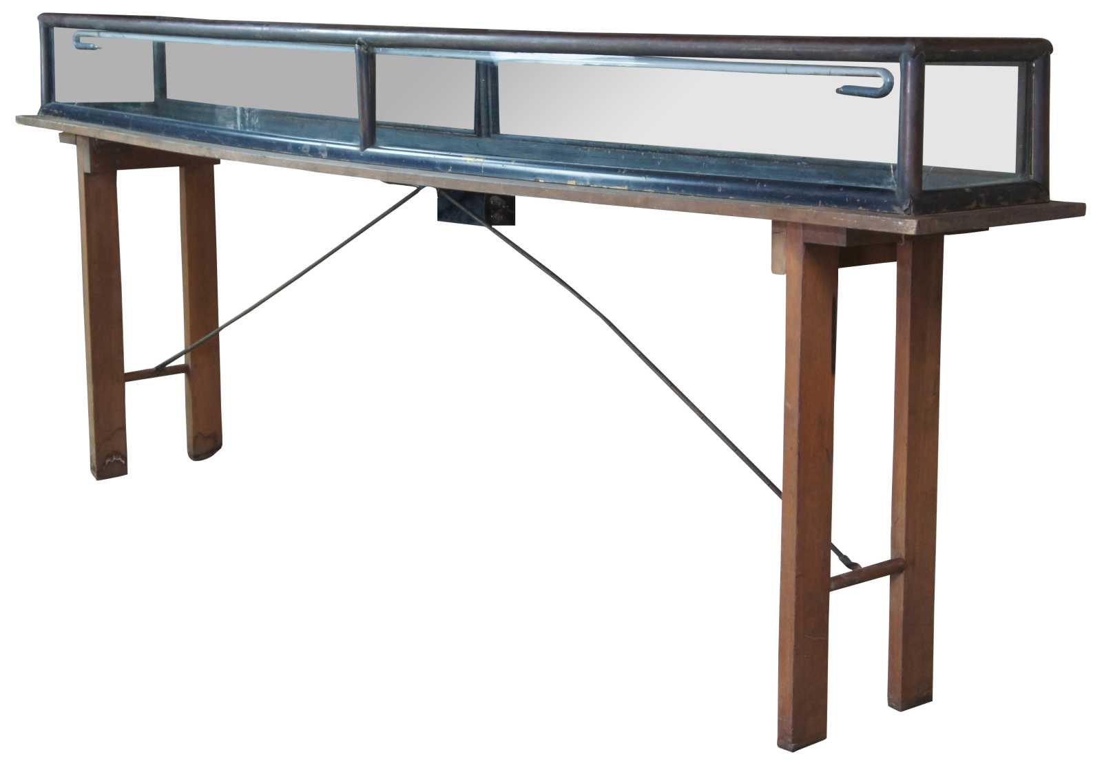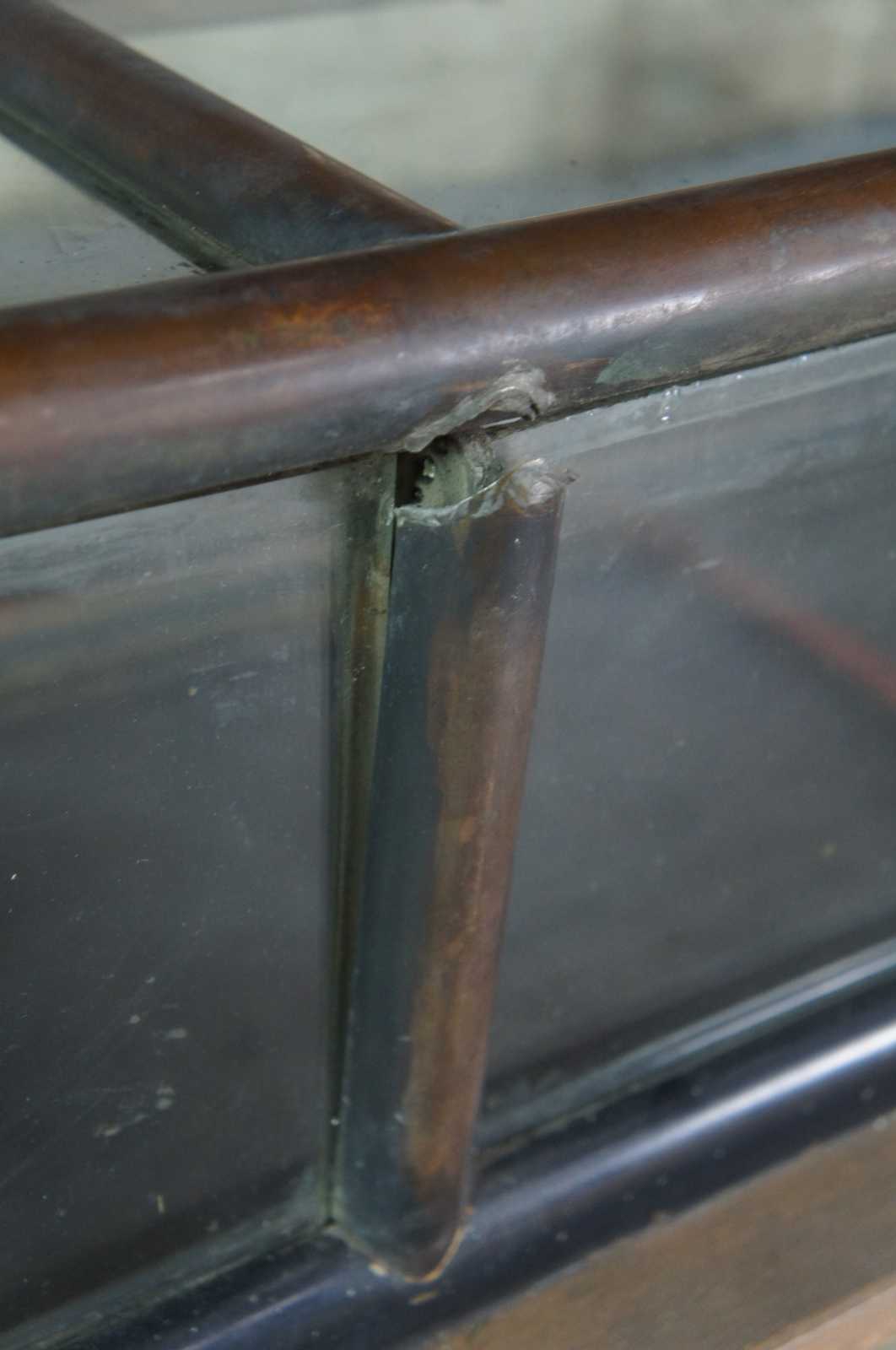 Antique counter top showcase or display cabinet. Made of copper and glass featuring flip up doors and updated fold out campaign base.