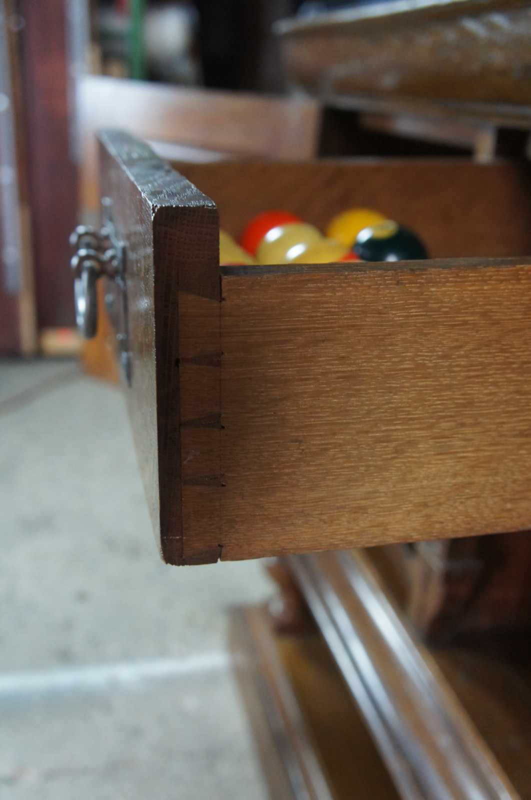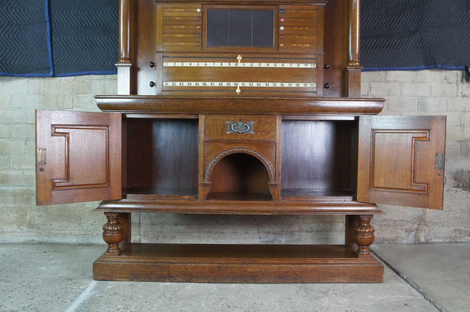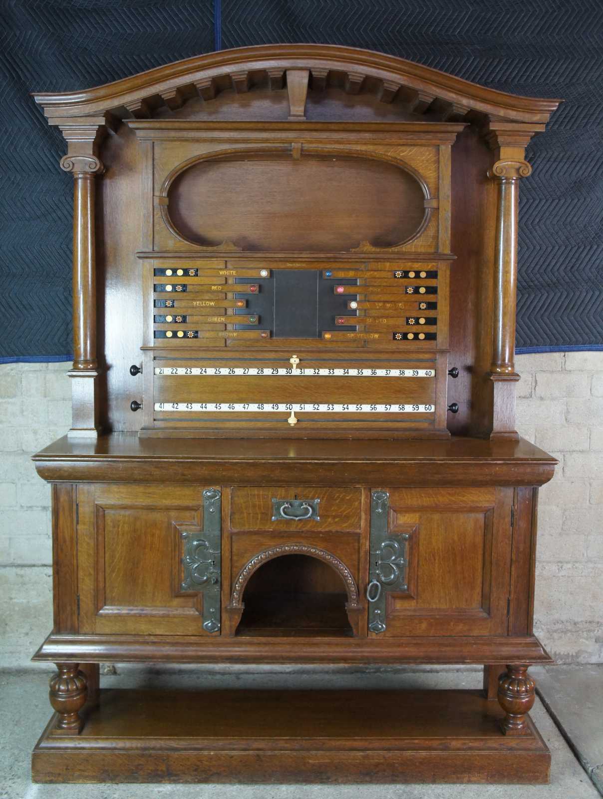 Rare and Impressive antique 19th century Jacobean Revival Orme & Sons billiards / snooker / pool scoreboard. Made of oak featuring domed top with turned posts and locking storage compartments / cabinets / drawers.