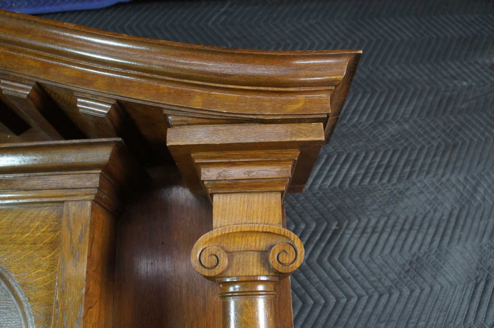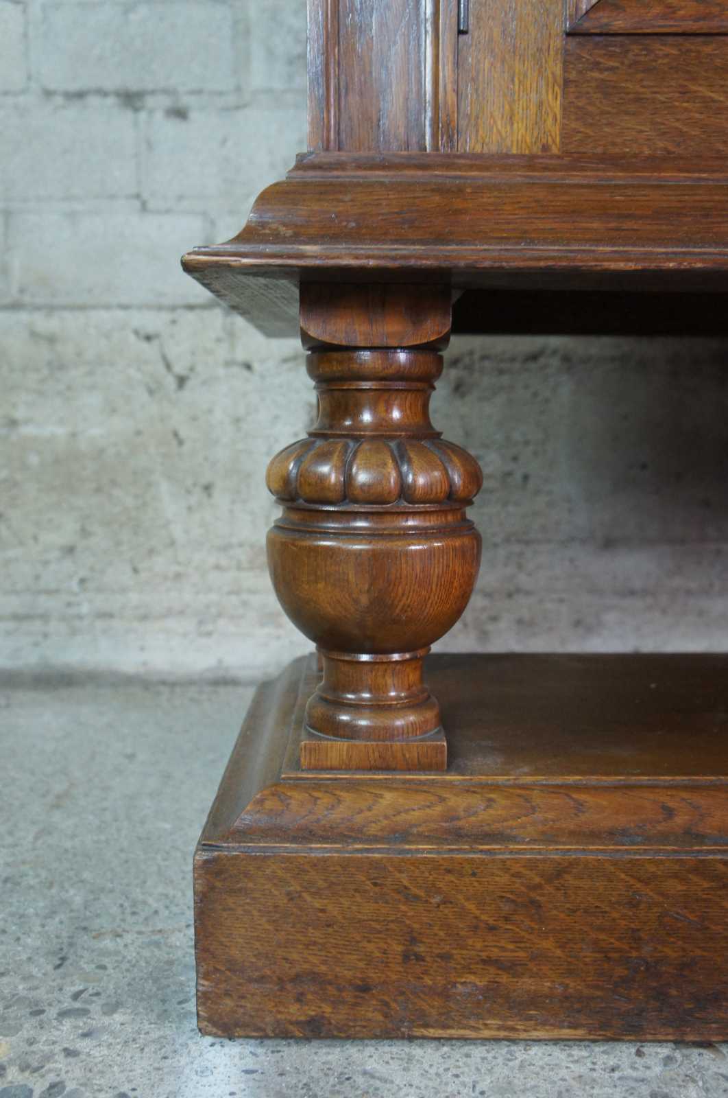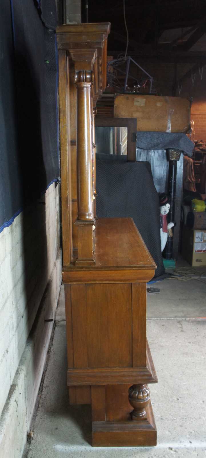 Rare and Impressive antique 19th century Jacobean Revival Orme & Sons billiards / snooker / pool scoreboard. Made of oak featuring domed top with turned posts and locking storage compartments / cabinets / drawers.