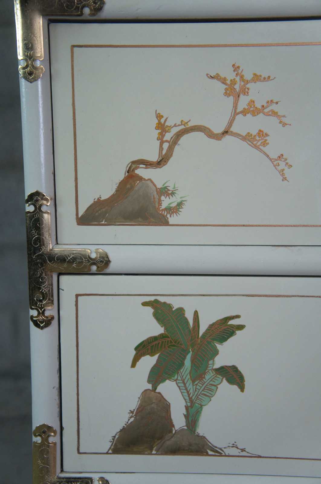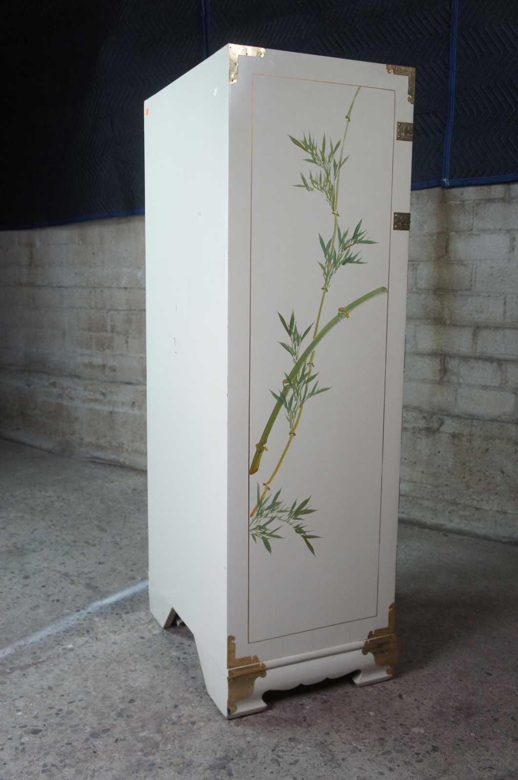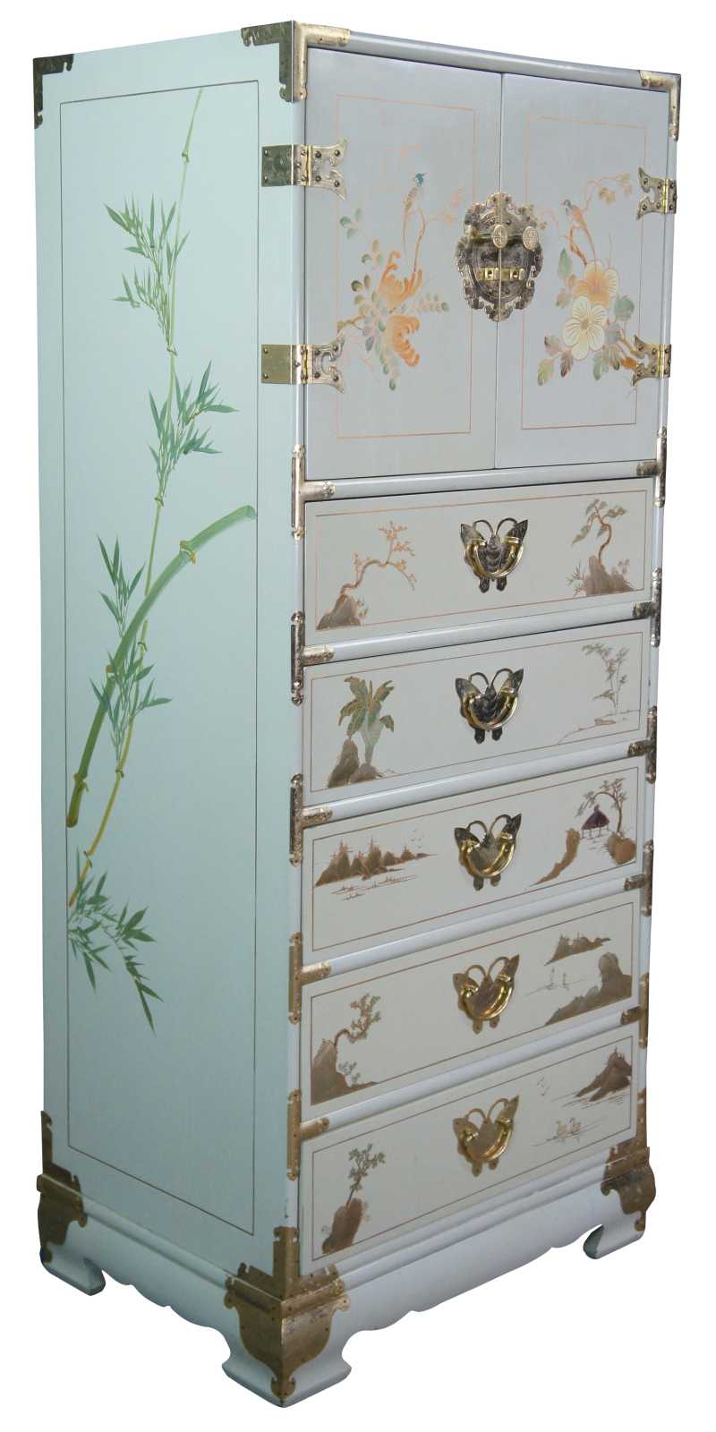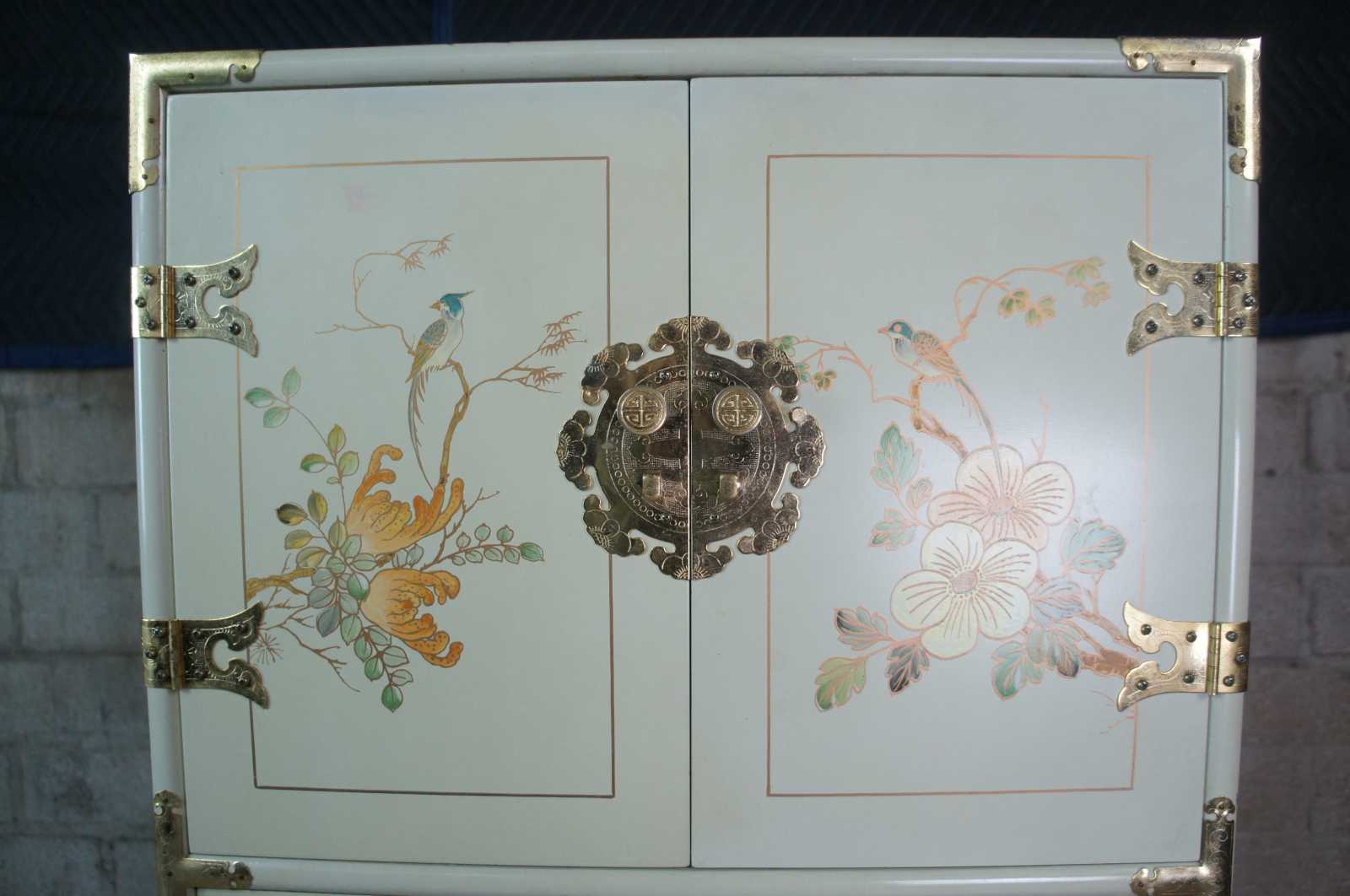 Chinese jewelry armoire, chest or dresser featuring hand painted detail of pagodas, landscapes, birds, and florals with brass banded accents and butterfly pulls. Circa 1st half of 20th century