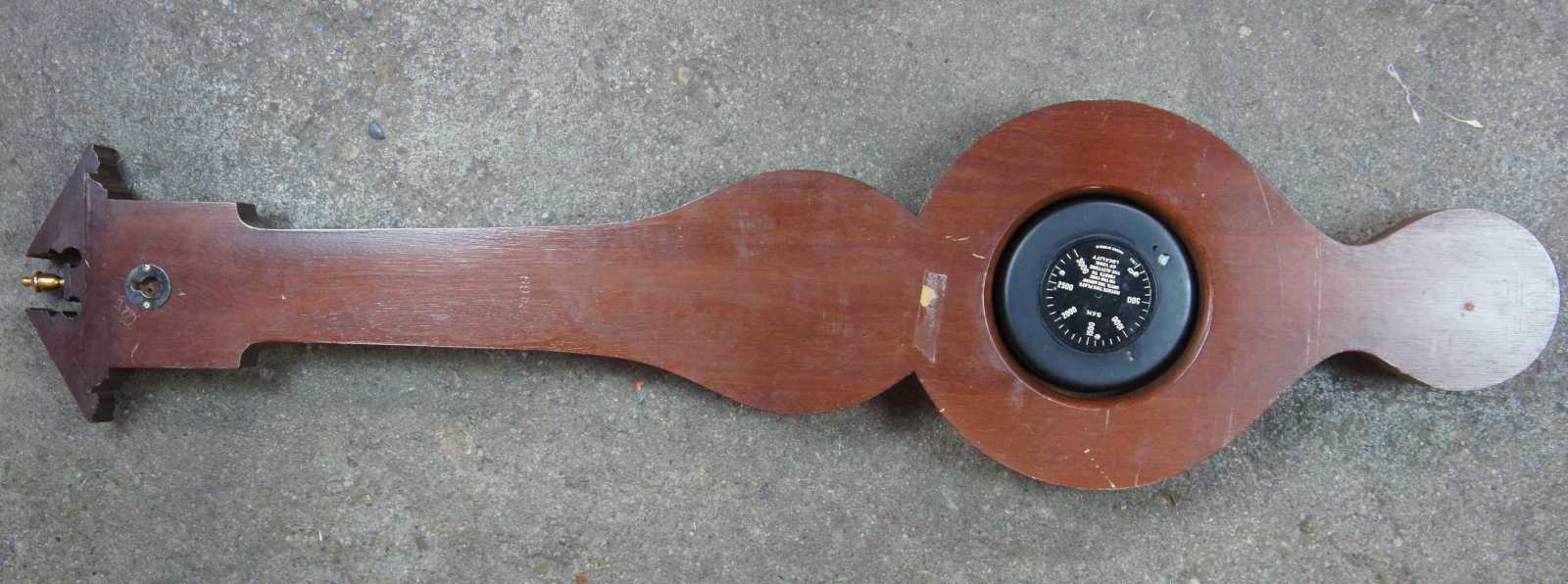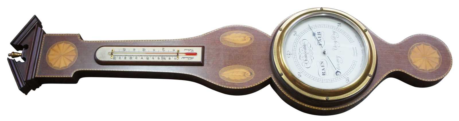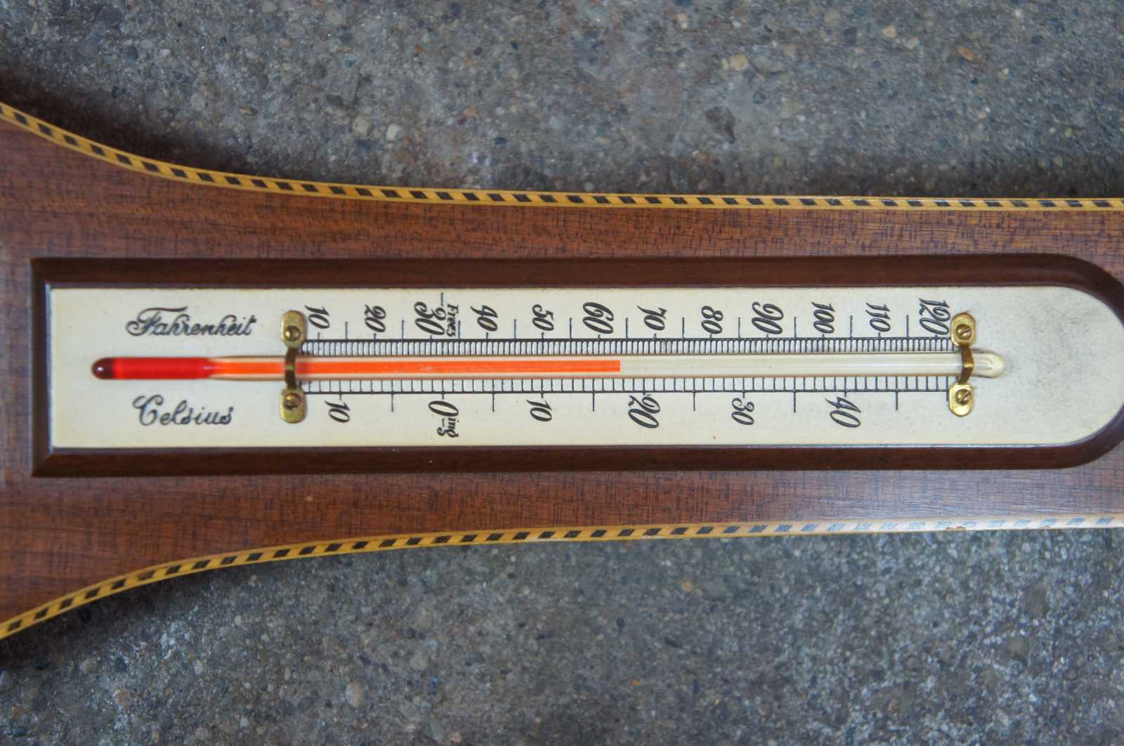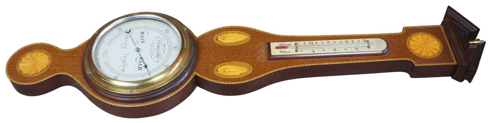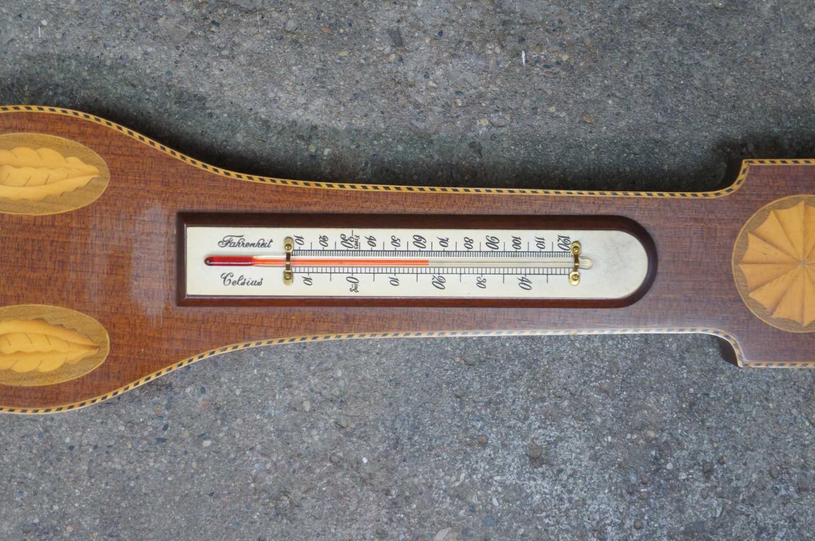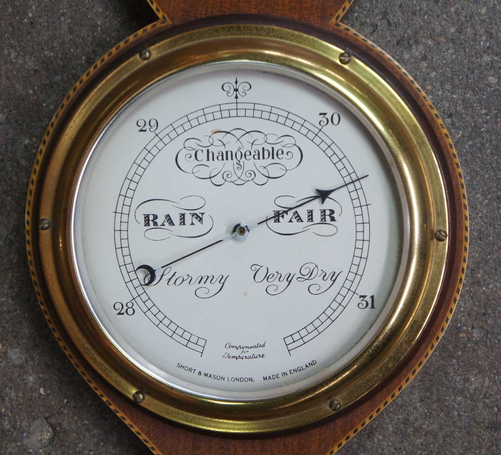 Short & Mason (England) stormoguide wall barometer, circa mid 20th century. Made from Mahogany with marquetry shell inlays. Features a glass face with brass bezel and spirit thermometer.