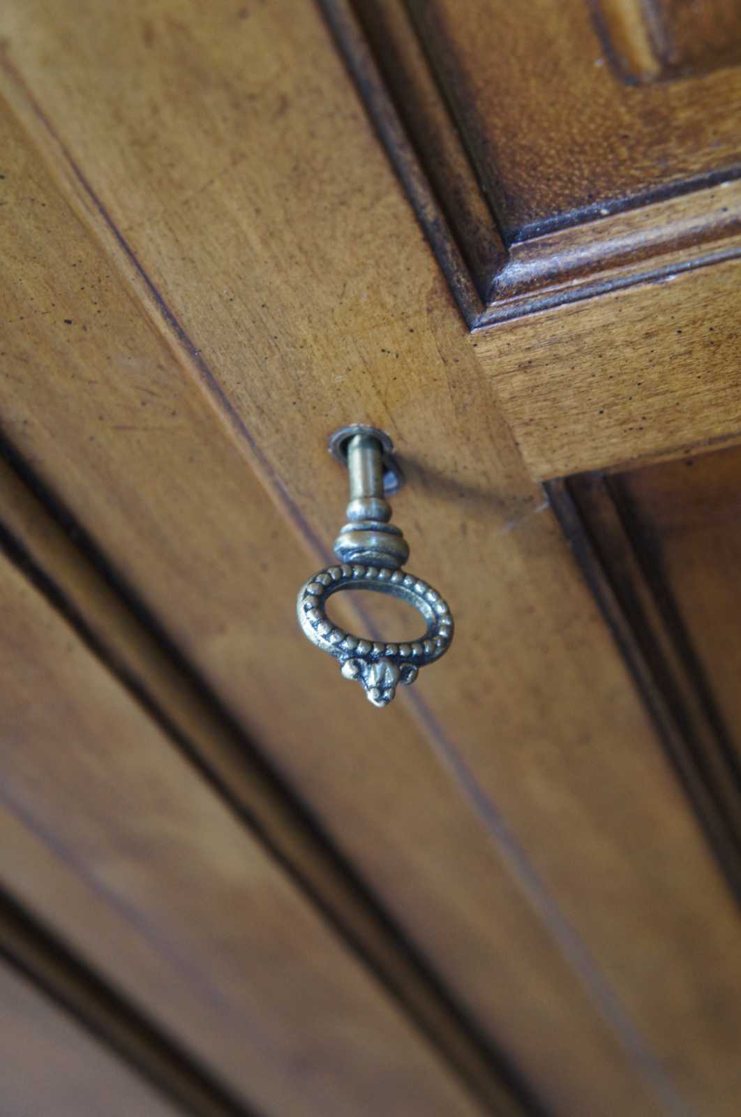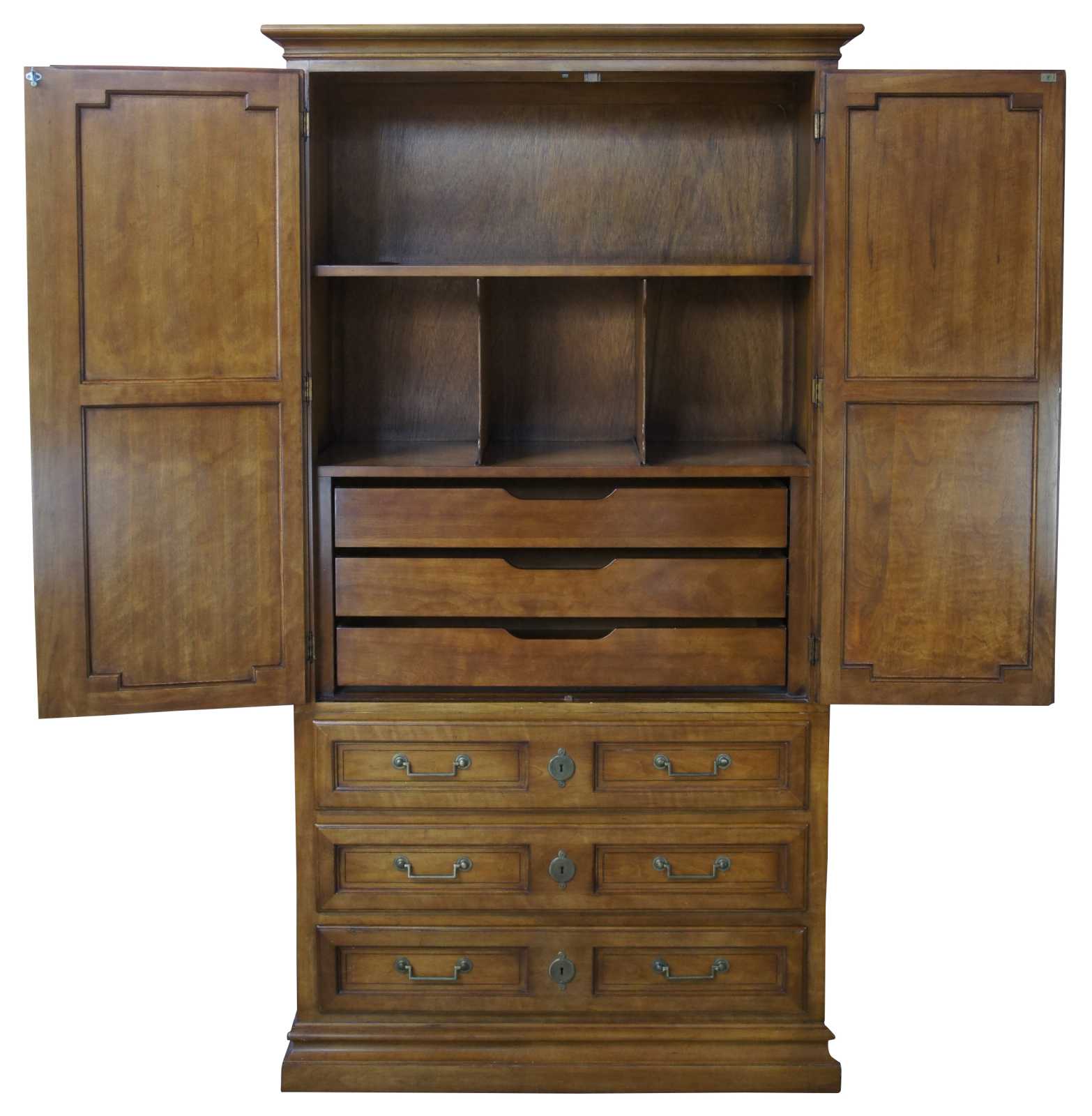 Baker Furniture Milling Road clothing armoire, circa 1980s. Made of naturally distressed walnut featuring six large drawers and four cubbies for garments. Features a beautiful paneled front, French inspired floral carved medallions and neoclassical brass hardware. Includes key for upper cabinet.