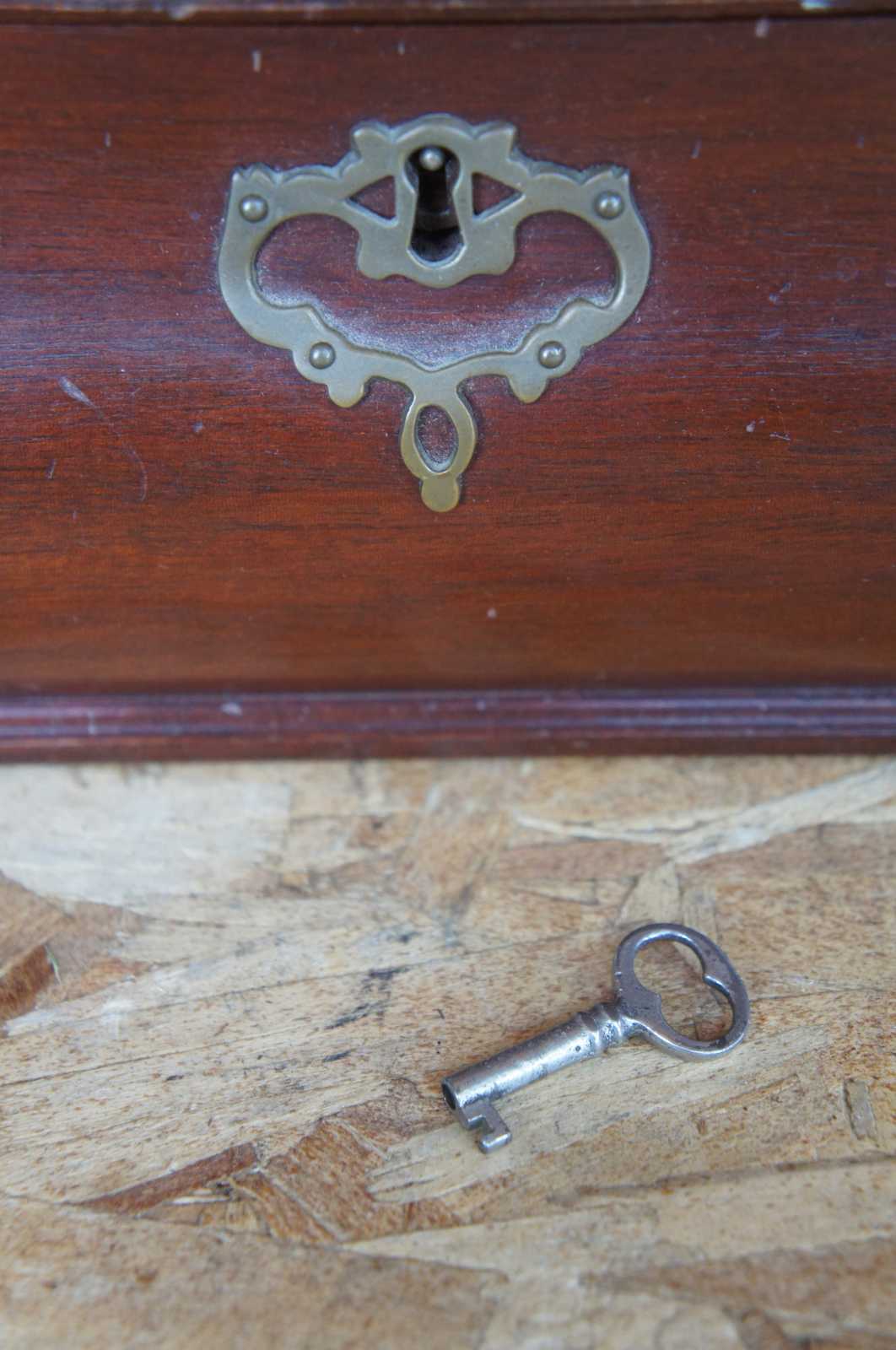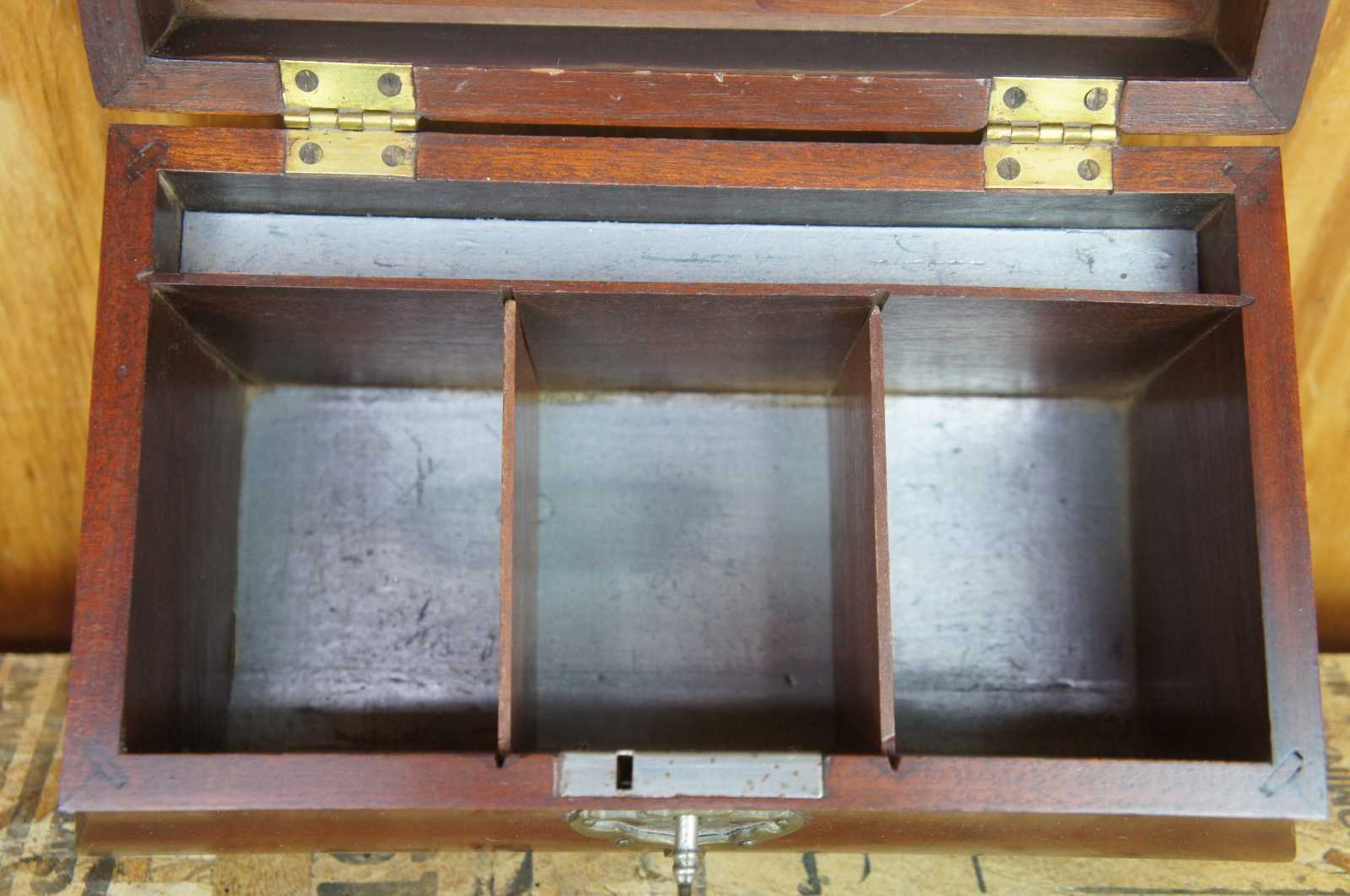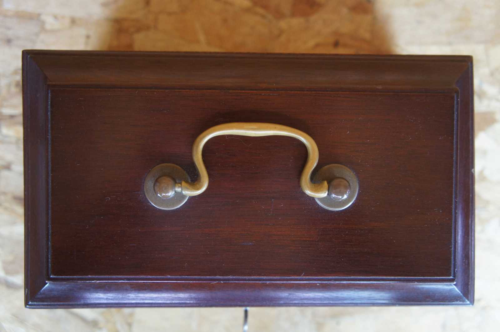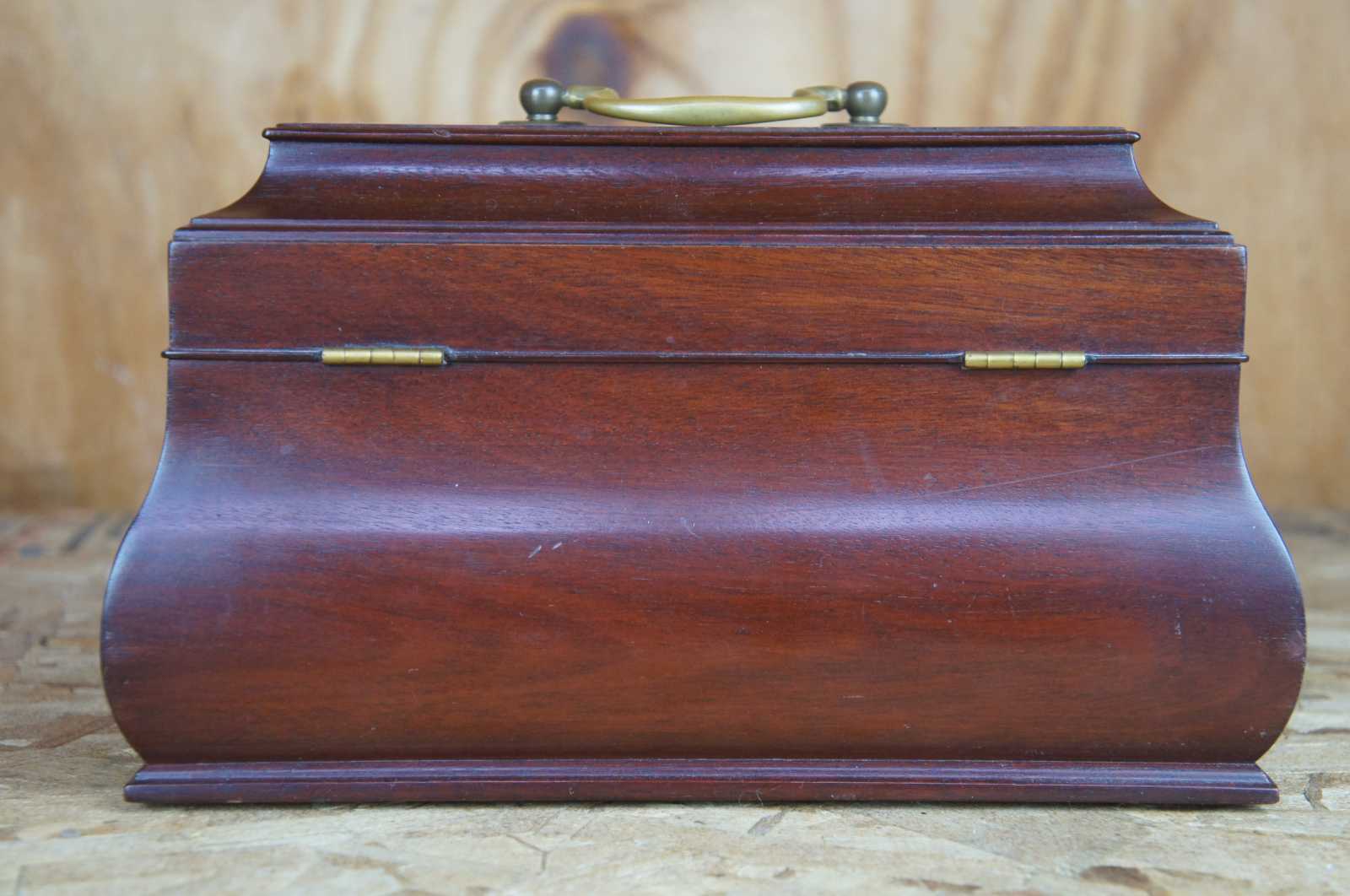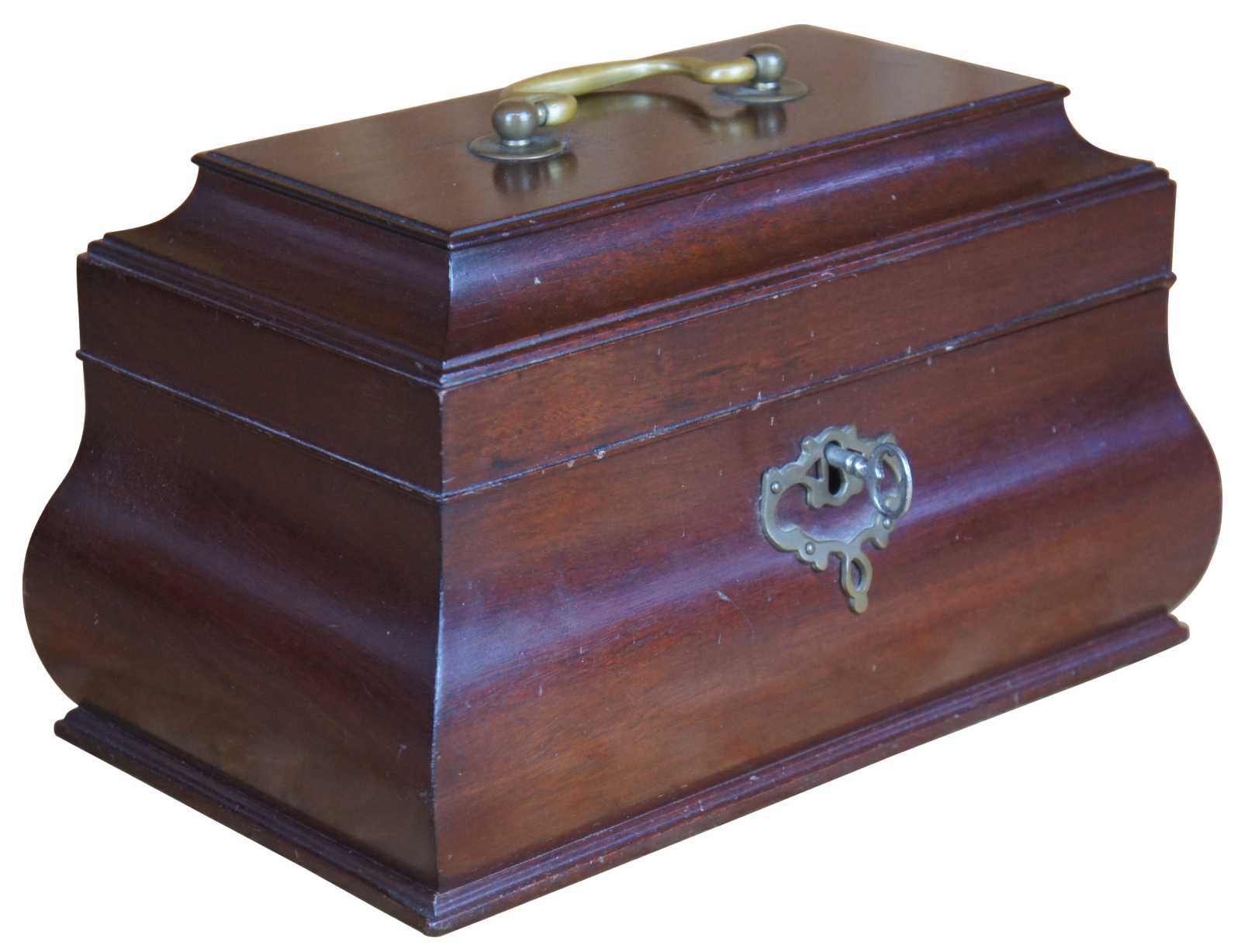 Kittinger solid mahogany tea caddy in bombe form from the Colonial Williamsburg Collection. Features brass handle and escutcheon, fitted interior. Includes key. Marked along underside.