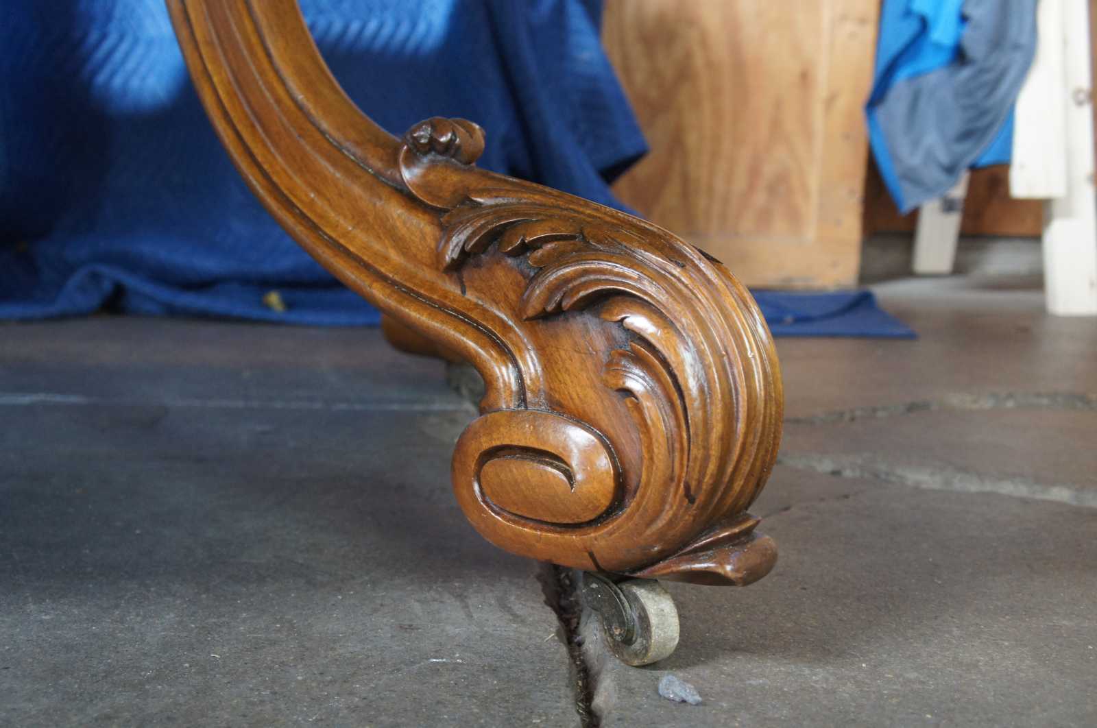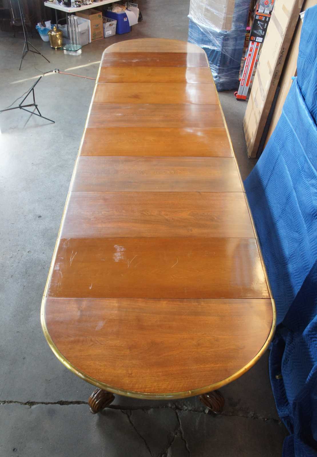A fine and impressive round extendable museum quality conference or dining table, circa 1850s. Made from solid walnut with 3 stage extendable brass banded top Features acanthus scrolled and carved legs as well as casters for ease of opening. The 8 leaves allow it to be used at just about any length between 4.25' and 18.5 feet.