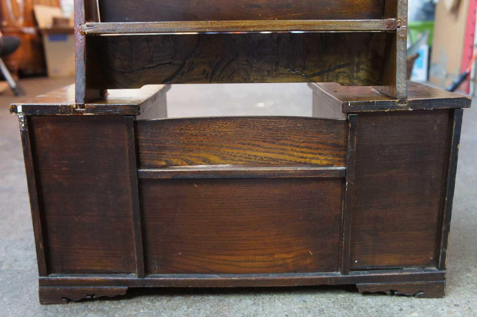 Antique late Meiji Period Japanese Tansu Kyodai or Sanmenkyo. The squat base with drawers is meant to hold cosmetics; coupled with a disproportionately long mirror, the piece is designed to placed on the floor to apply makeup and to style hair while kneeling. Made of burlwood with five lower drawers and large adjustable beveled dressing mirror.