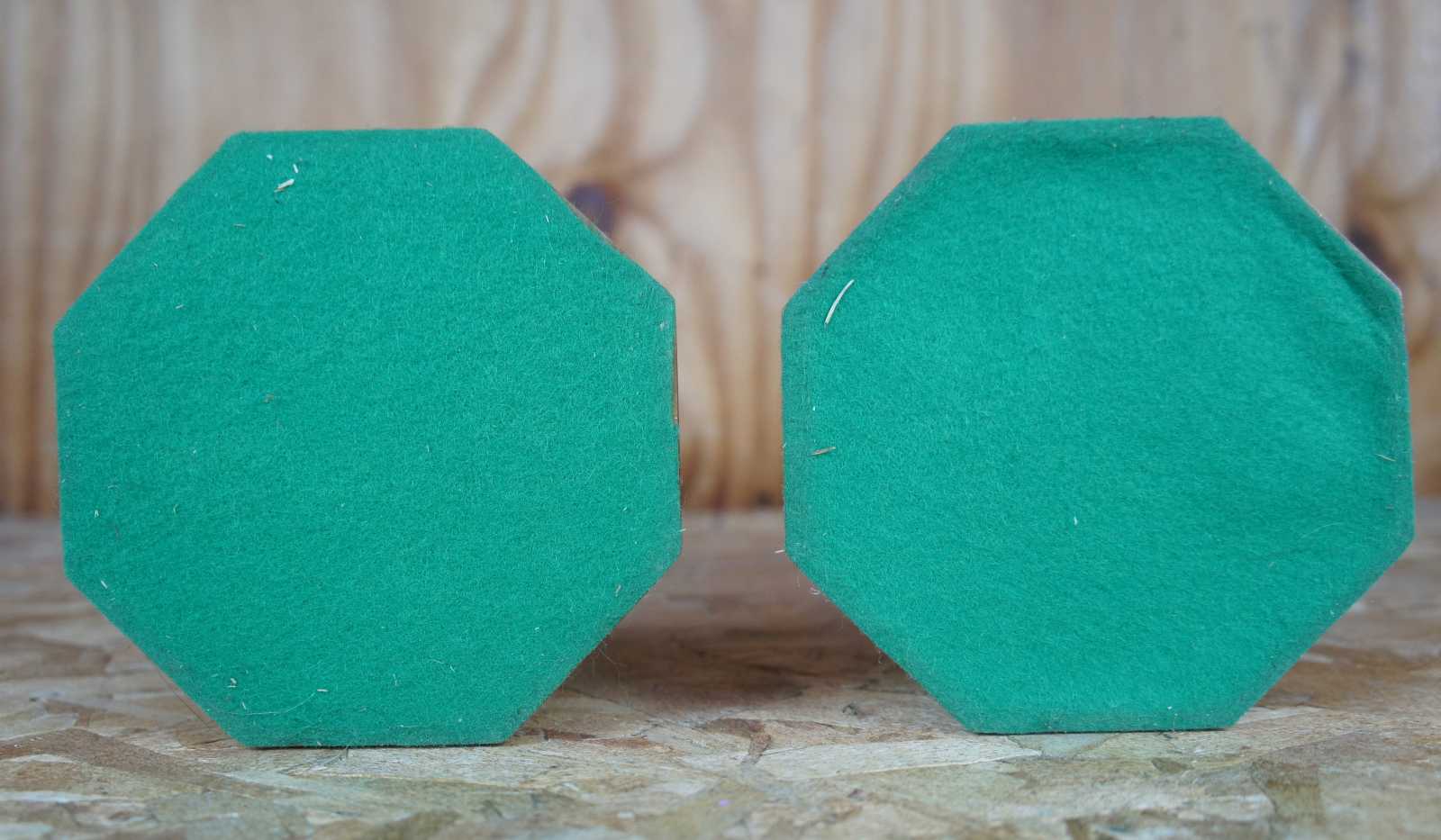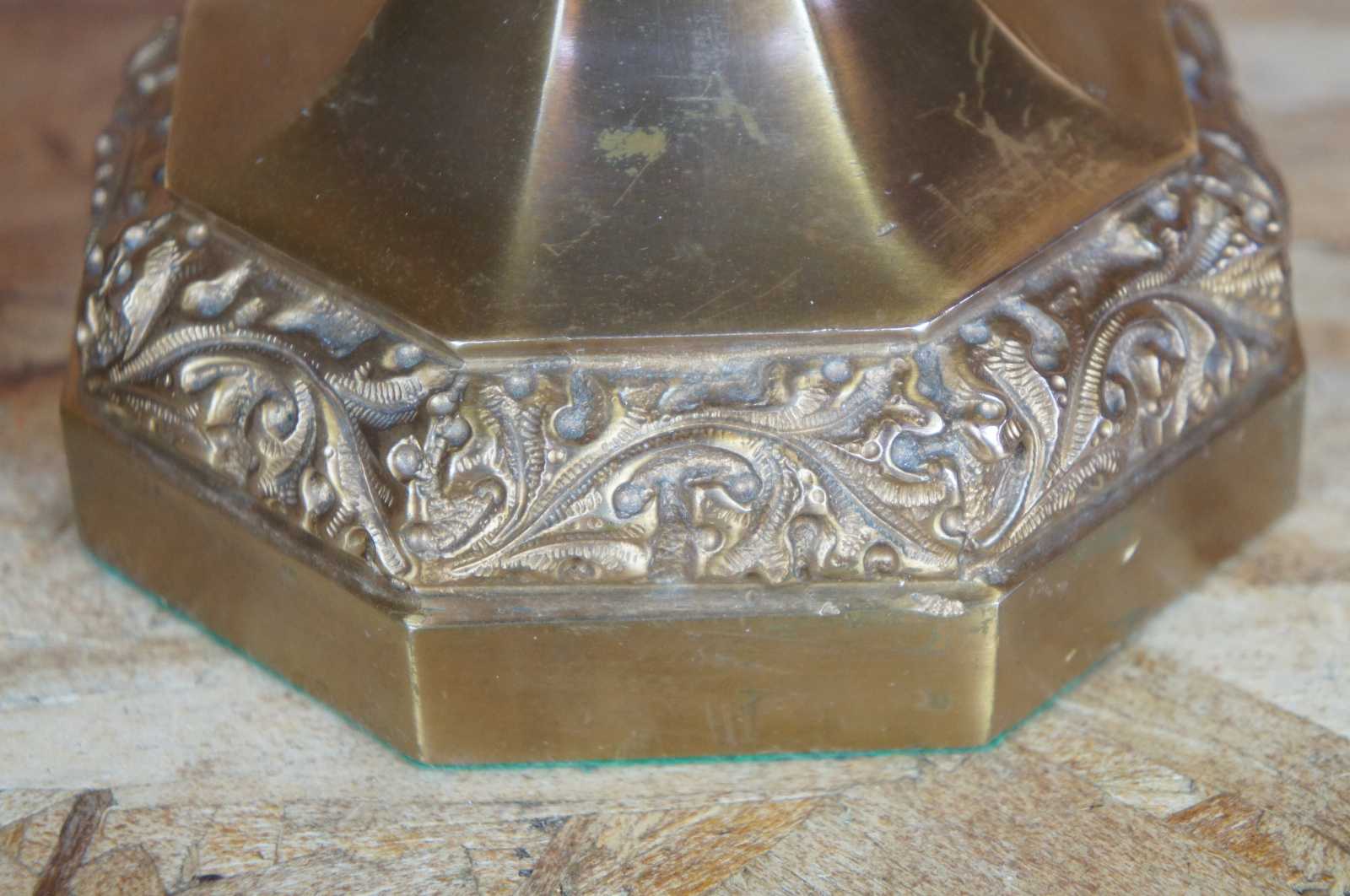 Pair of mid century brass candlesticks featuring octagon and tapered form with embossed acanthus leaves motif.