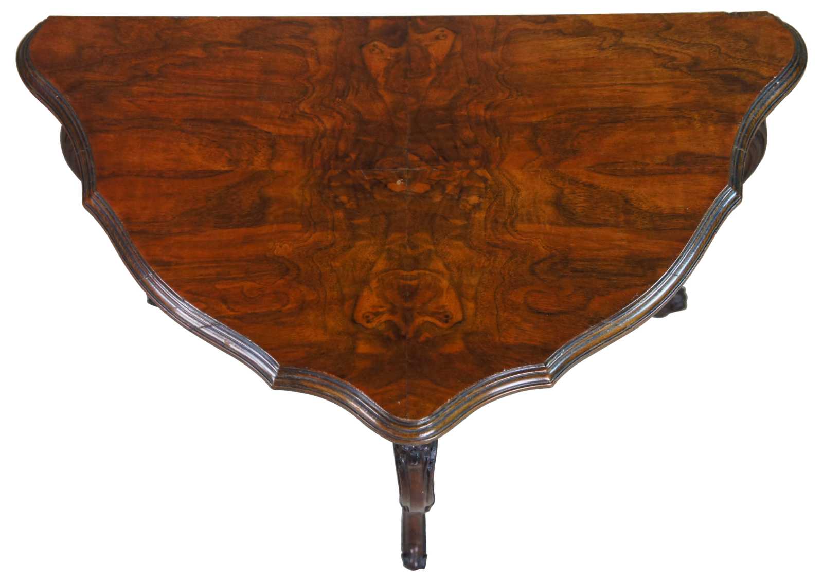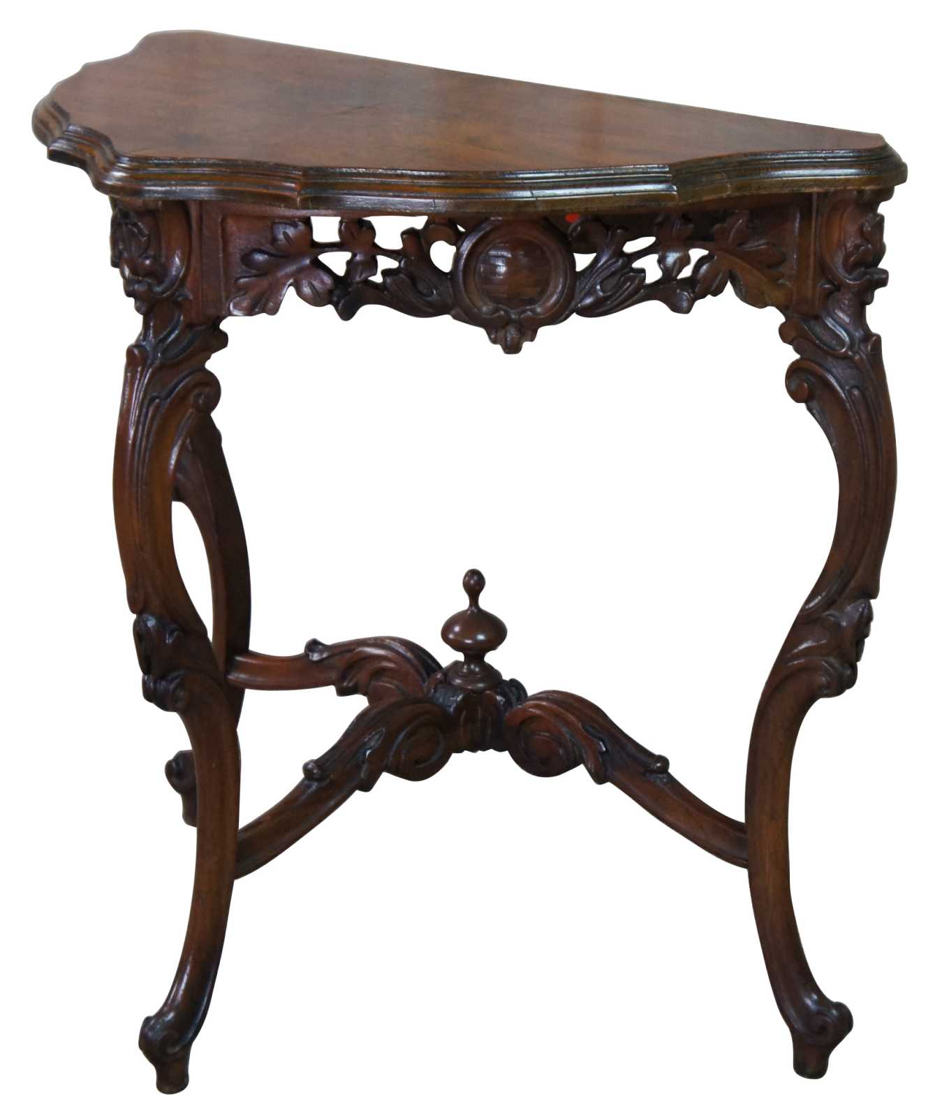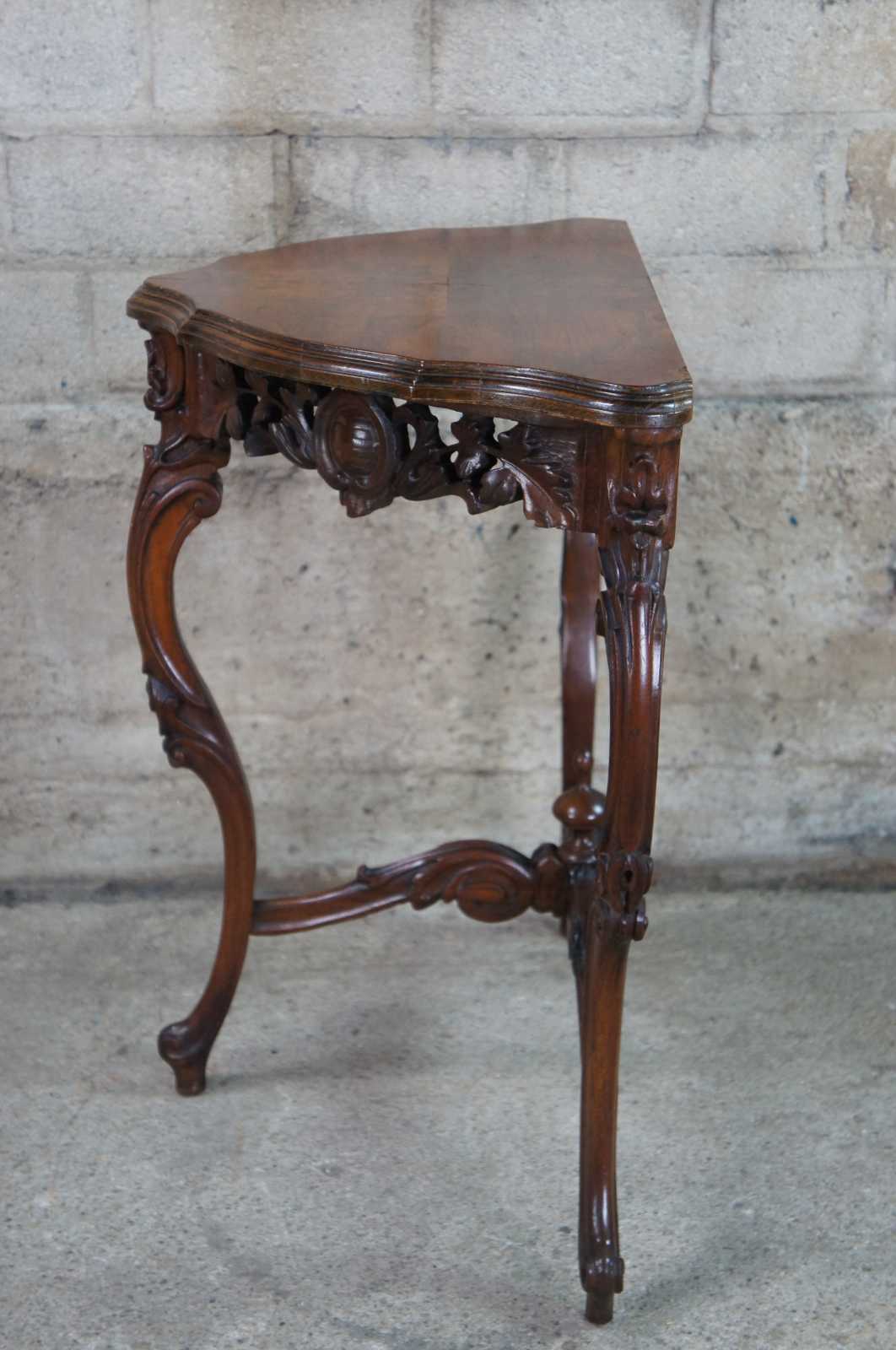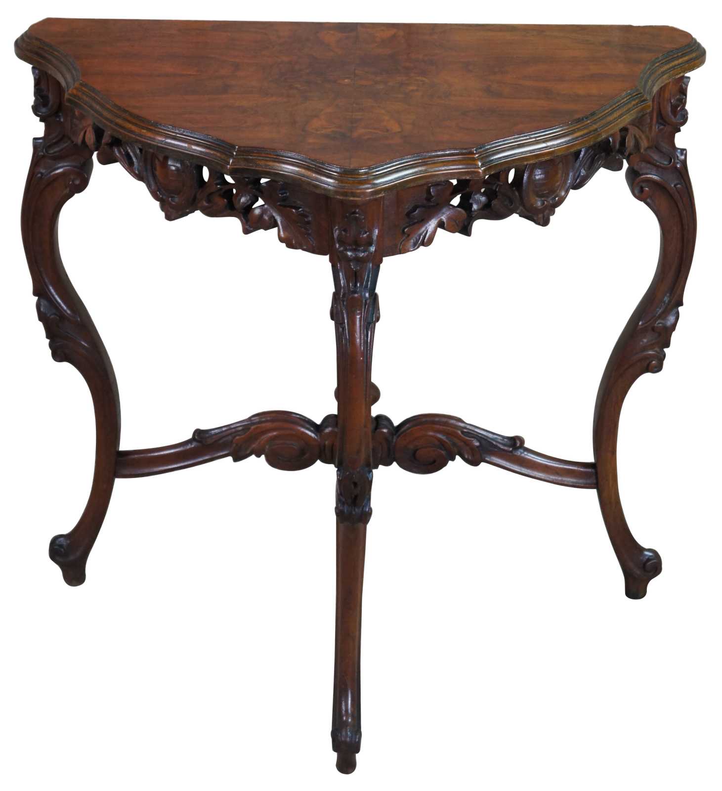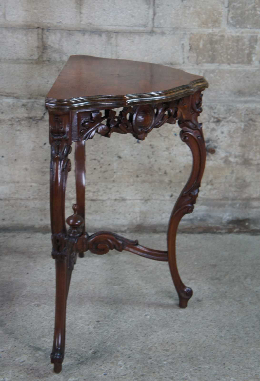 Antique French Baroque or Rococo side console table. Made of burled Walnut featuring triangular form with a pierced apron centered by baroque shields and foliate carvings. The table is supported by three reverse scrolled legs connected by an ornate stretcher with finial.