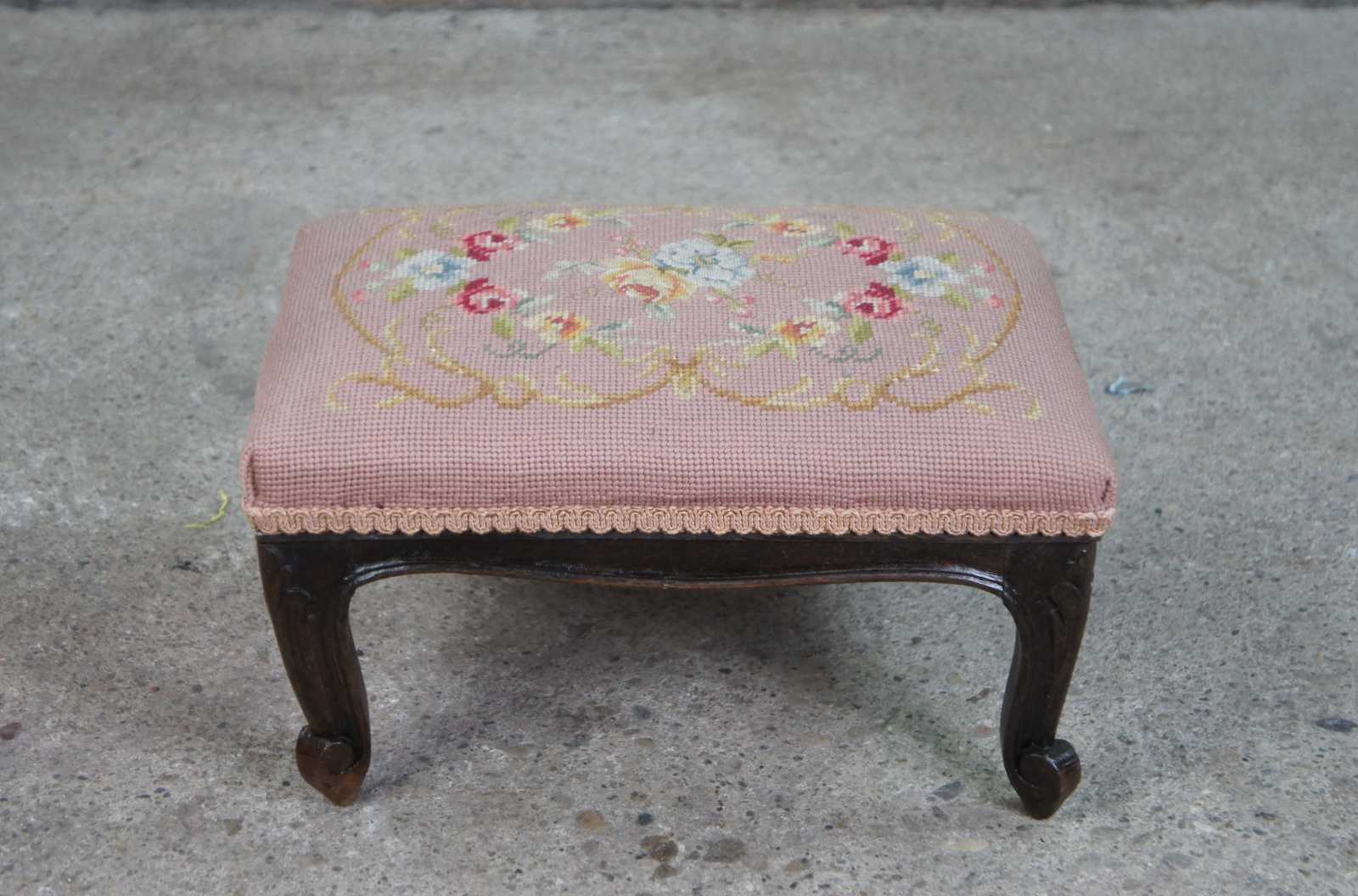 Antique French needlepoint footrest, stool or ottoman. Made of mahogany featuring cabriole legs with a pink floral needlepoint fabric.