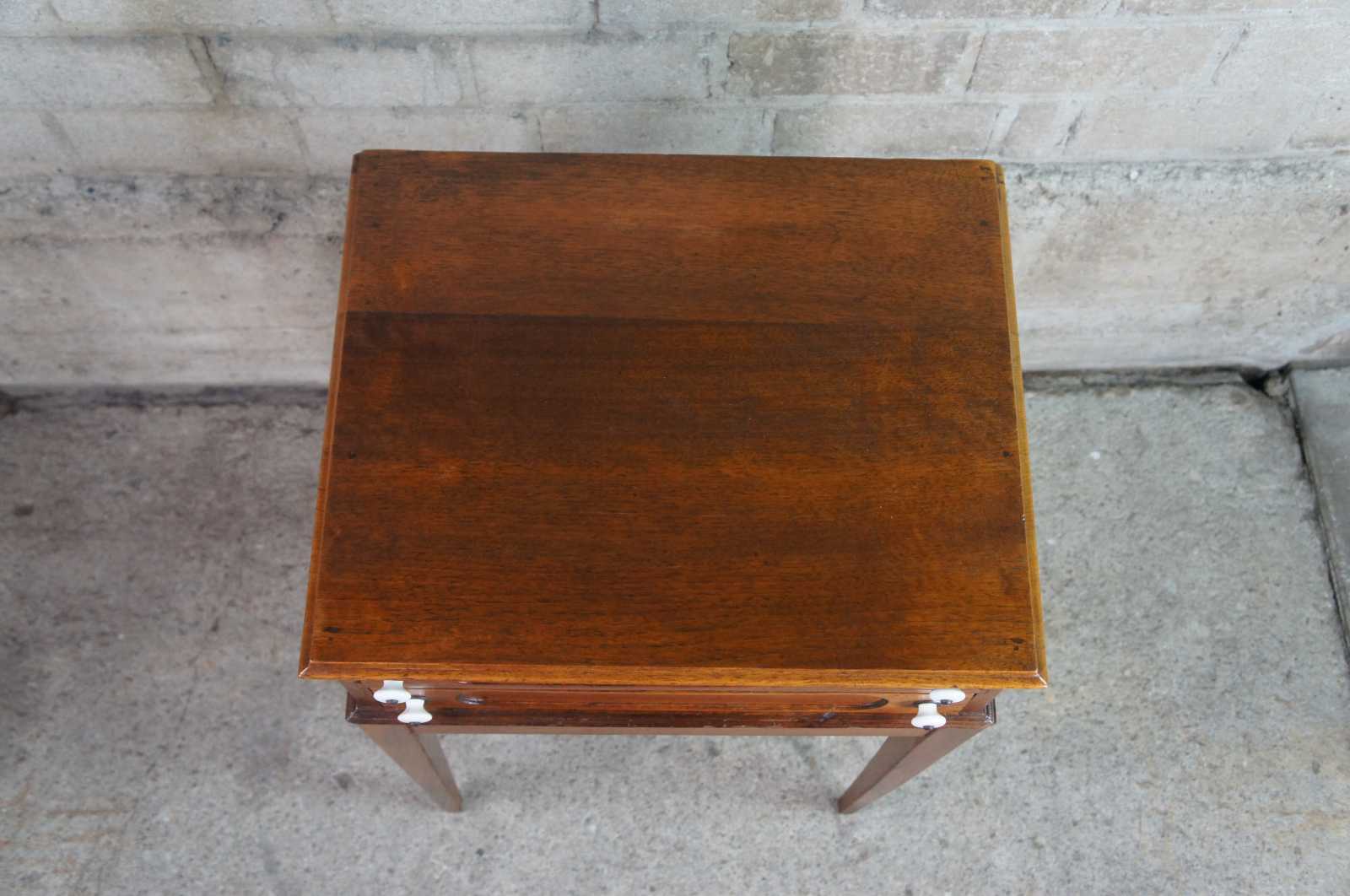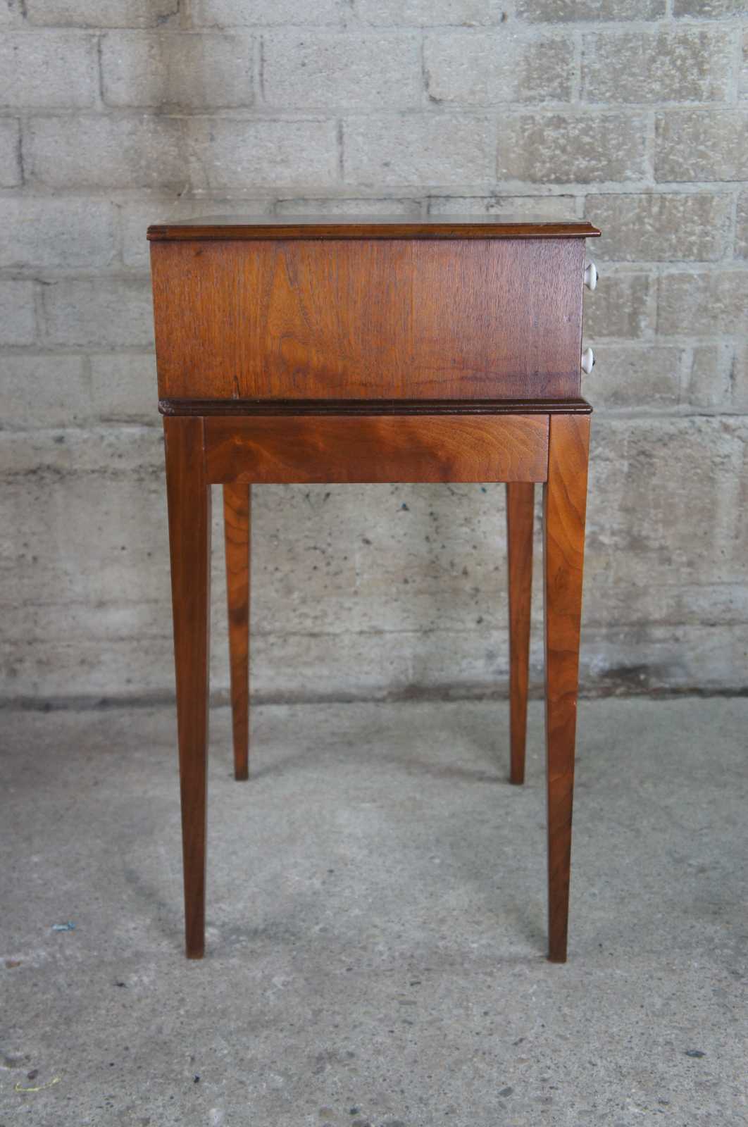 Antique primitive early American spool cabinet side table. Made of walnut featuring two drawers with classic inset paneled fronts and porcelain knobs supported by square tapered legs.